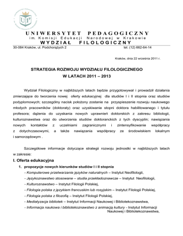 UNIWERSYTET i m. K o m i s j i Edukacji WYDZIAŁ PEDAGOGICZNY Narodowej w Krakowie FILOLOGICZNY 30-084 Kraków, ul. Podchorążych 2 tel. (12) 662-64-14 Kraków, dnia 22 września 2011 r. STRATEGIA ROZWOJU WYDZIAŁU FILOLOGICZNEGO W LATACH 2011 – 2013 Wydział Filologiczny w najbliższych latach będzie przygotowywał i prowadził działania zmierzające do tworzenia nowej oferty edukacyjnej dla studiów I i II stopnia oraz studiów podyplomowych; szczególny nacisk położony zostanie na przyspieszenie rozwoju naukowego młodych pracowników (doktoraty) oraz uzyskiwanie stopni doktora habilitowanego i tytułu profesora; dążenia do uzyskania nowych uprawnień doktorskich z zakresu bibliologii, kulturoznawstwa oraz do utworzenia studiów doktoranckich z tych dyscyplin; nawiązania nowych z kontaktów dotychczasowymi, z a uczelniami także zagranicznymi nawiązania i współpracy zintensyfikowanie ze środowiskiem współpracy lokalnym i samorządowym . Szczegółowe informacje dotyczące strategii rozwoju jednostki w najbliższych latach w zakresie: I. Oferta edukacyjna 1. propozycje nowych kierunków studiów I i II stopnia - Komputerowe przetwarzanie języków naturalnych – Instytut Neofilologii, - Językoznawstwo stosowane – studia przekładoznawcze – Instytut Neofilologii, - Kulturoznawstwo – Instytut Filologii Polskiej, - Filologia polska z językiem francuskim lub rosyjskim – Instytut Filologii Polskiej, - Filologia polska z filozofią – Instytut Filologii Polskiej, - Mediatyzacja bibliotek – Instytut Informacji Naukowej i Bibliotekoznawstwa, - Informacja naukowa i bibliotekoznawstwo z animacją kultury - Instytut Informacji Naukowej i Bibliotekoznawstwa, 2. propozycje nowych studiów podyplomowych: - komunikacja międzykulturowa – Instytut Filologii Polskiej, - komunikacja medialna z kulturoznawstwem – Instytut Filologii Polskiej, - technologiczne aspekty przetwarzania języka naturalnego – Instytut Neofilologii, - antykwarstwo i księgarstwo - Instytut Informacji Naukowej i Bibliotekoznawstwa, - zarządzanie informacją w strukturach lokalnych - Instytut Informacji Naukowej i Bibliotekoznawstwa, - kultura medialna dzieci i młodzieży – Instytut Informacji Naukowej i Bibliotekoznawstwa, 3. propozycja utworzenia ogólnowydziałowej pracowni Gender i Queer Studies II. Rozwój kadry Dyrekcje wszystkich Instytutów intensywnie pracują i pracować będą nad rozwojem kadry naukowej. Instytut Filologii Polskiej W roku 2012 zostanie sfinalizowany przewód doktorski dr Grażyny Badoń (promotor: prof. P. Borek). W toku znajdują się obecnie 2 przewody habilitacyjne: dr Danuta Pluta-Wojciechowska (kolokwium planowane w I połowie 2012 r.); dr Mirosław Michalik (wszczęcie przewodu habilitacyjnego). Istnieją wszelkie podstawy, aby sądzić, iż w najbliższych dwóch latach utrzymany zostanie dotychczasowy, wysoki wskaźnik wszczynanych postępowań habilitacyjnych. Na podstawie stanu zaawansowania prac naukowych można prognozować, że do roku 2013 do kolokwium habilitacyjnego przystąpi większość z grupy pracowników zatrudnionych obecnie na stanowisku adiunkta. Przybliżona kolejność owych awansów powinna kształtować się następująco: dr Sławomir Śniatkowski – 2012; dr Bogusław Gryszkiewicz – 2012; dr Marek Karwala – 2012; dr Anna Ślósarz – 2012; dr Marek Pieniążek – 2012; dr Marta Korendo – 2013; dr Danuta Łazarska – 2013; dr Marceli Olma – 2013; dr Renata Stachura-Lupa – 2013; dr Katarzyna Wądolny-Tatar – 2013; dr Małgorzata Chrobak – 2013 W toku znajdują się trzy postępowania o uzyskanie tytułu naukowego profesora: dr hab. prof. UP Roman Mazurkiewicz (literaturoznawstwo); dr hab. prof. UP Paweł Próchniak (literaturoznawstwo); dr hab. prof. UP Piotr Borek (literaturoznawstwo). Do roku 2013 starania o uzyskanie tytułu naukowego profesora zamierzają podjąć: dr hab. prof. UP Zofia Budrewicz; dr hab. prof. UP Bogusław Skowronek; dr hab. prof. UP Elżbieta Rudnicka – Fira; dr hab. prof. UP Jerzy Waligóra; dr hab. prof. UP Agnieszka Ogonowska; dr hab. prof. UP Maciej Mączyński Prognozowane awanse naukowe w zakresie postępowań habilitacyjnych oraz wniosków o uzyskanie tytułu naukowego profesora winny z nadwyżką uzupełnić ubytki kadrowe w grupie samodzielnych pracowników naukowych, które wynikać będą z przejścia w najbliższych latach kilku osób na emeryturę. Odejścia te nie powinny powodować konieczności zmian w dotychczasowej strukturze jednostki. Instytut Informacji Naukowej i Bibliotekoznawstwa W ostatnich latach Instytut doznał poważnego osłabienia kadrowego. Z różnych powodów odeszło wielu jego zasłużonych pracowników. Straty kadrowe są jednak stopniowo odrabiane. Jak wspomniano wyżej, do pracy w IINiB został przyjęty prof. dr hab. Wiesław Babik. W drodze konkursu zostaną też niebawem obsadzone dwa odtworzeniowe etaty adiunktów. Oczekuje się, że w najbliższej perspektywie ukończone zostaną przewody habilitacyjne dr Barbary Kamińskiej-Czubałowej, dra Alfreda Toczka, dr Ewy Wójcik, a następnie dr Iwony Pietrzkiewicz i dra Michała Rogoża. Instytut Neofilologii W latach 2011- 2013 zostaną sfinalizowane przewody doktorskie: mgr Joanny Albin, mgra Davida Dublanca, mgr Renaty Niziołek, mgr Olgi Nowak, mgra Marcina Sarny, mgr Larisy Mikheevej, mgr Kariny Zając – Haduch. Instytut przewiduje wszczęcie postępowań habilitacyjnych: - specjalność: filologia romańska, język hiszpański, język włoski – dr Marta Cichocka, dr Barbara Cynarska-Chomicka, dr Elżbieta Gajewska, dr Maria Gubińska, dr Alicja Hajok, dr Agnieszka Hennel-Brzozowska, dr Danuta Kwaśna, dr Małgorzata Niziołek, dr Małgorzata Pamuła, dr Nina Pluta, dr Izabela Pozierak – Trybisz, dr Wojciech Prażuch, dr Aleksandra Pronińska, dr Anita Pytlarz, dr Dominique Rougé, dr Alicja Rychlewska – Delimat, dr Mirosław Trybisz - specjalność: filologia angielska – dr Andrzej Kuropat