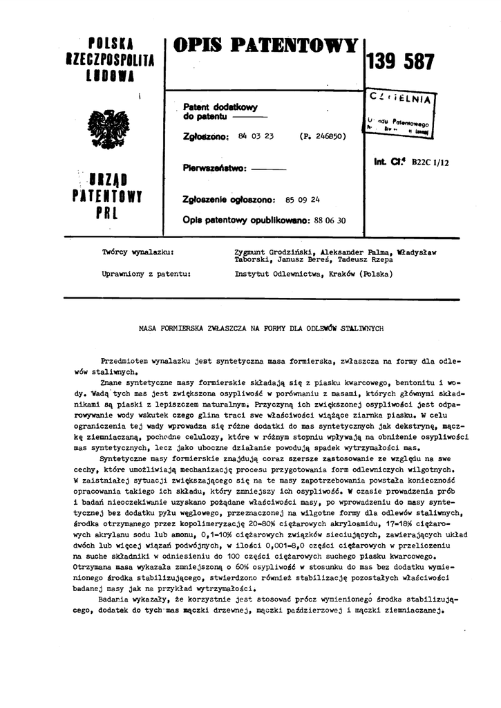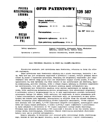 mm IZECZPOSriUIA OPIS PATENTOWY lllllł 139 587 c~ '«£LN/< Patent dodatkowy do patentu —* •* łl WfcX- Zgłoszono: 84 03 23 lwu. (Pi 246850) Illt O.4 B22C 1/12 Pierwszeństwo: BIZM NTEIT8IT PRL Zgłoszenie ogłoszono: 85 09 24 Opis patentowy opublikowano: 88 06 30 Twórcy wynalazku: Zygmunt Grodziński, Aleksander Palma, władysław Uprawniony z patentu: Instytut Odlewnictwa, Kraków (Polska) Taborski, Janusz Bereś, Tadeusz Rzepa MASA FORMIERSKA ZWŁASZCZA NA FORMY DLA ODLEWÓW STALIWNYCH Przedmiotem wynalazku jest syntetyczna masa formierska, zwłaszcza na formy dla odle¬ wów staliwnych. Znane syntetyczne masy formierskie składają się z piasku kwarcowego, bentonitu i wo¬ dy* Vadą tych mas jest zwiększona osypliwość w porównaniu z masami, których głównymi skład¬ nikami są piaski z lepiszczem naturalnym* Przyczyną ich zwiększonej osypliwości jest odpa¬ rowywanie wody wskutek czego glina traci swe właściwości wiążące ziarnka piasku. V celu ograniczenia tej wady wprowadza się różne dodatki do mas syntetycznych Jak dekstrynę, mącz¬ kę ziemniaczaną, pochodne celulozy, które w różnym stopniu wpływają na obniżenie osypliwości mas syntetycznych, lecz jako uboczne działanie powodują spadek wytrzymałości mas. Syntetyczne masy formierskie znajdują coraz szersze zastosowanie ze względu na swe cechy, które umożliwiają mechanizację procesu przygotowania form odlewniczych wilgotnych, V zaistniałej sytuacji zwiększającego się na te masy zapotrzebowania powstała konieczność opracowania takiego ich składu, który zmniejszy ich osypliwość. W czasie prowadzenia prób i badań nieoczekiwanie uzyskano pożądane właściwości masy, po wprowadzeniu do masy synte¬ tycznej bez dodatku pyłu węglowego, przeznaczonej na wilgotne formy dla odlewów staliwnych, środka otrzymanego przez kopolimeryzację 20-80% ciężarowych akryloamidu, 17-18% ciężaro¬ wych akrylanu sodu lub amonu, 0,1-10% ciężarowych związków sieciujących, zawierających układ dwóch lub więcej wiązań podwójnych, w ilości 0,001-8,0 części ciężarowych w przeliczeniu na suche składniki w odniesieniu do 100 części ciężarowych suchego piasku kwarcowego. Otrzymana masa wykazała zmniejszoną o 60% osypliwość w stosunku do mas bez dodatku wymie¬ nionego środka stabilizującego, stwierdzono również stabilizację pozostałych właściwości badanej masy jak na przykład wytrzymałości. Badania wykazały, że korzystnie jest stosować prócz wymienionego środka stabilizujଠcego, dodatek do tych"mas mączki drzewnej, mączki paździerzowej i mączki ziemniaczanej. 159 587 Przykłady składu nasy formierskiej według wynalazku: Przykład I. piasek kwarcowy 100 części ciężarowych bentonit 8 części ciężarowych środek stabilizujący 3 części ciężarowe woda 3fO-5,5 części ciężarowych Przykład II* 100 części ciężarowych piasek kwarcowy bentonit 8 części ciężarowych środek stabilizujący mączka ziemniaczana 2 części ciężarowe 1 część ciężarowa 3,0-5*0 części ciężarowych woda Przykład III. piasek kwarcowy i i / 100 części ciężarowych bentonit 8 części ciężarowych 1 część ciężarowa 0f5 części ciężarowej 0,5 części ciężarowej 3fO-5,0 części ciężarowych środek stabilizujący mączka pafdzierzowa mączka drzewna woda Zastrzeżenia patentowe 1. Masa formierska zwłaszcza na formy dla odlewów staliwnych, sporządzona na osnowie piasku kwarcowego, zawierająca bentonit, znamienna tym, że zawiera środek stabilizujący wilgoć w ilości 0,001-8,0 części ciężarowych w przeliczeniu na suche skład¬ niki w odniesieniu do 100 części ciężarowych suchego piasku kwarcowego, przy czym środek stabilizujący wilgoć jest produktem kopolimeryzacji 20-8096 ciężarowych akryloamidu, 17-18% ciężarowych akrylanu sodu lub amonu, 0,1-10% ciężarowych związków sieciujących zawierajଠcych układ dwóch lub więcej wiązań podwójnych, 2. Masa formierska według zastrzi 1, znamienna tym, że zawiera mączkę ziemniaczaną w ilości 1 część ciężarowa lub mączkę paździerzową i drzewną w ilości po 0,5 części ciężarowych w przeliczeniu na suche składniki, w odniesieniu do 100 części cię¬ żarowych suchego piasku kwarcowego* Pracownia Poligraficzna UP PRL. Nakład 100 egz. Cena 130 zł