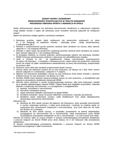 Załącznik nr 1 do Zarządzenia Dyrektora MOSiR nr 28/2013 z dnia 14 sierpnia 2013 r. ZASADY NAJMU I DZIERŻAWY NIERUCHOMOŚCI POZOSTAJĄCYCH W TRAŁYM ZARZĄDZIE MIEJSKIEGO OŚRODKA SPORTU I REKREACJI W OPOLU Osoby zainteresowane najmem lub dzierżawą nieruchomości określonych w załączonych wykazach mogą składać wnioski o najem lub dzierżawę (wzór wniosków stanowią załączniki do niniejszych zasad).* Najem lub dzierżawa nastąpi zgodnie z poniższymi zasadami: 1. Dzierżawa gruntów, najem lokali użytkowych lub powierzchni użytkowych na okres do 3 lat następuje na podstawie wniosku złożonego przez osobę zainteresowaną, z zastrzeżeniem pkt 5. 2. Wniosek o wydzierżawienie gruntu powinien zawierać dane określone we wzorze, który stanowi załącznik nr 1 do niniejszej informacji. 3. Wniosek o najem lokalu lub powierzchni użytkowej powinien zawierać dane określone we wzorze, który stanowi załącznik nr 2 do niniejszej informacji. 4. W przypadku działania na wniosek podmiotu zainteresowanego najmem lub dzierżawą, Dyrektor MOSiR informuje zainteresowany podmiot o odrzuceniu lub zakwalifikowaniu wniosku. 5. Jeżeli w terminie 21 dni od opublikowania wykazu nieruchomości przeznaczonych do najmu lub dzierżawy, z wnioskiem o dzierżawę gruntu, najem lokalu lub powierzchni użytkowej zwróci się więcej niż jeden wnioskodawca zainteresowany tą samą nieruchomością, przeprowadza się konkurs ofert. 6. Kryterium oceny ofert jest wysokość proponowanej stawki czynszu. 7. Umowę najmu lub dzierżawy zawiera się na czas oznaczony, nie dłuższy niż 3 lata. Wzór umowy stanowi załącznik nr 3 (dzierżawa) i załącznik nr 4 (najem). 8. Najemca lub Dzierżawca posiadający umowę na czas oznaczony może złożyć wniosek o zawarcie kolejnej umowy na czas oznaczony, nie dłuższy niż 3 lata. 9. Dyrektor MOSiR może odmówić zawarcia kolejnej umowy na czas oznaczony, w szczególności gdy zagraża to prowadzeniu działalności statutowej MOSiR. 10. Warunki umów zawartych w wyniku przeprowadzonego konkursu, albo poza konkursem, określa się w sposób zabezpieczający interesy MOSiR i Miasta Opola pod względem przychodów, należytej dbałości o substancję nieruchomości, a w szczególności z uwzględnieniem: a) sposobu korzystania z nieruchomości, b) warunków rozwiązania umowy, c) zasad rozliczania nakładów wykonanych za zgodą MOSiR, d) określenia wysokości kaucji na poczet należności czynszowych i sposobu jej pobrania, e) określenia zasad waloryzacji czynszu, opłat dodatkowych oraz zasad zabezpieczenia skutecznego opuszczenia nieruchomości. Dopuszcza się: a) obniżenie do 50% stawki czynszu dla Najemcy lub Dzierżawcy, który pozyskał nieruchomość w wyniku wygranego konkursu, a także poza konkursem i oczekuje na wydanie zgody na rozpoczęcie prac remontowych związanych z nieruchomością, przy czym okres ten nie może być dłuższy niż 3 miesiące, b) obniżenie do 50% stawki czynszu, w przypadku prowadzenia na terenie bezpośrednio przylegającym do nieruchomości lub w nieruchomości, robót prowadzonych przez MOSiR utrudniających prowadzenie działalności na lub w nieruchomości – na czas trwania tych robót. Obniżka nie dotyczy opłat za zużycie mediów w sytuacji uniemożliwiającej prowadzenie działalności z przyczyn leżących po stronie MOSiR przez okres dłuższy niż 5 dni roboczych (dla prowadzonej działalności). W sytuacji uniemożliwiającej prowadzenie działalności z przyczyn leżących po stronie MOSiR dopuszcza się rezygnację z opłat czynszowych. *Nie dotyczy lokali mieszkalnych Załącznik nr 1 do zasad najmu i dzierżawy Miejski Ośrodek Sportu i Rekreacji ul. Barlickiego 13 45-083 Opole WNIOSEK O DZIERŻAWĘ NIERUCHOMOŚCI ………………..................................................................................................................................... (nazwa podmiotu, adres siedziby z podaniem kodu pocztowego oraz numeru NIP, REGON) wnosi o wydzierżawienie na okres od dnia .........................do dnia .......................... nieruchomości Miasta Opola położonej w Opolu przy ul ..............................., oznaczonej w ewidencji gruntów jako dz. ew. .......................... z obrębu ........................ o powierzchni ....................... uregulowanej w KW Nr ...................., oznaczonej na załączonej mapie literami………........................................ Celem dzierżawy jest ....................................................................................................... Planowane zagospodarowanie terenu polega na: ............................................................ ........................................................................................................................................... Proponowana stawka miesięcznego czynszu dzierżawnego za m2 powierzchni - ……………..zł netto. (podpis) Załącznik nr 2 do zasad najmu i dzierżawy Miejski Ośrodek Sportu i Rekreacji ul. Barlickiego 13 45-083 Opole WNIOSEK O NAJEM LOKALU ………………………….......................................................................................................................... (nazwa podmiotu, adres siedziby z podaniem kodu pocztowego oraz numeru NIP, regon) wnosi o najem na okres od dnia .........................do dnia .......................... lokalu użytkowego Miasta Opola położonego obiekcie MOSiR w Opolu przy ul .................................................................., o powierzchni ................m2 uregulowanej w KW Nr ...................., Celem najmu jest prowadzenie działalności polegającej na ......................................................... Proponowana stawka czynszu najmu za m2 - ……………..zł netto. (podpis)
