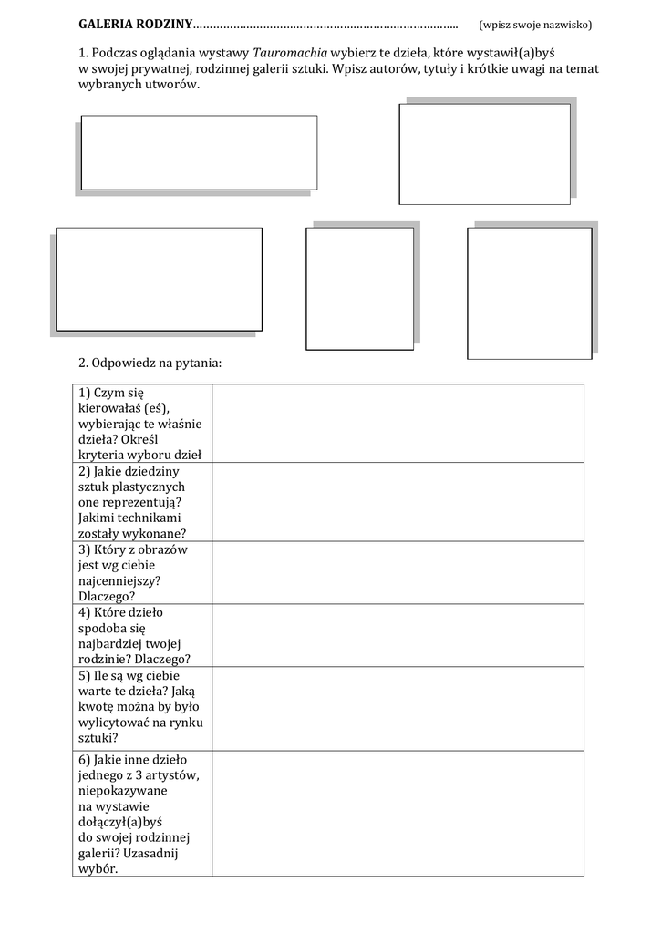 GALERIA RODZINY…………………………………………………………………….. (wpisz swoje nazwisko) 1. Podczas oglądania wystawy Tauromachia wybierz te dzieła, które wystawił(a)byś w swojej prywatnej, rodzinnej galerii sztuki. Wpisz autorów, tytuły i krótkie uwagi na temat wybranych utworów. 2. Odpowiedz na pytania: 1) Czym się kierowałaś (eś), wybierając te właśnie dzieła? Określ kryteria wyboru dzieł 2) Jakie dziedziny sztuk plastycznych one reprezentują? Jakimi technikami zostały wykonane? 3) Który z obrazów jest wg ciebie najcenniejszy? Dlaczego? 4) Które dzieło spodoba się najbardziej twojej rodzinie? Dlaczego? 5) Ile są wg ciebie warte te dzieła? Jaką kwotę można by było wylicytować na rynku sztuki? 6) Jakie inne dzieło jednego z 3 artystów, niepokazywane na wystawie dołączył(a)byś do swojej rodzinnej galerii? Uzasadnij wybór. Aby wykonać polecenie 6. warto zaproponować uczniom zarówno pracę z albumami, jak i możliwość przeglądania internetowych galerii sztuki. Przygotowały: Elżbieta Kazańska Ewa Obara–Grączewska