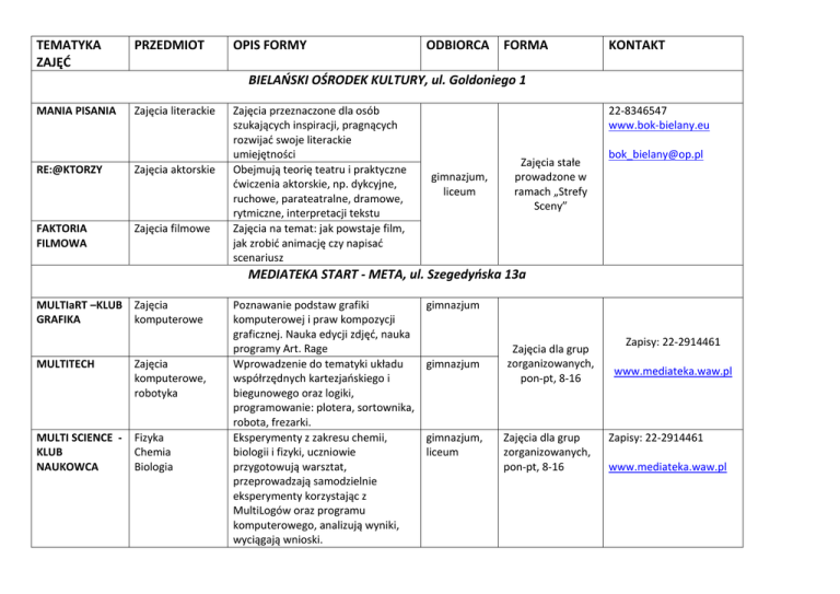 TEMATYKA ZAJĘĆ PRZEDMIOT OPIS FORMY ODBIORCA FORMA KONTAKT BIELAŃSKI OŚRODEK KULTURY, ul. Goldoniego 1 MANIA PISANIA Zajęcia literackie RE:@KTORZY Zajęcia aktorskie FAKTORIA FILMOWA Zajęcia filmowe Zajęcia przeznaczone dla osób szukających inspiracji, pragnących rozwijać swoje literackie umiejętności Obejmują teorię teatru i praktyczne ćwiczenia aktorskie, np. dykcyjne, ruchowe, parateatralne, dramowe, rytmiczne, interpretacji tekstu Zajęcia na temat: jak powstaje film, jak zrobić animację czy napisać scenariusz 22-8346547 www.bok-bielany.eu gimnazjum, liceum Zajęcia stałe prowadzone w ramach „Strefy Sceny” [email protected] MEDIATEKA START - META, ul. Szegedyńska 13a MULTIaRT –KLUB Zajęcia GRAFIKA komputerowe MULTITECH Zajęcia komputerowe, robotyka MULTI SCIENCE KLUB NAUKOWCA Fizyka Chemia Biologia Poznawanie podstaw grafiki komputerowej i praw kompozycji graficznej. Nauka edycji zdjęć, nauka programy Art. Rage Wprowadzenie do tematyki układu współrzędnych kartezjańskiego i biegunowego oraz logiki, programowanie: plotera, sortownika, robota, frezarki. Eksperymenty z zakresu chemii, biologii i fizyki, uczniowie przygotowują warsztat, przeprowadzają samodzielnie eksperymenty korzystając z MultiLogów oraz programu komputerowego, analizują wyniki, wyciągają wnioski. gimnazjum gimnazjum gimnazjum, liceum Zajęcia dla grup zorganizowanych, pon-pt, 8-16 Zajęcia dla grup zorganizowanych, pon-pt, 8-16 Zapisy: 22-2914461 www.mediateka.waw.pl Zapisy: 22-2914461 www.mediateka.waw.pl Lekcje biblioteczne i warsztaty tematyczne Biblioteka, przedmioty humanistyczne Pierwsza pomoc dla maturzystów Biblioteka, przedmioty humanistyczne Warsztaty z zakresu korzystania z wydawnictw informacyjnych, wyszukiwania informacji, sporządzania konspektu, bibliografii przedmiotowej i podmiotowej. Warsztaty z zakresu oceny przydatności publikacji do pracy maturalnej, szybkie wyszukiwanie informacji, tworzenie konspektów, bibliografii. gimnazjum, liceum Uczniowie klas trzecich liceum Zajęcia dla grup zorganizowanych, pon-pt, 8-16 Zapisy: 22-2914461 Zajęcia dla grup zorganizowanych, pon-pt, 8-16 Cykl 3 zajęć Zapisy: 22-2914461 www.mediateka.waw.pl www.mediateka.waw.pl BIELAŃSKIE CENTRUM EDUKACJI KULTURALNEJ, ul. Szegedyńska 9a Historia symbolów narodowych O zachowaniu się.. Wos, historia, Spotkania z astronomią Fizyka Godzina wychowawcza Warsztaty komputerowe Zajęcia komputerowe Taniec towarzyski Taniec Warsztaty teatralne Teatr Zapoznanie z historią: orła białego, flagi, hymnu narodowego Warsztaty z zakresu zasad grzeczności i savoir – vivre’u w kinie, teatrze, przy stole… Zdobywanie informacji na temat Układu Słonecznego, budowanie makiety Zajęcia warsztatowe obejmujące edycję tekstu, grafiki oraz praktycznego wykorzystania oprogramowania. Zajęcia na różnym poziomie zaawansowania obejmujące tańce tradycyjne i nowoczesne. Poznawanie teatru i sztuki gry aktorskiej. gimnazjum gimnazjum gimnazjum, liceum Projekt edukacyjny dla grup Sekretariat zorganizowanych @centrumszegedynska9a.pl Wtorek 9-10.30 Czwartek 9-10.30 www.centrumszegedynska9a.pl 22- 8345259 Pozaszkolne zajęcia dla indywidualnych uczestników gimnazjum, liceum gimnazjum, liceum Pozaszkolne zajęcia dla indywidualnych uczestników 22- 8345259 Sekretariat @centrumszegedynska9a.pl MŁODZIEŻOWY DOM KULTURY, ul. Cegłowska 39 Taniec w dramie Taniec Kształtowanie oraz rozwijanie zdolności motorycznych, koordynacji, rytmizacji, estetyki gimnazjum, liceum 22- 834 13 47 Zajęcia stałe www.mdkbielany.pl Studio teatru i dramatu Teatr Ceramika Plastyka Młodzieżowa Rada Bielan Samorząd Uczniowski Bielańska Kapituła Ośmiu Wolontariat Wolontariat Tenis stołowy Wychowanie fizyczne Wychowanie fizyczne Geografia Aerobik Geografia z turystyką Matematyka Wolontariat Matematyka Edukacja Muzyka muzyczna. Studio piosenki Kształtowanie wśród uczestników świadomości w zakresie podstaw warsztatu aktora oraz autora tekstów scenicznych Praca oparta na materiałach gimnazjum naturalnych, lepienie z gliny. Rozwijanie samorządności wśród młodzieży, spotkania, wydawanie gazetki internetowej, udział w sesjach Dzielnicy Bielany Praca w wolontariacie, udział w akcjach charytatywnych Praca na rzecz potrzebujących, odwiedziny w ośrodkach i Domach gimnazjum, Pomocy Społecznej liceum Nauka i doskonalenie umiejętności gry w tenisa stołowego Podniesienie sprawności fizycznej, współpraca w grupie Wyjścia na wycieczki, do muzeów, udział w rajdach i imprezach ekologicznych Rozwijanie zainteresowań matematyką, utrwalanie umiejętności zdobytych na lekcjach, uzupełnianie braków w wiadomościach. Kontynuacja pasji i uzdolnień muzycznych. Prawidłowe ustawienie aparatu głosowego. Zapoznanie z różnymi stylami muzycznymi. 22- 834 13 47 Gimnazjum, liceum Zajęcia stałe www.mdkbielany.pl