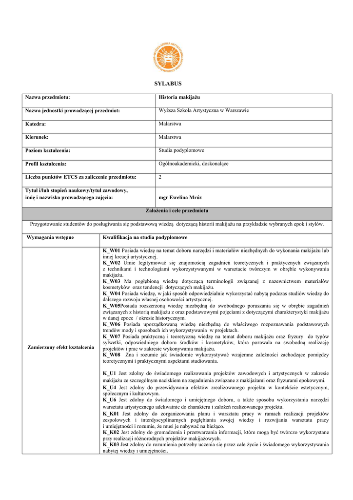 SYLABUS Nazwa przedmiotu: Historia makijażu Nazwa jednostki prowadzącej przedmiot: Wyższa Szkoła Artystyczna w Warszawie Katedra: Malarstwa Kierunek: Malarstwa Poziom kształcenia: Studia podyplomowe Profil kształcenia: Ogólnoakademicki, doskonalące Liczba punktów ETCS za zaliczenie przedmiotu: 2 Tytuł i/lub stopień naukowy/tytuł zawodowy, imię i nazwisko prowadzącego zajęcia: mgr Ewelina Mróz Założenia i cele przedmiotu Przygotowanie studentów do posługiwania się podstawową wiedzą dotyczącą historii makijażu na przykładzie wybranych epok i stylów. Wymagania wstępne Zamierzony efekt kształcenia Kwalifikacja na studia podyplomowe K_W01 Posiada wiedzę na temat doboru narzędzi i materiałów niezbędnych do wykonania makijażu lub innej kreacji artystycznej. K_W02 Umie legitymować się znajomością zagadnień teoretycznych i praktycznych związanych z technikami i technologiami wykorzystywanymi w warsztacie twórczym w obrębie wykonywania makijażu. K_W03 Ma pogłębioną wiedzę dotyczącą terminologii związanej z nazewnictwem materiałów kosmetyków oraz tendencji dotyczących makijażu. K_W04 Posiada wiedzę, w jaki sposób odpowiedzialnie wykorzystać nabytą podczas studiów wiedzę do dalszego rozwoju własnej osobowości artystycznej. K_W05Posiada rozszerzoną wiedzę niezbędną do swobodnego poruszania się w obrębie zagadnień związanych z historią makijażu z oraz podstawowymi pojęciami z dotyczącymi charakterystyki makijażu w danej epoce / okresie historycznym. K_W06 Posiada uporządkowaną wiedzę niezbędną do właściwego rozpoznawania podstawowych trendów mody i sposobach ich wykorzystywania w projektach. K_W07 Posiada praktyczną i teoretyczną wiedzę na temat doboru makijażu oraz fryzury do typów sylwetki, odpowiedniego doboru środków i kosmetyków, która pozawala na swobodną realizację projektów i prac w zakresie wykonywania makijażu. K_W08 Zna i rozumie jak świadomie wykorzystywać wzajemne zależności zachodzące pomiędzy teoretycznymi i praktycznymi aspektami studiowania. K_U1 Jest zdolny do świadomego realizowania projektów zawodowych i artystycznych w zakresie makijażu ze szczególnym naciskiem na zagadnienia związane z makijażami oraz fryzurami epokowymi. K_U4 Jest zdolny do przewidywania efektów zrealizowanego projektu w kontekście estetycznym, społecznym i kulturowym. K_U6 Jest zdolny do świadomego i umiejętnego doboru, a także sposobu wykorzystania narzędzi warsztatu artystycznego adekwatnie do charakteru i założeń realizowanego projektu. K_K01 Jest zdolny do zorganizowania planu i warsztatu pracy w ramach realizacji projektów zespołowych i interdyscyplinarnych pogłębiania swojej wiedzy i rozwijania warsztatu pracy i umiejętności i rozumie, że musi je nabywać na bieżąco. K_K02 Jest zdolny do gromadzenia i przetwarzania informacji, które mogą być twórczo wykorzystane przy realizacji różnorodnych projektów makijażowych. K_K03 Jest zdolny do rozumienia potrzeby uczenia się przez całe życie i świadomego wykorzystywania nabytej wiedzy i umiejętności. Liczba godzin dydaktycznych i formy zajęć i punkty ECTS: Liczba godzin dydaktycznych i kontaktowych (w tym): Przedmiot I semestr Forma zajęć: (W - wykład, Ć - ćwiczenia, K -konwersatorium) Historia makijażu Razem W 4 4 Ć K Godziny kontaktowe 8 Samodzielna praca słuchacza Rygor ECTS 56h Zo 2 W R – rygor (egzamin, - E, zaliczenie z oceną –Zo, zaliczenie – Z) Treści programowe nauczania [ treść zajęć] Wykład: Historia makijażu od Starożytnego Egiptu do lat 90 XX wieku Wprowadzenie do zajęć: Omówienie rodzajów pędzli oraz innych narzędzi służących do wykonania makijażu Zasady higieny Specyfika makijażu filmowego, fotograficznego, telewizyjnego Rodzaje światła Etapy nakładania makijażu Prezentacja kosmetyków Zagadnienia programowe nauczania: Narzędzie/ metody dydaktyczne: Forma i sposób zaliczenia oraz wymagania egzaminacyjne: Metody i kryteria oceny: Wymagania końcowe: Większość zajęć ma charakter konwersatorium, uzupełniany dyskusją ze studentami, pracą grupową. Pozytywny wynik pracy pisemnej Frekwencja oraz pozytywny wynik zaliczenia pracy pisemnej. W skład oceny zaliczeniowej wchodzą: - podsumowanie obecności – dopuszczalne 2 nieobecności w semestrze, - wykonane i ocenione pozytywne projekty w trakcie semestru. Formy weryfikacji osiągnięcia Zaliczenie prac – 80% efektów kształcenia [ elementy Frekwencja – 20% składowe oceny w %] Język wykładowy polski Literatura Literatura podstawowa: Podpis prowadzącego przedmiot: Podpis prorektora do spraw dydaktycznych: Oświadczenie i podpis prowadzącego zajęcia Oświadczam, że treści programowe zawarte w niniejszym sylabusie są rezultatem mojej indywidualnej pracy twórczej wykonywanej w ramach stosunku pracy/współpracy wynikającej z umowy cywilnoprawnej oraz że osobom trzecim nie przysługują z tego tytułu autorskie prawa majątkowe. Dnia: ………………………………………….. ……………………………………..