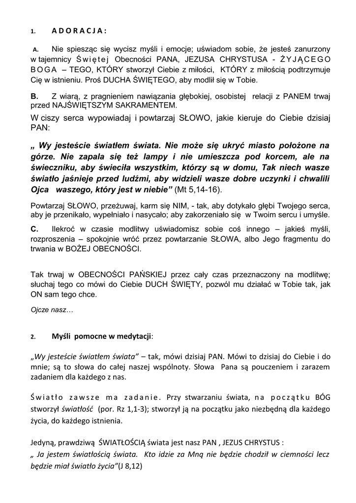 1. ADORACJA: Nie spiesząc się wycisz myśli i emocje; uświadom sobie, że jesteś zanurzony w tajemnicy Ś w i ę t e j Obecności PANA, JEZUSA CHRYSTUSA - Ż Y J Ą C E G O B O G A – TEGO, KTÓRY stworzył Ciebie z miłości, KTÓRY z miłością podtrzymuje Cię w istnieniu. Proś DUCHA ŚWIĘTEGO, aby modlił się w Tobie. A. B. Z wiarą, z pragnieniem nawiązania głębokiej, osobistej relacji z PANEM trwaj przed NAJŚWIĘTSZYM SAKRAMENTEM. W ciszy serca wypowiadaj i powtarzaj SŁOWO, jakie kieruje do Ciebie dzisiaj PAN: „ Wy jesteście światłem świata. Nie może się ukryć miasto położone na górze. Nie zapala się też lampy i nie umieszcza pod korcem, ale na świeczniku, aby świeciła wszystkim, którzy są w domu, Tak niech wasze światło jaśnieje przed ludźmi, aby widzieli wasze dobre uczynki i chwalili Ojca waszego, który jest w niebie” (Mt 5,14-16). Powtarzaj SŁOWO, przeżuwaj, karm się NIM, - tak, aby dotykało głębi Twojego serca, aby je przenikało, wypełniało i nasycało; aby zakorzeniało się w Twoim sercu i umyśle. C. Ilekroć w czasie modlitwy uświadomisz sobie coś innego – jakieś myśli, rozproszenia – spokojnie wróć przez powtarzanie SŁOWA, albo Jego fragmentu do trwania w BOŻEJ OBECNOŚCI. Tak trwaj w OBECNOŚCI PAŃSKIEJ przez cały czas przeznaczony na modlitwę; słuchaj tego co mówi do Ciebie DUCH ŚWIĘTY, pozwól mu działać w Tobie tak, jak ON sam tego chce. Ojcze nasz… 2. Myśli pomocne w medytacji: „Wy jesteście światłem świata” – tak, mówi dzisiaj PAN. Mówi to dzisiaj do Ciebie i do mnie; są to słowa do całej naszej wspólnoty. Słowa Pana są pouczeniem i zarazem zadaniem dla każdego z nas. Ś w i a t ł o z a w s z e m a z a d a n i e . Przy stwarzaniu świata, n a p o c z ą t k u BÓG stworzył światłość (por. Rz 1,1-3); stworzył ją na początku jako niezbędną dla każdego życia, do każdego istnienia. Jedyną, prawdziwą ŚWIATŁOŚCIĄ świata jest nasz PAN , JEZUS CHRYSTUS : „ Ja jestem światłością świata. Kto idzie za Mną nie będzie chodził w ciemności lecz będzie miał światło życia”(J 8,12) „Wy jesteście światłem świata” .... My nic z siebie nie mamy. Możemy być „światłem świata” jedynie wtedy, gdy ŚWIATŁOŚĆ PANA będzie w nas świecić. Ś w i a t ł o ś ć CHRYSTUSA wypełnia i rozświetla duszę i serce jedynie tego, kto stara się i ś ć za PANEM n a p r a w d ę ; ś w i a t ł o ś ć CHRYSTUSA zakorzenia się w nim, staje się dla niego ś w i a t ł e m ż y c i a i m o c ą d o d z i a ł a n i a . „Nie może się ukryć miasto położone na górze. Nie zapala się też lampy i nie umieszcza pod korcem, ale na świeczniku, aby świeciła wszystkim, którzy są w domu”. Tymi słowami PAN mówi nam, że mamy służyć tym wszystkim, co otrzymujemy od NIEGO; m a m y b y ć J E G O ś w i a t ł e m w ś w i e c i e ; mamy rozjaśniać mroki świata. „Nie może się ukryć miasto położone na górze”…… Każdy z nas wie, jak daleko rozlewają się nocą światła miasta, a cóż powiedzieć o światłach miasta położonego na górze. Widać je z bardzo daleka; ich światła nocą to potężny i jakby jedyny drogowskaz. Jesteśmy uczniami JEZUSA CHRYSTUSA, naszego PANA i ZBAWICIELA. Poprzez osobistą modlitwę i spotkania wspólnotowe wstępujemy, na ś w i ę t ą g ó r ę , gdzie styka się Niebo z ziemią i gdzie spotykamy się z PANEM, z JEGO ŚWIATŁOŚCIĄ i MOCĄ. BÓG jest MIŁOŚCIĄ (1J 4,8b) ; JEGO ŚWIATŁOŚĆ i JEGO MOC są nierozerwalnie zjednoczone z MIŁOŚCIĄ; są MIŁOŚCIĄ. PAN jest BOGIEM hojnym i chce nas uczynić n a r z ę d z i a m i Swojej ŚWIATŁOŚCI abyśmy byli „światłem świata” Jako poszczególne osoby mamy być jak świeca, której światła nie przykrywa się garnkiem; jako wspólnota mamy być jak miasto położone na górze. Miastem położonym na górze - MIASTEM ŚWIĘTYM zstępującym z Nieba - przybytkiem Boga z ludźmi, gdzie Bóg zamieszka wraz z nimi i będą Jego ludem - jest Nowe Jeruzalem z Apokalipsy (por. Ap 21,2) Nowe Jeruzalem z Apokalipsy - to miasto niezwykłe – bo wciąż na niego czekamy, ale też, żyjemy w nim już tutaj i teraz. Jest to Miasto odkupionych, w którym żyją oni w pełnej komunii z BOGIEM. Takim Świętym Miastem zstępującym z Nieba, mistycznym Miastem na Górze jest Kościół Święty, który jest połączeniem rzeczywistości niebiańskiej z rzeczywistością ziemską. Nasza wspólnota jest nieodłączną częścią Kościoła Świętego. Nasza nazwa Nowe Jeruzalem zobowiązuje naszą wspólnotę jako całość i jednocześnie każdego z nas osobno, do podjęcia wezwania „bycia światłem świata”. Każdy z nas, już został obdarowany wieloma darami i charyzmatami; wielu innych PAN nam udzieli, gdy w sercach podejmiemy gotowość do służby według JEGO woli. Trwajmy przed PANEM; wołajmy o nowe wylanie JEGO DUCHA ŚWIĘTEGO, o JEGO ŚWIATŁO, o JEGO prowadzenie, o przemienianie nas w JEGO narzędzia. Maryjo, któraś nosiła w swoim łonie ŚWIATŁOŚĆ ŚWIATA i piastowałaś JĄ na swoich rękach módl się za nami.