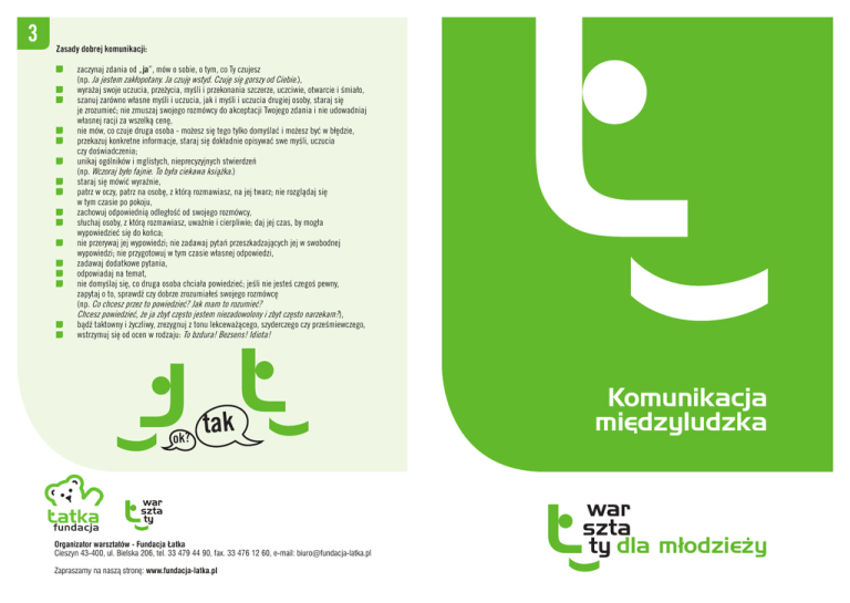 3 Zasady dobrej komunikacji: zaczynaj zdania od „ja”, mów o sobie, o tym, co Ty czujesz (np. Ja jestem zakłopotany. Ja czuję wstyd. Czuję się gorszy od Ciebie.), wyrażaj swoje uczucia, przeżycia, myśli i przekonania szczerze, uczciwie, otwarcie i śmiało, szanuj zarówno własne myśli i uczucia, jak i myśli i uczucia drugiej osoby, staraj się je zrozumieć; nie zmuszaj swojego rozmówcy do akceptacji Twojego zdania i nie udowadniaj własnej racji za wszelką cenę, nie mów, co czuje druga osoba - możesz się tego tylko domyślać i możesz być w błędzie, przekazuj konkretne informacje, staraj się dokładnie opisywać swe myśli, uczucia czy doświadczenia; unikaj ogólników i mglistych, nieprecyzyjnych stwierdzeń (np. Wczoraj było fajnie. To była ciekawa książka.) staraj się mówić wyraźnie, patrz w oczy, patrz na osobę, z którą rozmawiasz, na jej twarz; nie rozglądaj się w tym czasie po pokoju, zachowuj odpowiednią odległość od swojego rozmówcy, słuchaj osoby, z którą rozmawiasz, uważnie i cierpliwie; daj jej czas, by mogła wypowiedzieć się do końca; nie przerywaj jej wypowiedzi; nie zadawaj pytań przeszkadzających jej w swobodnej wypowiedzi; nie przygotowuj w tym czasie własnej odpowiedzi, zadawaj dodatkowe pytania, odpowiadaj na temat, nie domyślaj się, co druga osoba chciała powiedzieć; jeśli nie jesteś czegoś pewny, zapytaj o to, sprawdź czy dobrze zrozumiałeś swojego rozmówcę (np. Co chcesz przez to powiedzieć? Jak mam to rozumieć? Chcesz powiedzieć, że ja zbyt często jestem niezadowolony i zbyt często narzekam?), bądź taktowny i życzliwy, zrezygnuj z tonu lekceważącego, szyderczego czy prześmiewczego, wstrzymuj się od ocen w rodzaju: To bzdura! Bezsens! Idiota! ok? tak Organizator warsztatów - Fundacja Łatka Cieszyn 43-400, ul. Bielska 206, tel. 33 479 44 90, fax. 33 476 12 60, e-mail: [email protected] Zapraszamy na naszą stronę: www.fundacja-latka.pl Komunikacja miedzyludzka dla młodziezy Komunikacja międzyludzka 1 ja Wszystkie stworzenia, żyjąc w grupie, porozumiewają się ze sobą. Człowiek jest istotą społeczną, a mowa zjawiskiem społecznym. Doskonalimy ją w kontaktach z innymi ludźmi. Dzięki komunikowaniu się ludzie: spotykają się ze sobą, wymieniają informacje, opinie, poglądy, wpływają na siebie, pomagają sobie, zakładają związki, tworzą przyjacielskie relacje, budują bliskość między sobą, wzajemne zaufanie, dowiadują się czegoś o sobie, o tym, jak spostrzegani są przez innych ludzi, wchodzą w konflikty i rozwiązują je, kłócą się ze sobą i godzą. Komunikowanie się to przekaz informacji ze świadomym zamiarem wywołania odpowiedzi. Możliwe jest przekazanie komunikatu za pomocą słów lub bez słów (np. mogę komuś powiedzieć: Kocham Cię albo mogę tę osobę objąć, pocałować, przytulić). Przepływ informacji: 2 ja!! Często się zdarza, że- w rozmowach na ważne tematy- nie potrafimy porozumieć się ze sobą, skutkiem czego rozmowy przekształcają się w kłótnie. Rozważmy przykładowo następującą sytuację: Pewnego wieczoru Rafał wraca ze spotkania z kolegami i zastaje w domu swojego młodszego brata Michała z kwaśną miną. Michał wybucha. Michał: Zupełnie nie liczysz się ze mną! Dlaczego mnie nie zabrałeś ze sobą?! Nigdy nie chcesz mnie zabierać jak wychodzisz z chłopakami na boisko! Nic cię nie obchodzę! Rafał: Jak zwykle masz problem! Nie przesadzaj, dobrze?! Michał: Pewnie! Jesteś takim egoistą! Może chociaż raz postawiłbyś brata na pierwszym miejscu! Rafał (odchodząc): Nie jestem żadnym egoistą! Zejdź ze mnie! Przestań w końcu zrzędzić! OSOBA A - NADAWCA OSOBA B - ODBIORCA myśli, odczuwa, ma pewne zamiary i przekłada to na INFORMACJE interpretuje odebrane sygnały, wewnętrznie je przetwarza; myśli, odczuwa, ma pewne zamiary i przekłada to na INFORMACJE (odpowiedź) Komunikacja jest skuteczna, gdy odbiorca: zrozumie informację nadawcy, uważnie słucha, nie osądza i nie ocenia wypowiedzi nadawcy, jest otwarty i ufa nadawcy. Michał (z narastającą wściekłością): Egoista! Samolub! Michał nie mówi wprost, co czuje. Ocenia brata i atakuje go. Dlatego Rafał nie myśli o tym, jak się z bratem dogadać, tylko o tym, jak najszybciej skończyć tę rozmowę. Ich konflikt narasta. Gdyby Michał powiedział bratu, co naprawdę czuje i czego od niego potrzebuje, rozmowa mogłaby potoczyć się na przykład tak: Michał: Rafał, przez cały tydzień wychodzisz z kolegami i ani razu nie zaproponowałeś mi, bym się do Was przyłączył. Sprawia mi to przykrość, wiesz? A nawet złość - potworną złość. Tak bardzo chciałbym też należeć do tego Waszego towarzystwa, grać z Wami w piłkę. Rafał: Michał, nigdy nie przyszło mi do głowy, że tak Ci na tym zależy. Dobrze, jeśli chcesz, to jutro zabiorę Cię ze sobą na nasze boisko. O 16:00 bądź gotowy do wyjścia.