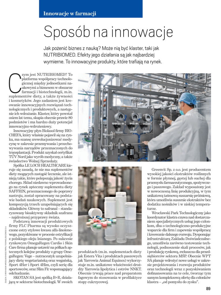 Innowacje w farmacji Sposób na innowacje Jak pożenić biznes z nauką? Może nią być klaster, taki jak NUTRIBIOMED. Efekty jego działania są jak najbardziej wymierne. To innowacyjne produkty, które trafiają na rynek. Zdjęcia: z archiwum Wrocławskiego Parku Technologicznego S.A. C zym jest NUTRIBIOMED? To platforma współpracy technologicznej między jednostkami naukowymi a biznesem w obszarze farmacji i biotechnologii, m.in. suplementów diety, a także żywności i kosmetyków. Jego zadaniem jest kreowanie innowacyjnych rozwiązań technologicznych i produktowych, a następnie ich wdrażanie. Klaster, który powstał osiem lat temu, skupia obecnie prawie 80 podmiotów i ma bardzo duży potencjał innowacyjno-wdrożeniowy. Innowacyjny płyn Biolasol firmy BIOCHEFA, który właśnie pojawił się na rynku, ma szansę zrewolucjonizować medycynę w zakresie przemywania i przechowywania narządów przeznaczonych do transplantacji. Produkt uzyskał certyfikat TŰV Nord jako wyrób medyczny, a także świadectwo Wolnej Sprzedaży. Spółka LE LOCH HEALTHCARE kieruje się zasadą, że nie ma suplementów diety mogących zastąpić leczenie, ale istnieją takie, które polepszają jakość życia chorego. Skład niedawno wprowadzonego na rynek apteczny suplementu diety SAFFRIN, przeznaczonego do poprawy nastroju, został opracowany na podstawie badań naukowych. Suplement jest kompozycją trzech uzupełniających się składników. Główny to safranal – standaryzowany bioaktywny składnik szafranu – najdroższej przyprawy świata. Podstawą innowacji produktowych firmy FLC Pharma są wysoko oczyszczone estry etylowe kwasu alfa-linolenowego, pozyskiwane w procesie estryfikacji z polskiego oleju lnianego. Po sukcesie rynkowym OmegaRegen Cardio i Skin Care firma planuje ustawić na półkach aptecznych kolejne produkty z grupy OmegaRegen: Vege – nutraceutyk uzupełniający dietę wegetariańską oraz wegańską, Sport 4Her i Sport 4Him, czyli serię dla sportowców, oraz Slim Fit wspomagający odchudzanie. SKOTAN SA jest spółką B+R, działającą w sektorze biotechnologii. W swoich produktach (m.in. suplementach diety jak Estera Vita i produktach paszowych jak Yarrowia Animal Equinox) wykorzystuje m.in. unikatowe właściwości drożdży Yarrowia lipolytica i estrów NNKT. Obecnie trwają prace nad preparatem fagowym do stosowania w profilaktyce stopy cukrzycowej. Greenvit Sp. z o.o. jest producentem wysokiej jakości ekstraktów roślinnych w formie płynnej, gęstej lub suchej dla przemysłu farmaceutycznego, spożywczego i paszowego. Zakład wyposażony jest w nowoczesną linię produkcyjną, w tym unikatową taśmową suszarnię próżniową, która umożliwia suszenie ekstraktów bez dodatku nośników i w niskiej temperaturze. Wrocławski Park Technologiczny jako koordynator klastra czuwa nad dostarczaniem specjalistycznych usług jego członkom, dba o technologiczno-produkcyjne wsparcie dla firm i zapewnia współpracę i kreowanie dalszego rozwoju. Dysponując infrastrukturą Zakładu Doświadczalnego, umożliwia zarówno testowanie technologii, podnoszenie skali procesów, jak i produkcję rynkową, zwłaszcza dla przedsiębiorców sektora MŚP. Obecnie WPT SA planuje wdrożyć nowe usługi w zakresie projektowania i rozwoju produktów oraz technologii wraz z pozyskiwaniem dofinansowania na te cele, tworząc tym samym kompleksową ofertę dla członków klastra – „od pomysłu do zysku”. 89