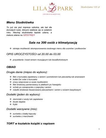 Studniówka 120 zł Menu Studniówka To już nie jest impreza szkolna, ale bal dla dorosłych ludzi, którymi staliście się w ostatnim roku. Niechaj studniówka będzie udana, a matura zdana na SZÓSTKĘ!!! Sala na 300 osób z klimatyzacją istnieje możliwość skomponowania osobnego menu dla uczniów i profesorów OPIS UROCZYSTOŚCI od 20.00 do 03.00 przywitanie i toast winem musującym lub bezalkoholowym OBIAD Drugie danie (mięso do wyboru): filet z kurczaka zapiekany z serem i pomidorem lub pieczarką lub ananasem kotlet De`volai z kurczaka zrazy wieprzowe w sosie myśliwskim filet drobiowy panierowany w płatkach po hawajsku schab po szwajcarsku z papryką i serem roladki drobiowe faszerowane pieczarkami i serem z sosem bazyliowym Dodatki (jeden do wyboru): ziemniaki z wody lub zapiekane kluski śląskie frytki Dodatki warzywne (mix): surówka z białej kapusty surówka z marchewki TORT w kształcie książki z napisem 1 Studniówka 120 zł CIEPŁA PRZEKĄSKA dla maturzystów (jedna do wyboru) 22.00 mini pizza frittata z serem i grillowanymi warzywami z serem i pieczoną papryką z serem i salami grillowany burger a’la Lila Park kiełbaski w cieście francuskim CIEPŁA PRZEKĄSKA dla kadry profesorskiej (jedna do wyboru) 22.00 uda faszerowane pieczarkami szaszłyki płonące ZUPA (podawana ok. 02:00) barszcz czerwony z pasztecikiem ZIMNE PRZEKĄSKI na stole szwedzkim sałatka z grillowanym kurczakiem sałatka grecka sałatka makaronowa z kabanosami sałatka a’la kebab jajka faszerowane na trzy sposoby pomidory faszerowane szynką i serem tartinki z miksem past, wędlin i serów KĄCIK SŁODKOŚCI ciasta koktajlowe w rożnych smakach mufinki w różnych smakach i polewach paluszki, orzeszki, itp. NAPOJE kawa, herbata - bez ograniczeń woda z miętą i cytryną - bez ograniczeń napoje owocowe niegazowane - bez ograniczeń napoje gazowane typu coca-cola - 1 litr/osoba 2 Studniówka 120 zł Dodatkowo w cenie znajduje się: DOWÓZ AUTOKAREM: SZKOŁA - LILA PARK - SZKOŁA DJ - PREZENTER - z najlepszych szczecińskich agencji muzycznych aranżacja sali obsługa kelnerska parking Cena za osobę 120 zł Uwaga! Drodzy Państwo! Wyżej wymieniona oferta jest tylko i wyłącznie naszą propozycją. Jesteśmy otwarci na Państwa sugestie, uwagi oraz oczekiwania. Dodatkowe usługi na życzenie klienta: Fontanna czekoladowa Pokaz profesjonalnej pary tanecznej. Inne indywidualne oczekiwania do ustalenia. Adres: Centrum Bankietowe Lila Park (12 km od centrum Szczecina placu Kościuszki) 72-002 Dołuje Kościno 1a Rafał Kluczyński Tel. 509 634 784 www.lilapark.net email: [email protected] 3