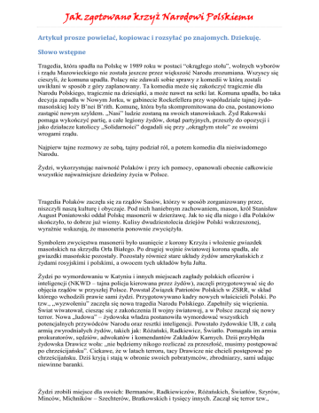 Jak zgotowano krzyż Narodowi Polskiemu Artykuł prosze powielać, kopiowac i rozsyłać po znajomych. Dziekuję. Słowo wstępne Tragedia, która spadła na Polskę w 1989 roku w postaci “okrągłego stołu”, wolnych wyborów i rządu Mazowieckiego nie została jeszcze przez większość Narodu zrozumiana. Wszyscy się cieszyli, że komuna upadła. Polacy nie zdawali sobie sprawy z komedii w którą zostali uwikłani w sposób z góry zaplanowany. Ta komedia może się zakończyć tragicznie dla Narodu Polskiego, tragicznie na dziesiątki, a może nawet na setki lat. Komuna upadła, bo taka decyzja zapadła w Nowym Jorku, w gabinecie Rockefellera przy współudziale tajnej żydomasońskiej loży B’nei B’rith. Komunę, która była skompromitowana do cna, postanowiono zastąpić nowym szyldem. „Nasi” ludzie zostaną na swoich stanowiskach. Żyd Rakowski pomaga wykończyć partię, a całe legiony żydów, dotąd partyjnych, przeszły do opozycji i jako działacze katoliccy „Solidarności” dogadali się przy „okrągłym stole” ze swoimi wrogami rządu. Najpierw tajne rozmowy ze sobą, tajny podział ról, a potem komedia dla nieświadomego Narodu. Żydzi, wykorzystując naiwność Polaków i przy ich pomocy, opanowali obecnie całkowicie wszystkie najważniejsze dziedziny życia w Polsce. Tragedia Polaków zaczęła się za rządów Sasów, którzy w sposób zorganizowany przez, niszczyli naszą kulturę i obyczaje. Pod nich haniebnym zachowaniem, mason, król Stanisław August Poniatowski oddał Polskę masonerii w dzierżawę. Jak to się dla niego i dla Polaków skończyło, to dobrze już wiemy. Kulisy dwudziestolecia dziejów Polski wskrzeszonej, wyraźnie wskazują, że masoneria ponownie zwyciężyła. Symbolem zwycięstwa masonerii było usunięcie z korony Krzyża i włożenie gwiazdek masońskich na skrzydła Orła Białego. Po drugiej wojnie światowej korona spadła, ale gwiazdki masońskie pozostały. Pozostały również stare układy żydów amerykańskich z żydami rosyjskimi i polskimi, a owocem tych układów była Jałta. Żydzi po wymordowaniu w Katyniu i innych miejscach zagłady polskich oficerów i inteligencji (NKWD – tajna policja kierowana przez żydów), zaczęli przygotowywać się do objęcia rządów w przyszłej Polsce. Powstał Związek Patriotów Polskich w ZSRR, w skład którego wchodzili prawie sami żydzi. Przygotowywano kadry nowych właścicieli Polski. Po tzw., „wyzwoleniu” zaczęła się nowa tragedia Narodu Polskiego. Zapełniły się więzienia. Świat wiwatował, ciesząc się z zakończenia II wojny światowej, a w Polsce zaczął się nowy terror. Nowa „ludowa” – żydowska władza postanowiła wymordować wszystkich potencjalnych przywódców Narodu oraz resztki inteligencji. Powstało żydowskie UB, z całą armią zwyrodniałych żydów, takich jak: Różański, Radkiewicz, Światło. Pomagała im armia prokuratorów, sędziów, adwokatów i komendantów Zakładów Karnych. Dziś przybłęda żydowska Drawicz woła: „nie będziemy nikogo rozliczać za przeszłość, musimy postępować po chrześcijańsku”. Ciekawe, że w latach terroru, tacy Drawicze nie chcieli postępować po chrześcijańsku. Dziś kryją i stają w obronie swoich pobratymców, zbrodniarzy, sami udając niewinne baranki. Żydzi zrobili miejsce dla swoich: Bermanów, Radkiewiczów, Różańskich, Światłów, Szyrów, Minców, Michników – Szechterów, Bratkowskich i tysięcy innych. Zaczął się terror tzw., „stalinowski”, dokonywany rękami żydów i ich agentów. Rabowano kraj. Z biegiem lat, na Zachód, docierało coraz więcej wiadomości o terrorze żydowskim w Polsce. Żydzi, widząc, że sprawa może stać się bardzo głośna, dokonują prowokacji w Kielcach. Bojówki żydowskie, zmontowane z różnej maści agentów, napadły na domy żydowskie, robiąc wielki popłoch. Prasa żydowska tylko na to czekała. Cały świat dowiedział się, że to Polacy prześladują żydów. Są to stare metody, przez żydostwo wielokrotnie wypróbowane. Potem przyszły rozgrywki między komunistami – żydami i „chamami”, walka o władzę. Wywoływało się kryzysy, by niezadowolenie społeczne wzrosło i odpowiednio je podsycając, rozgrywano układy, kosztem nieraz dziesiątków zabitych i tysięcy aresztowanych, bitych Polaków, którzy nieświadomie stali się obiektem manipulacji grup rozgrywających własne plany – nie polskie. Tak przeżyliśmy lata 1956, 1968, 1970, 1976, 1980 i doczekaliśmy się tego, że żydzi częściowo odsunięci od władzy w 1956 roku powracają triumfalnie na najwyższe stanowiska, wykorzystując do tego celu Wałęsę i „Solidarność”. Naiwni Polacy, zwiedzeni wśród „działaczy” pseudo-katolickich, działaczy społecznych itp., zaufali podstawionemu agentowi Wałęsie, który został wylansowany przez prasę żydowską, radiostacje radiowe i telewizyjne na usługach żydowskich. Niedouczone, ciemne, ogłupiane przez dziesiątki lat społeczeństwo, pozbawione myśli i polityki polskiej, odsunięte od prawdziwych źródeł informacji, bez elity intelektualnej, która czuje i myśli po polsku, ale za to z całą masą przywódców, artystów i twórców, pisarzy pochodzenia żydowskiego, lub takich co poszli na służbę szatanowi do masonerii, to społeczeństwo stało się ofiarą spisku doskonale zorganizowanego, który objawił się przy „okrągłym stole”, farsą wyborów i w konsekwencji przekazaniem rządów żydowi Mazowieckiemu. A swoją drogą, ten Mazowiecki to geniusz. Jest to żyd i Polak, mason i katolik, dziennikarz, polityk i były premier, jednym słowem jest wszystkim. Prawda o Wałęsie Żydzi po wielu porażkach, przepychankach z Moczarem, wrócili triumfalnie do rządu z pomocą Wałęsy, który z każdym dniem, z każdym wywiadem demaskował się, odkrywając swoje nieuctwo, dyletantyzm polityczny i pychę. Wałęsa operował sloganami podsuniętymi przez żydo