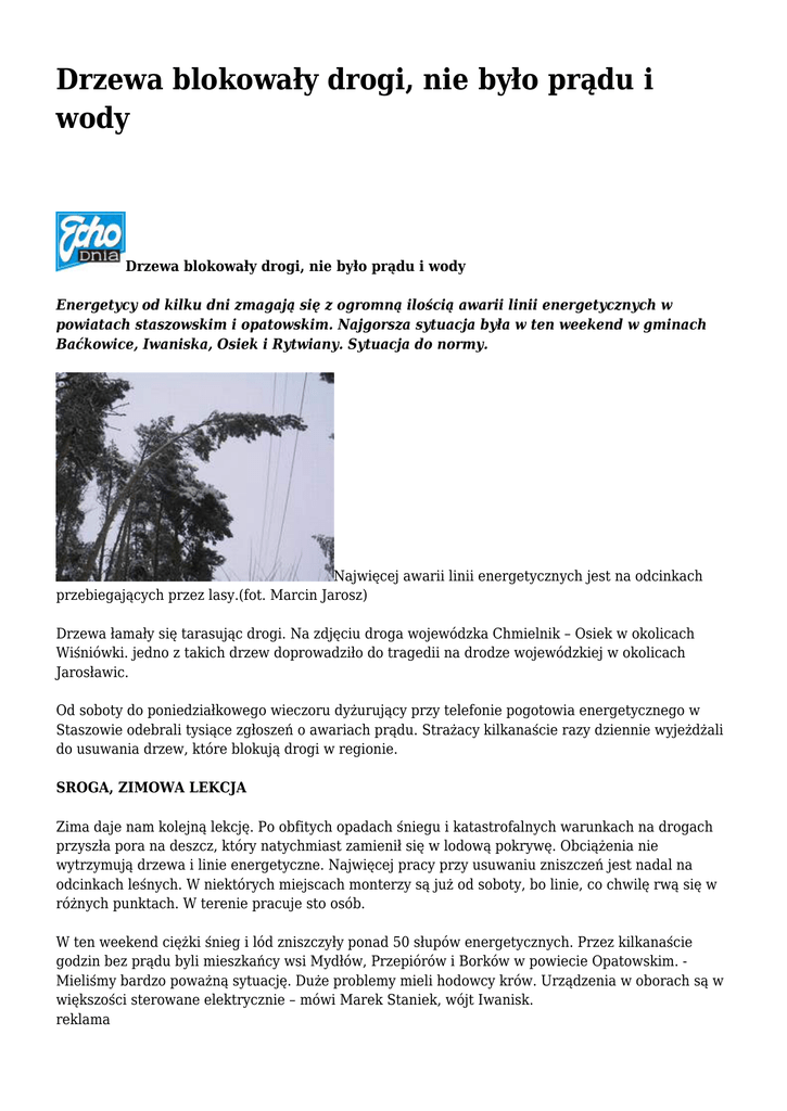 Drzewa blokowały drogi, nie było prądu i wody Drzewa blokowały drogi, nie było prądu i wody Energetycy od kilku dni zmagają się z ogromną ilością awarii linii energetycznych w powiatach staszowskim i opatowskim. Najgorsza sytuacja była w ten weekend w gminach Baćkowice, Iwaniska, Osiek i Rytwiany. Sytuacja do normy. Najwięcej awarii linii energetycznych jest na odcinkach przebiegających przez lasy.(fot. Marcin Jarosz) Drzewa łamały się tarasując drogi. Na zdjęciu droga wojewódzka Chmielnik – Osiek w okolicach Wiśniówki. jedno z takich drzew doprowadziło do tragedii na drodze wojewódzkiej w okolicach Jarosławic. Od soboty do poniedziałkowego wieczoru dyżurujący przy telefonie pogotowia energetycznego w Staszowie odebrali tysiące zgłoszeń o awariach prądu. Strażacy kilkanaście razy dziennie wyjeżdżali do usuwania drzew, które blokują drogi w regionie. SROGA, ZIMOWA LEKCJA Zima daje nam kolejną lekcję. Po obfitych opadach śniegu i katastrofalnych warunkach na drogach przyszła pora na deszcz, który natychmiast zamienił się w lodową pokrywę. Obciążenia nie wytrzymują drzewa i linie energetyczne. Najwięcej pracy przy usuwaniu zniszczeń jest nadal na odcinkach leśnych. W niektórych miejscach monterzy są już od soboty, bo linie, co chwilę rwą się w różnych punktach. W terenie pracuje sto osób. W ten weekend ciężki śnieg i lód zniszczyły ponad 50 słupów energetycznych. Przez kilkanaście godzin bez prądu byli mieszkańcy wsi Mydłów, Przepiórów i Borków w powiecie Opatowskim. Mieliśmy bardzo poważną sytuację. Duże problemy mieli hodowcy krów. Urządzenia w oborach są w większości sterowane elektrycznie – mówi Marek Staniek, wójt Iwanisk. reklama BEZ PRĄDU I WODY Nie lepiej było w Mucharzewie i Strzegomku w powiecie staszowskim. W tych miejscach linie energetyczne przechodzą w dużej mierze przez lasy i to na tych odcinkach było najwięcej awarii. – Wszyscy monterzy pracują bez przerwy od kilku dni. Najgorzej było w sobotę i niedzielę, bo bez prądu było blisko 4 tysiące odbiorców. Najwięcej uszkodzeń jest tam, gdzie linie przechodzą przez lasy. Teraz sytuacja się poprawia – mówi Damian Sierant dyrektor Rejonu Energetycznego w Staszowie, który odpowiada za dostarczanie energii na tym terenie. Brak energii w wielu miejscach oznaczał też brak wody. W poniedziałek około godziny 14 prądu i wody nie było w Rytwianach. – Nie działają pompy, dlatego nie ma wody. Energetycy są już na miejscu. Mam nadzieję, że uda się naprawić uszkodzenia – mówi Grzegorz Forkasiewicz, wójt Rytwian. Około godziny 21 monterzy przywrócili energię. ZERWANE LINIE ENERGETYCZNE. POŁAMANE DRZEWA I ŚMIERĆ NA DRODZE Brak prądu i wody to nie jedyne zmartwienia. Kierowcy muszą bardzo uważać na drogach, bo ciężki śnieg łamie gałęzie i drzewa. Najgorzej jest na odcinkach przebiegających przez lasy. Taką niespodziankę mieli na przykład kierowcy jadący drogą wojewódzką na odcinku od Staszowa do Osieka. W sobotę około 22.30 w okolicach Wiśniówki drogę zatarasowała sosna, która runęła pod naporem śniegu i lodu. Droga była zablokowana przez prawie godzinę. Wczoraj spadające na jezdnię drzewo doprowadziło do tragedii. Na trasie wojewódzkiej łączącej Stopnicę ze Staszowem w okolicach Jarosławic na drogę spadło drzewo a jeden z konarów przebił szybę samochodu śmiertelnie raniąc pasażera. Źródło: Echo Dnia, 13.01.2010r.,Marcin Jarosz Gmina Rytwiany - www.rytwiany.com.pl