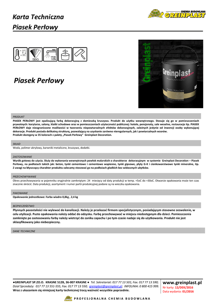 Karta Techniczna Piasek Perłowy Piasek Perłowy PRODUKT PIASEK PERŁOWY jest opalizującą farbą dekoracyjną z domieszką kruszywa. Produkt do użytku wewnętrznego. Stosuje się go w pomieszczeniach prywatnych: korytarze, salony, klatki schodowe oraz w pomieszczeniach użyteczności publicznej: hotele, pensjonaty, sale weselne, restauracje itp. PIASEK PERŁOWY daje nieograniczone możliwości w tworzeniu niepowtarzalnych efektów dekoracyjnych, zależnych jedynie od inwencji osoby wykonującej dekoracje. Produkt posiada delikatną strukturę, pozwalającą na uzyskanie zarówno nieregularnych, jak i powtarzalnych wzorów. Produkt dostępny w 35 kolorach z palety „Piasek Perłowy” Greinplast Decoration. SKŁAD Woda, polimer akrylowy, barwniki metaliczne, kruszywo, dodatki. ZASTOSOWANIE Wyrób gotowy do użycia. Służy do wykonania wewnętrznych powłok malarskich o charakterze dekoracyjnym w systemie Greinplast Decoration – Piasek Perłowy, na podłożach takich jak: beton, tynki cementowe i cementowo wapienne, tynki gipsowe, płyty G-K i cienkowarstwowe tynki mineralne, itp. Z uwagi na błyszczący charakter produktu zalecamy stosowad go na podłożach gładkich bez widocznych ubytków. PRZECHOWYWANIE Okres przechowywania w pojemniku oryginalnie zamkniętym: 24 miesięcy od daty produkcji w temp. +5oC do +30oC. Otwarcie opakowania może ten czas znacznie skrócid. Data produkcji, asortyment i numer partii produkcyjnej podane są na wieczku opakowania. PAKOWANIE Opakowanie jednostkowe: Farba wiadro 0,8kg , 2,4 kg BEZPIECZEOSTWO Płynnych pozostałości nie wylewad do kanalizacji. Należy je przekazad firmom specjalistycznym, posiadającym stosowne zezwolenie, w celu utylizacji. Puste opakowania należy oddad do odzysku. Farbę przechowywad w miejscu niedostępnym dla dzieci. Pomieszczenia zamknięte po zastosowaniu farby należy wietrzyd do zaniku zapachu i po tym czasie nadaje się do użytkowania. Produkt nie jest sklasyfikowany jako niebezpieczny. DANE TECHNICZNE ●GREINPLAST SP.ZO.O. KRASNE 512B, 36-007 KRASNE ● Tel. Sekretariat: 017 77 13 501; Fax. 017 77 13 590; Dział Sprzedaży: 017 77 13 551-555, Fax. 017 77 13 550; [email protected]; INFOLINIA: 0 800 415 999. Wraz z ukazaniem się niniejszej karty technicznej tracą ważnośd wszystkie poprzednie. PROFESJONALNA CHEMIA BUDOWLANA www.greinplast.pl Nr karty: 12/DEK/2016 Data wydania: 01/2016 Karta Techniczna Piasek Perłowy Wydajnośd /Zużycie średnio 0,2 kg/m2 Rozcieoczanie farby wodą max. 10% Gęstośd objętościowa ok. 1,159 kg/cm3 Czas wysychania 12 godz. System barwienia produkt dostępny w systemie barwienia Greinplast SBG na bazie organicznych i nieorganicznych światło trwałych pigmentów bezołowiowych Kat. A/b/FW max. 100 g 200g/l A/l/FW(2010). Produkt zawiera max.200 g/l. Zawartośd LZO (wart. dopuszczalna od 2010r. / w wyrobie) * wielkośd zależy od warunków temperaturowych, rodzaju oraz chłonności podłoża NARZĘDZIA Mieszarka wolnoobrotowa, kuweta malarska , wałek , pędzel, paca INOX PRZYGOTOWANIE PODŁOŻA - OGÓLNE ZALECENIA Piasek Perłowy wymaga bardzo gładkich i równych powierzchni. Podłoże musi byd nośne, zwarte, suche oczyszczone z kurzu, brudu, wykwitów solnych, resztek organicznych (oleje, tłuszcze, itp.) W przypadku występowania alg i grzybów konieczne jest zmycie zainfekowanych miejsc wodą i zdezynfekowanie preparatem grzybobujczym. Podłoża mineralne niejednorodne lub o zwiększonej chłonności zagruntowad odpowiednio rozcieoczonym preparatem głęboko penetrujacym. Informacje szczegółowe co do typu i sposobu przygotowania podłoża podano w tabeli poniżej. WYKONANIE Produkt z uwagi na błyszczący charakter produktu zalecamy stosowad na podłożach gładkich, pomalowanych wcześniej FARBĄ DEKORACYJNA MATOWĄ w odpowiednim kolorze oferowanym jako składnik systemu. Przed użyciem PIASEK PERŁOWY należy dokładnie przemieszad. Farbę z kilku opakowao mieszad w jednym opakowaniu zbiorczym. Farbę gotową do użycia w razie potrzeby możemy rozcieoczyd wodą nie więcej jak 10%. Na wyschnięty podkład (czas schnięcia około 12 godz.) w zależności od rodzaju i sposobu przygotowania podłoża oraz pożądanego koocowego efektu wizualnego nanosid jedną lub dwie warstwy farby. Piasek Perłowy nakładamy najczęściej szerokim płaskim pędzlem wykonując ruchy krzyżowe lub linie równoległe w zależności od oczekiwanego efektu koocowego. Prace na ścianie tworzącej jedną płaszczyznę należy prowadzid w sposób ciągły, bez przerw, metodą „mokre na mokre”. PIASEK PERŁOWY umożliwia zastosowanie różnych narzędzi, co pozwala na uzyskanie ciekawych i różnorodnych efektów dekoracyjnych. Pomieszczeo nie należy wietrzyd w trakcie malowania gdyż może to powodowad zbyt szybkie przysychanie farby oraz niejednolitą strukturę. ZALECENIA I UWAGI Temperatura otoczenia podczas malowania i wysychania farby powinna wynosid od +5°C do +25°C. Złe przygotowanie podłoża może w skrajnych przypadkach prowadzid do obniżenia trwałości farby, a nawet jej odspojenia. Niewłaściwa aplikacja może prowadzid do powstania trwałych różnic kolorystycznych na powierzchniach malowanych. Po ukooczeniu prac pomieszczenia wietrzyd do zaniku charakterystycznego zapachu. Powierzchnie narażone na zanieczyszczenie farbą zabezpieczyd, a w przypadku zabrudzenia usunąd przed zaschnięciem. Narzędzia myd wodą bezpośrednio po zakooczeniu prac. Informacje zawarte w tej instrukcji mają na celu zapewnienie optymalnego wykorzystania produktu, jednak nie są podstawą do odpowiedzialności prawnej Producenta, gdyż warunki wykonawstwa pozostają poza jego kontrolą. W przypadku połączenia z wyrobami innych Producentów nie ponosimy żadnej odpowiedzialności. Zastosowania nie ujęte w niniejszej instrukcji należy wcześniej skonsultowad z Działem Doradztwa Technicznego. PRZYGOTOWANIE PODŁOZA - INFORMACJE SZCZEGÓŁOWE Tynki cementowe, cementowoWiek min. 28 dni: wapie
