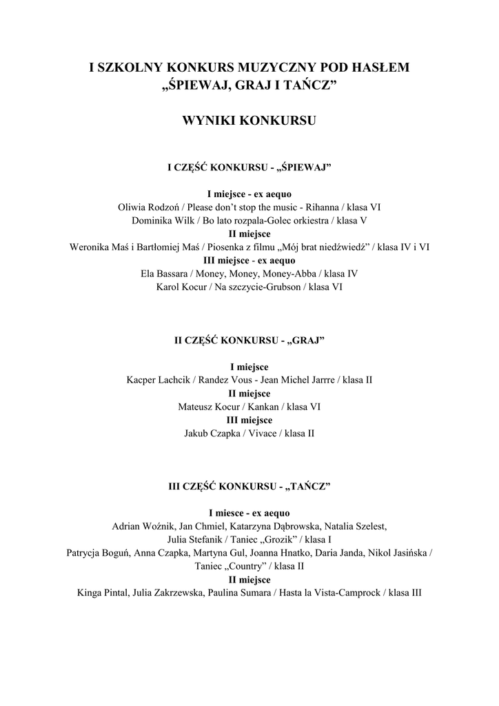 I SZKOLNY KONKURS MUZYCZNY POD HASŁEM „ŚPIEWAJ, GRAJ I TAŃCZ” WYNIKI KONKURSU I CZĘŚĆ KONKURSU - „ŚPIEWAJ” I miejsce - ex aequo Oliwia Rodzoń / Please don’t stop the music - Rihanna / klasa VI Dominika Wilk / Bo lato rozpala-Golec orkiestra / klasa V II miejsce Weronika Maś i Bartłomiej Maś / Piosenka z filmu „Mój brat niedźwiedź” / klasa IV i VI III miejsce - ex aequo Ela Bassara / Money, Money, Money-Abba / klasa IV Karol Kocur / Na szczycie-Grubson / klasa VI II CZĘŚĆ KONKURSU - „GRAJ” I miejsce Kacper Lachcik / Randez Vous - Jean Michel Jarrre / klasa II II miejsce Mateusz Kocur / Kankan / klasa VI III miejsce Jakub Czapka / Vivace / klasa II III CZĘŚĆ KONKURSU - „TAŃCZ” I miesce - ex aequo Adrian Woźnik, Jan Chmiel, Katarzyna Dąbrowska, Natalia Szelest, Julia Stefanik / Taniec „Grozik” / klasa I Patrycja Boguń, Anna Czapka, Martyna Gul, Joanna Hnatko, Daria Janda, Nikol Jasińska / Taniec „Country” / klasa II II miejsce Kinga Pintal, Julia Zakrzewska, Paulina Sumara / Hasta la Vista-Camprock / klasa III