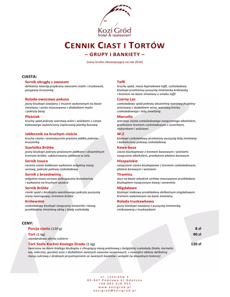 C ENNIK C IAST I T ORTÓW – GRUPY I BANKIETY – (ceny brutto obowiązujące na rok 2016) CIASTA: Sernik okrągły z owocem Toffi delikatny twaróg przybrany owocami malin i truskawek, posypany kruszonką kruchy spód, masa kajmakowa toffi, czekoladowy biszkopt przełożony puszystą śmietanką królewską i kremem na bazie śmietany o smaku toffi Rolada owocowa pokusa Czarny Las jasny biszkopt zawijany z musem wykonanym na bazie śmietany i serka mascarpone z dodatkiem malin i pokryty bezą czekoladowy spód pokryty aksamitną warstwą frużeliny wiśniowej z dodatkiem wina, warstwą kremu czekoladowego i bitą śmietaną Pleśniak Marcello kruchy spód pokryty warstwą wiśni i wiórkami z ciasta kakaowego wykończony zapieczoną pianką bezową warstwy ciasta czekoladowego nasączonego alkoholem, przełożone kremem czekoladowym z orzechami, rodzynkami i wiśniami Jabłecznik na kruchym cieście W-Z kruche ciasto i aromatycznie prażone jabłka pokryte kruszonką biszkopt czekoladowy przełożony puszystą bitą śmietaną i wykończony polewą czekoladową Szarlotka Brûlée Kawa-beza jasny biszkopt pokryty prażonymi jabłkami i aksamitnym kremem brûlée, udekorowany jabłkami w żelu ciasto biszkoptowe z kremem kawowym i wiśniami nasączone alkoholem, przełożone płatem bezowym Sernik Izaura Hiszpańskie ciemne ciasto babkowe wyłożone wilgotną masą serową, pokryte polewą czekoladową nasączone ciasto biszkoptowe z kremem czekoladowym, płatem bezowym i wiśniami Sernik z brzoskwinią Tiramisu wilgotna masa serowa wzbogacona brzoskwinią i wyłożona na kruchym spodzie mus na bazie włoskich serków mascarpone przekładany biszkoptem nasączonym kawą i amaretto Sernik Brûlée Migdałowe cienki spód z biszkoptu waniliowego pokryty puszystą masą twarogową i kremem brûlée biszkopt makowy przekładany delikatnym migdałowym kremem wykonanym na bazie śmietany Królewskie Rolada truskawkowa czekoladowy biszkopt nasączony amaretto i kawą, przekładany śmietaną ubitą z białą czekoladą jasny biszkopt zawijany z puszystą śmietanką zmiksowaną z truskawkami CENY: Porcja ciasta (120 g) Tort (1 kg) 8 zł 90 zł standardowa oferta cukierni Tort Szefa Kuchni Koziego Grodu (1 kg) tworzony na bazie białego biszkoptu z chrupiącą masą pralinową z belgijskiej czekolady (biała, karmelowa, mleczna, gorzka) oraz z dodatkiem świeżych owoców sezonowych, z zewnątrz oblany delikatną masą cukrową z drobnym przystrojeniem ze świeżych kwiatów i wstążki (w dowolnym kolorze) ul. Leśników 3 83-047 Pomlewo k/ Gdańska +48 601 610 453 www.kozigrod.pl [email protected] 120 zł