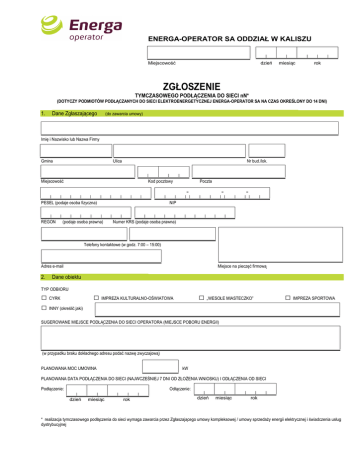 ENERGA-OPERATOR SA ODDZIAŁ W KALISZU Miejscowość dzień miesiąc rok ZGŁOSZENIE TYMCZASOWEGO PODŁĄCZENIA DO SIECI nN* (DOTYCZY PODMIOTÓW PODŁĄCZANYCH DO SIECI ELEKTROENERGETYCZNEJ ENERGA-OPERATOR SA NA CZAS OKREŚLONY DO 14 DNI) 1. Dane Zgłaszającego (do zawarcia umowy) Imię i Nazwisko lub Nazwa Firmy Gmina Ulica Nr bud./lok. Miejscowość Kod pocztowy Poczta PESEL (podaje osoba fizyczna) REGON (podaje osoba prawna) - - NIP Numer KRS (podaje osoba prawna) Telefony kontaktowe (w godz. 7:00 – 15:00) Adres e-mail 2. Miejsce na pieczęć firmową Dane obiektu TYP ODBIORU □ CYRK □ INNY (określić jaki) □ IMPREZA KULTURALNO-OŚWIATOWA □ „WESOŁE MIASTECZKO” □ IMPREZA SPORTOWA SUGEROWANE MIEJSCE PODŁĄCZENIA DO SIECI OPERATORA (MIEJSCE POBORU ENERGII) (w przypadku braku dokładnego adresu podać nazwę zwyczajową) PLANOWANA MOC UMOWNA kW PLANOWANA DATA PODŁĄCZENIA DO SIECI (NAJWCZEŚNIEJ 7 DNI OD ZŁOŻENIA WNIOSKU) I ODŁĄCZENIA OD SIECI Podłączenie: Odłączenie: dzień miesiąc rok dzień miesiąc rok * realizacja tymczasowego podłączenia do sieci wymaga zawarcia przez Zgłaszającego umowy kompleksowej / umowy sprzedaży energii elektrycznej i świadczenia usług dystrybucyjnej 3. Dodatkowe uwagi Zgłaszającego Oświadczenie Wyrażam zgodę na przetwarzanie danych osobowych przez ENERGA-OPERATOR S.A do celów niezbędnych do realizacji tymczasowego podłączenia do sieci, zgodnie z ustawą z dnia 29 sierpnia 1997 r. o ochronie danych osobowych (tekst jednolity: Dz.U. z 2004 r. Nr 101, poz. 926, z późn. zm.) 4. Podpis Zgłaszającego Załączniki - Szkic sytuacyjny, określający usytuowanie podłączanego obiektu względem istniejącej sieci oraz usytuowanie sąsiednich obiektów. - Oświadczenie o Gotowości Instalacji Przyłączanej - Dodatkowe załączniki: ………………………………………………………………………………………………………………………………………………………………….……… Dane adresowe jednostek przyjmujących wnioski o określenie warunków przyłączenia do sieci elektroenergetycznej ENERGA-OPERATOR SA: • • Oddział w Kaliszu, Rejon Dystrybucji w Kalisz Al. Wojska Polskiego 35, 62-800 Kalisz Oddział w Kaliszu, Rejon Dystrybucji w Kępnie ul. Młyńska 10, 63-600 Kępno Oddział w Kaliszu, Rejon Dystrybucji w Koninie ul. Kleczewska 41, 62-510 Konin Oddział w Kaliszu, Rejon Dystrybucji w Kole ul. Toruńska 96, 62-600 Koło • • • • • • Oddział w Kaliszu, Rejon Dystrybucji w Ostrowie Wielkopolskim ul. Zamenhofa 2, 63-400 Ostrów Wielkopolski Oddział w Kaliszu, Rejon Dystrybucji w Jarocinie ul. Batorego 26, 63-200 Jarocin Oddział w Kaliszu, Rejon Dystrybucji w Turku ul. Górnicza 14, 62-700 Turek Oddział w Kaliszu, Rejon Dystrybucji w Słupcy ul. Prusa 3, 62-400 Słupca 5. Zlecenie wykonania usługi (w przypadku możliwości tymczasowego podłączenia do sieci) Zlecam wykonanie usługi „Przerwanie i wznowienie dostarczania energii” na napięciu nN, zgodnie z opłatą określoną w Taryfie ENERGAOPERATOR SA, w celu realizacji niniejszego zgłoszenia. Podpis Zgłaszającego UWAGA: Wnioski należy przesyłać/składać do jednostki, na której obszarze planowane jest podłączenie do sieci. Punkty od 6 do 8 wypełnia ENERGA-OPERATOR SA TECHNICZNE WARUNKI PODŁĄCZENIA 6. Zakres czynności niezbędnych do podłączenia obiektu do sieci □ Istnieje możliwość podłączenia 7. □ Brak możliwości podłączenia Proponowany sposób rozliczania energii elektrycznej □ ryczałt □ wg wskazań układu pomiarowego 8. Informacje dodatkowe dotyczące miejsca podłączenia Miejsce podłączenia: Stacja: ; Słup: Obwód: ; Złącze: Wielkość zabezpieczenia przedlicznikowego: Miejsce dostarczenia energii elektrycznej: Pieczątka i podpis upoważnionego pracownika ENERGA-OPERATOR SA