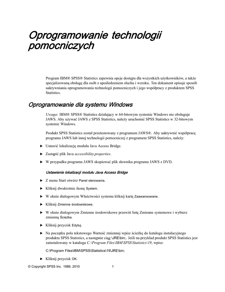 Oprogramowanie technologii pomocniczych Program IBM® SPSS® Statistics zapewnia opcje dostępu dla wszystkich użytkowników, a także specjalizowaną obsługę dla osób z upośledzeniem słuchu i wzroku. Ten dokument opisuje sposób uaktywniania oprogramowania technologii pomocniczych i jego współpracy z produktem SPSS Statistics. Oprogramowanie dla systemu Windows Uwaga: IBM® SPSS® Statistics działający w 64-bitowym systemie Windows nie obsługuje JAWS. Aby używać JAWS z SPSS Statistics, należy uruchomić SPSS Statistics w 32-bitowym systemie Windows. Produkt SPSS Statistics został przetestowany z programem JAWS®. Aby uaktywnić współpracę programu JAWS lub innej technologii pomocniczej z programem SPSS Statistics, należy: E Ustawić lokalizację modułu Java Access Bridge. E Zastąpić plik Java accessibility.properties. E W przypadku programu JAWS skopiować plik słownika programu JAWS z DVD. Ustawienie lokalizacji modułu Java Access Bridge E Z menu Start otwórz Panel sterowania. E Kliknij dwukrotnie ikonę System. E W oknie dialogowym Właściwości systemu kliknij kartę Zaawansowane. E Kliknij Zmienne środowiskowe. E W oknie dialogowym Zmienne środowiskowe przewiń listę Zmienne systemowe i wybierz zmienną Ścieżka. E Kliknij przycisk Edytuj. E Na początku pola tekstowego Wartość zmiennej wpisz ścieżkę do katalogu instalacyjnego produktu SPSS Statistics, a następnie ciąg \JRE\bin;. Jeśli na przykład produkt SPSS Statistics jest zainstalowany w katalogu C:\Program Files\IBM\SPSS\Statistics\19, wpisz: C:\Program Files\IBM\SPSS\Statistics\19\JRE\bin; E Kliknij przycisk OK. © Copyright SPSS Inc. 1989, 2010 1 2 Oprogramowanie technologii pomocniczych Zastąpienie domyślnego pliku Java accessibility.properties E Przejdź do folderu \JRE\lib w folderze instalacyjnym produktu SPSS Statistics. Jeśli na przykład produkt SPSS Statistics jest zainstalowany w folderze C:\Program Files\IBM\SPSS\Statistics\19, przejdź do folderu C:\Program Files\IBM\SPSS\Statistics\19\JRE\lib. E Zmień nazwę pliku accessibility.properties lub przenieś go do innego folderu. E Przejdź do folderu Windows/Accessibility na DVD i skopiuj plik accessibility.properties. E Wklej plik do folderu \JRE\lib w folderze instalacyjnym produktu SPSS Statistics. Moduł Java Access Bridge zostanie załadowany przy następnym uruchomieniu produktu SPSS Statistics. Kopiowanie pliku słownika programu JAWS Został utworzony nowy plik słownika do wykorzystania z programem JAWS 8.0. Nie został on przetestowany z innymi wersjami programu JAWS. Choć nie ma konieczności używania pliku słownika, zawiera on prawidłową wymowę terminów statystycznych, które są nieprawidłowo odtwarzane przez program JAWS. Dodatkowo umożliwia on usunięcie “kresek” z pewnych terminów. Na przykład jeśli używany jest plik słownika, termin „chi-kwadrat” jest odczytywany jako „chi kwadrat”, a nie „chi kreska kwadrat”. E Przejdź do folderu Windows/Accessibility na DVD i skopiuj plik .jdf. E Wklej plik do folderu, który zawiera pliki skryptów programu JAWS dla produktu . E Uruchom program JAWS. E Uruchom produkt SPSS Statistics. E Otwórz plik danych. E Z menu wybierz kolejno następujące pozycje: Analiza > Test t dla jednej próby Jeśli używany jest plik słownika, program JAWS odczyta „Test t dla jednej próby” zamiast „Test t jednej kreska próby”. Oprogramowanie dla systemu Mac OS W systemie Mac OS dostępny jest program VoiceOver, będący interfejsem ułatwień dostępu, umożliwiającym odczytywanie zawartości ekranu. Program VoiceOver posiada wbudowaną obsługę języka Java, nie jest więc wymagana specjalna konfiguracja. Dalsze informacje można uzyskać w pomocy systemu Mac. 3 Oprogramowanie technologii pomocniczych Oprogramowanie dla systemu Linux System Linux udostępnia wiele opcji odczytywania zawartości ekranu. Aby można było używać oprogramowania do odczytywania zawartości ekranu, należy najpierw zainstalować i uaktywnić moduł Java Access Bridge. Więcej informacji można uzyskać w dokumentacji dystrybucji systemu.