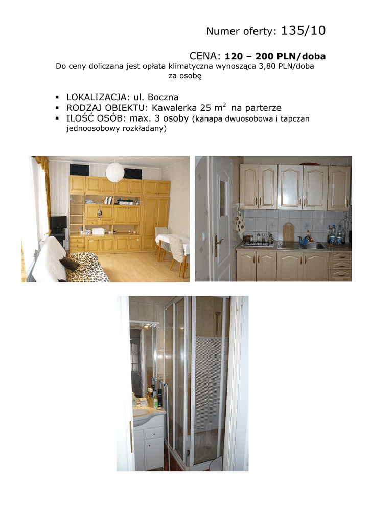 Numer oferty: 135/10 CENA: 120 – 200 PLN/doba Do ceny doliczana jest opłata klimatyczna wynosząca 3,80 PLN/doba za osobę LOKALIZACJA: ul. Boczna RODZAJ OBIEKTU: Kawalerka 25 m2 na parterze ILOŚĆ OSÓB: max. 3 osoby (kanapa dwuosobowa i tapczan jednoosobowy rozkładany) Numer oferty: 135/10 LOKALIZACJA: u. Boczna Lp. PRZEDMIOT OCENY UWAGI 1. Nowe/stare budownictwo Kamienica, wejście przez ogródek 2. Nowe/stare meble Mieszane 3. Parking na posesji/GaraŜ MoŜna parkować przed posesją 4. Balkon / taras / ogródek Weranda 5. Telewizor (Kablówka, TV Sat), Radio TV kablowa 6. Dostęp do telefonu Nie 7. Dostęp do internetu Internet bezprzewodowy Kuchnia Aneks kuchenny łączony z pokojem wyposaŜony w: lodówka, dwupalnikowa kuchenka, czajnik elektryczny, sztućce, zastawa i garnki. 9. Łazienka Łazienka z kabiną prysznicową oraz WC 10. Pościel, ręczniki Tak 11. Dostęp do szafy / półek Tak 12. Pobyt ze zwierzątkiem Do uzgodnienia 14. Niepełnosprawni (winda, podjazd) Obiekt nie przystosowany 15. Plac zabaw dla dzieci Nie 16. 17. Lokalizacja • Centrum – Dworzec PKP • PlaŜa, park • Dzielnica • Komunikacja miejska Osoby palące 18. Piwnica/schowek 19. Faktura VAT lub Rachunek 20. Inne 8. Spokojna ulica odchodząca od głównej ulicy Al. Niepodległości, 10 minut pieszo do deptaka ul. Bohaterów Monte Cassino, 15minut do plaŜy Nie