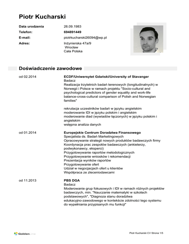 Piotr Kucharski Data urodzenia 26.09.1983 Telefon: 694891449 E-mail: [email protected] Adres: Inżynierska 47a/9 Wrocław Cała Polska Doświadczenie zawodowe od 02.2014 ECDF/Uniwersytet Gdański/University of Stavanger Badacz Realizacja trzyletnich badań terenowych (longitudinalnych) w Norwegii i Polsce w ramach projektu "Socio-cultural and psychological predictors of gender equality and work-life balance-cross-cultural comparison of Polish and Norwegian families" rekrutacja uczestników badań w języku angielskim moderowanie IDI w języku polskim i angielskim moderowanie diad (wywiadów łączonych) w języku polskim i angielskim wstępna analiza danych od 01.2014 Europejskie Centrum Doradztwa Finansowego Specjalista ds. Badań Marketingowych Opracowywanie strategii nowych produktów badawczych firmy Koordynacja prac zespołów badawczych (ankieterzy, podwykonawcy, eksperci) Przygotowywanie raportów metodologicznych Przygotowywanie wniosków i rekomendacji Prezentacja wyników raportów Przygotowywanie ofert Udział w negocjacjach ofert u klientów Współpraca ze zleceniodawcami od 11.2013 PBS DGA Badacz Moderowanie grup fokusowych i IDI w ramach różnych projektów badawczych, min. "Nauczanie matematyki w szkołach podstawowych", "Diagnoza stanu doradztwa edukacyjno-zawodowego w kontekście zdolności tego systemu do wypełniania przypisanych mu funkcji" Piotr Kucharski CV Strona 1/5 Doświadczenie zawodowe od 07.2013 Pracownia Badań Marketingowych PBM Badacz/Analityk Koordynacja ilościowych i jakościowych projektów badawczych (min. "Badania nad energią odnawialną", "Badanie dużych firm rodzinnych"), tworzenie, weryfikacja i translacja narzędzi badawczych, analiza danych, przygotowywanie raportów badawczych, kwerenda i tłumaczenie literatury anglojęzycznej, rekrutacja członków zespołu badawczego od 06.2013 Wyższa Szkoła Promocji w Warszawie Wykładowca Prowadzenie wykładów i zajęć dla studentów pt. ,,Konsumpcja Muzyki"; opracowanie programu wykładów i zajęć, analiza literatury anglojęzycznej, przygotowywanie treści ćwiczeń motywujących od 12.2012 BIMO Manager Menadżer w niezależnej wytwórni muzycznej odpowiedzialny za analizę rynku, kontakt z dziennikarzami, promotorami, agencjami koncertowymi, tworzenie strategii promocji od 12.2013 do 12.2013 Instytut Rzeźby Społecznej/Ministerstwo Kultury i Dziedzictwa Narodowego Ekspert Ekspert w panelu eksperckim poświęconym projektowi badawczemu ,,Inicjatywy społeczne i kulturalne angażujące seniorów-diagnoza i ewaluacja na Dolnym Śląsku". Udział w dyskusji panelowej, opracowanie wniosków i rekomendacji metodologicznych dla dalszych badań, stworzenie autorskiej typologii inicjatyw skierowanych do seniorów od 12.2013 do 12.2013 Uczelnia Heleny Chodkowskiej Wykładowca Wykłady z tematyki "Współczesne społeczeństwa konsumpcyjne/prosumpcyjne" od 02.2013 do 06.2013 WM Group Legal Badacz/Analityk Przygotowanie i przeprowadzenie audytu komunikacyjnego, opracowanie koncepcji badań, stworzenie scenariusza wywiadów pogłębionych i fokusowych, przeprowadzenie wywiadów z pracownikami kancelarii prawnej, analiza danych, przygotowanie raportu Piotr Kucharski CV Strona 2/5 Doświadczenie zawodowe od 02.2013 do 03.2013 Uniwersytet Wrocławski, Instytut Socjologii Badacz/Analityk Analiza danych w ramach jakościowego projektu badawczego ,,Socjokulturowe i prawne aspekty współczesnego marketingu, zarządzania, rynku i zachowań konsumenckich" od 06.2012 do 08.2012 Wydawnictwo Prasowe BPV Badacz/Analityk Projektowanie i realizacja badań fokusowych dotyczących czytelnictwa czasopism młodzieżowych ,,Popcorn" i ,,Dziewczyna" , analiza jakościowa profilu miesięcznika muzycznego ,,Popcorn", opracowanie autorskiego projektu zmian, przygotowanie raportu analitycznego od 05.2011 do 04.2012 Wyższa Szkoła Bankowa we Wrocławiu Badacz/Analityk/Wykładowca Prowadzenie zajęć (PR, Komunikacja Społeczna) i wykładów (Metody Badań Społecznych) ze studentami; organizacja i realizacja badań fokusowych w ramach projektu badawczego pt. ,,Działania informacyjne członków gospodarstwa domowego a jego zachowania gospodarcze", rekrutacja uczestników badań, sporządzenie raportu badawczego od 02.2011 do 12.2012 Uniwersytet Wrocławski, Instytut Socjologii Badacz/Analityk Realizacja autorskiego projektu badawczego pt. ,,Społeczne i rynkowe znaczenia muzyki popularnej"; opracowanie koncepcji badań, przygotowanie scenariusza wywiadów pogłębionych, konsultacje metodologiczne z międzynarodowym gronem badaczy, przeprowadzenie 90 wywiadów pogłębionych, transkrypcja, kodowanie i analiza danych, przygotowanie raportu analitycznego, prezentacja wyników podmiotom medialnym od 09.2007 do 12.2012 Uniwersytet Wrocławski, Instytut Socjologii Badacz/Analityk/Wykładowca Uczestnictwo w projektach badawczych i analitycznych, prowadzenie zajęć i wykładów ze studentami, wystąpienia i prezentacje konferencyjne, nawiązywanie kontaktów i współpraca z międzynarodowym środowiskiem badaczy, organizacja konferencji, opracowywanie publikacji naukowych, prace administracyjne na rzecz Instytutu Socjologii od 11.2006 do 12.2006 Urząd Statystyczny we Wrocławiu Praktykant Obsługa petentów w Dziale Rejestrów, praca w archiwum urzędowym, rejestracja podmiotów gospodarczych, prace biurowe Piotr Kucharski CV Strona 3/5 Doświadczenie zawodowe od 06.2006 do 07.2006 Uniwersytet Wrocławski Praktykant Udział w projekcie badawczym ,,Marketing lokalny w Bieszczadach": przeprowadzanie wywiadów kwestionariuszowych i wywiadów narracyjnych; rekrutacja uczestników badań. od 07.2004 do 08.2004 Uniwersytet Wrocławski Praktykant Udział w projekcie badawczym: "Habitus robotników śląskich": przeprowadzanie wywiadów narracyjnych; rekrutacja uczestników badań. Wykształcenie od 12.2012 Uniwersytet Wrocławski Socjologia/specjalizacja: socjologia muzyki i rynku doktorat od 10.2002 do 05.2007 Uniwersytet Wrocławski Socj