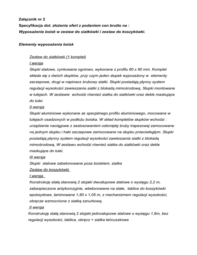 Załącznik nr 2 Specyfikacja dot. złożenia ofert z podaniem cen brutto na : Wyposażenie boisk w zestaw do siatkówki i zestaw do koszykówki. Elementy wyposażenia boisk Zestaw do siatkówki (1 komplet) I wersja Słupki stalowe, cynkowane ogniowo, wykonane z profilu 80 x 80 mm. Komplet składa się z dwóch słupków, przy czym jeden słupek wyposażony w elementy zaczepowe, drugi w napinacz śrubowy siatki. Słupki posiadają płynny system regulacji wysokości zawieszania siatki z blokadą mimośrodową. Słupki montowane w tulejach. W zestawie wchodzi również siatka do siatkówki oraz dekle maskujące do tulei. II wersja Słupki aluminiowe wykonane ze specjalnego profilu aluminiowego, mocowane w tulejach osadzonych w podłożu boiska. W skład kompletów słupków wchodzi : urządzenie naciągowe z zastosowaniem osłoniętej śruby trapezowej zamocowane na jednym słupku i haki zaczepowe zamocowane na słupku przeciwległym. Słupki posiadają płynny system regulacji wysokości zawieszania siatki z blokadą mimośrodową. W zestawu wchodzi również siatka do siatkówki oraz dekle maskujące do tulei. III wersja Słupki stalowe zabetonowane poza boiskiem, siatka Zestaw do koszykówki I wersja Konstrukcję stałą stanowią 2 stojaki dwusłupowe stalowe o wysięgu 2,2 m, zabezpieczone antykorozyjnie, wbetonowane na stałe, tablice do koszykówki epoksydowe, laminowane 1,80 x 1,05 m, z mechanizmem regulacji wysokości, obręcze wzmocnione z siatką sznurkową. II wersja Konstrukcję stałą stanowią 2 stojaki jednosłupowe stalowe o wysięgu 1,6m, bez regulacji wysokości, tablica, obręcz + siatka łańcuszkowa Prosimy o złożenie ofert z podaniem cen brutto na Wyposażenie boisk : a/ Zestaw do siatkówki : - wersja I : ............... - wersja II : ............... - wersja III : ............... b/ Zestaw do koszykówki : - wersja I : .................. - wersja II : ................ Wycena brutto musi obejmować całość robót [materiał, robociznę, sprzęt, narzuty, podatek VAT]. OPIS SPOSOBU PRZYGOTOWANIA OFERTY Oferta powinna być: - opatrzona pieczątką firmową, - posiadać datę sporządzenia, - zawierać adres lub siedzibę oferenta, numer telefonu Oferty prosimy składać do dnia 16.05.2013r. do godz.1400 - osobiście lub pocztą na adres: Zespół Szkół Nr 2 ul. Wałowa 5 44-300 Wodzisław Śl. - elektronicznie: [email protected] - faxem: 32 4530144