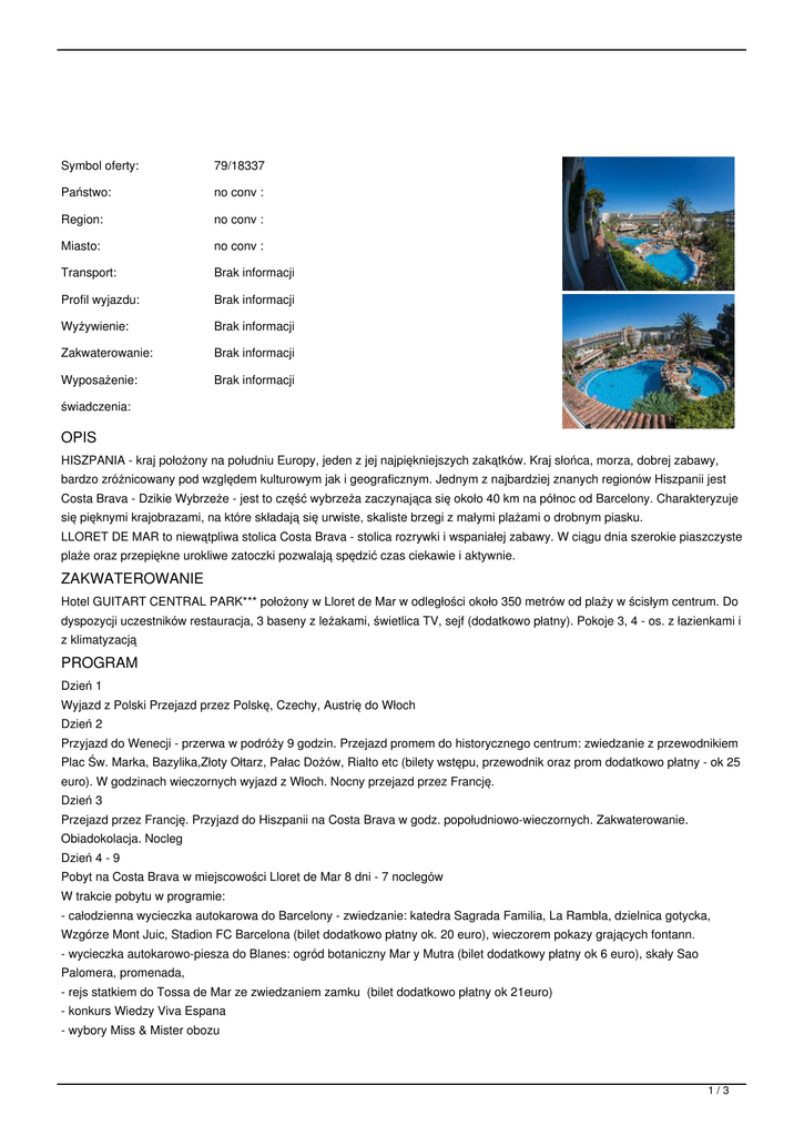 Symbol oferty: 79/18337 Państwo: no conv : Region: no conv : Miasto: no conv : Transport: Brak informacji Profil wyjazdu: Brak informacji Wyżywienie: Brak informacji Zakwaterowanie: Brak informacji Wyposażenie: Brak informacji świadczenia: OPIS HISZPANIA - kraj położony na południu Europy, jeden z jej najpiękniejszych zakątków. Kraj słońca, morza, dobrej zabawy, bardzo zróżnicowany pod względem kulturowym jak i geograficznym. Jednym z najbardziej znanych regionów Hiszpanii jest Costa Brava - Dzikie Wybrzeże - jest to część wybrzeża zaczynająca się około 40 km na północ od Barcelony. Charakteryzuje się pięknymi krajobrazami, na które składają się urwiste, skaliste brzegi z małymi plażami o drobnym piasku. LLORET DE MAR to niewątpliwa stolica Costa Brava - stolica rozrywki i wspaniałej zabawy. W ciągu dnia szerokie piaszczyste plaże oraz przepiękne urokliwe zatoczki pozwalają spędzić czas ciekawie i aktywnie. ZAKWATEROWANIE Hotel GUITART CENTRAL PARK*** położony w Lloret de Mar w odległości około 350 metrów od plaży w ścisłym centrum. Do dyspozycji uczestników restauracja, 3 baseny z leżakami, świetlica TV, sejf (dodatkowo płatny). Pokoje 3, 4 - os. z łazienkami i z klimatyzacją PROGRAM Dzień 1 Wyjazd z Polski Przejazd przez Polskę, Czechy, Austrię do Włoch Dzień 2 Przyjazd do Wenecji - przerwa w podróży 9 godzin. Przejazd promem do historycznego centrum: zwiedzanie z przewodnikiem Plac Św. Marka, Bazylika,Złoty Ołtarz, Pałac Dożów, Rialto etc (bilety wstępu, przewodnik oraz prom dodatkowo płatny - ok 25 euro). W godzinach wieczornych wyjazd z Włoch. Nocny przejazd przez Francję. Dzień 3 Przejazd przez Francję. Przyjazd do Hiszpanii na Costa Brava w godz. popołudniowo-wieczornych. Zakwaterowanie. Obiadokolacja. Nocleg Dzień 4 - 9 Pobyt na Costa Brava w miejscowości Lloret de Mar 8 dni - 7 noclegów W trakcie pobytu w programie: - całodzienna wycieczka autokarowa do Barcelony - zwiedzanie: katedra Sagrada Familia, La Rambla, dzielnica gotycka, Wzgórze Mont Juic, Stadion FC Barcelona (bilet dodatkowo płatny ok. 20 euro), wieczorem pokazy grających fontann. - wycieczka autokarowo-piesza do Blanes: ogród botaniczny Mar y Mutra (bilet dodatkowy płatny ok 6 euro), skały Sao Palomera, promenada, - rejs statkiem do Tossa de Mar ze zwiedzaniem zamku (bilet dodatkowo płatny ok 21euro) - konkurs Wiedzy Viva Espana - wybory Miss & Mister obozu 1/3 - plażowanie - gry i zabawy integracyjne, rozgrywki sportowe Dzień 10 Śniadanie. Wykwaterowanie z hotelu ok. godziny 11.00. Złożenie bagaży. Obiad. Pobranie suchego prowiantu na drogę powrotną. Wyjazd z Hiszpanii w godz. popołudniowo-wieczornych. (ok 16-18.00) Przejazd przez Francję. Późnym wieczorem, w zależności od czasu przejazdu, zwiedzanie Monaco i Monte Carlo. Dalszy przejazd do Włoch. Dzień 11 Przejazd przez Włochy w okolice Werony - całodzienna zabawa nad jeziorem Garda w Parku Rozrywki GARDALAND (bilet dodatkowo płatny ok. 25-27 ?, czas pobytu 9 godzin). Wieczorem wyjazd z Włoch. Przejazd przez Austrię. Dzień 12 Przejazd przez Austrię, Czechy. Przyjazd do Polski w godzinach przedpołudniowych zgodnie z rozkładem jazdy. WYŻYWIENIE Hiszpania: 3 posiłki dziennie - bufet (śniadanie, obiad, kolacja). Pierwszym posiłkiem jest obiadokolacja w dniu przyjazdu do Lloret, ostatnim obiad w dniu wyjazdu + suchy prowiant na drogę powrotną. W trakcie przejazdu wyżywienie we własnym zakresie. Napoje do obiadów i kolacji dodatkowo płatne. TRANSPORT Autokarem Autokar o podwyższonym standardzie (klimatyzacja, barek, WC). Wyjazdy z miast: LUBLIN - bez dopłat, WARSZAWA - 100.00 PLN,ŁÓDŹ - 100.00 PLN,RADOM - 50.00 PLN, KIELCE - 50.00 PLN,KRAKÓW - 50.00 PLN,KATOWICE - 50.00 PLN, GLIWICE - 50.00 PLN, RZESZÓW - 50 PLN. Trasa antenowa z Rzeszowa -tylko turns 2 i 4, realizowana przy grupie min. 35 osób FAKULTETY Program fakultatywny: - miasteczko wodne - ok. 30 ? - wieczór hiszpański -pokazy flamenco - ok. 26 ? - rejs statkiem ze szklanym dnem - ok. 21 ? - karnet na dyskoteki (min. 5 x) - ok. 26 ? (Uwaga: wejście na większość dyskotek od lat 16 - wymagany dokument tożsamości) UBEZPIECZENIE Ubezpieczenie AXA TUiR - KL (10000 eur), NW (2000 eur), bagaż (200 eur) OBOWIĄZKOWA OPŁATA W EURO Obligatoryjne bilety wstępu (Wenecja oraz Gardaland) ok. 50 euro. Opłata turystyczna Lloret de Mar dodatkowo płatna w hotelu - 5 euro /pobyt dla osób powyżej 16 roku życia. UWAGI Podczas podróży jedzenie we własnym zakresie. Zalecane minimalne kieszonkowe ok. 70-100 Euro Uczestnik zobowiązany jest do posiadania ważnego dokumentu tożsamości - dowodu lub paszportu. Warunek wyjazdu. W związku z wprowadzeniem w Katalonii opłaty turystycznej, klienci powyżej 16 roku życia zobowiązani są wnieść tę opłatę na recepcji hotelu w wysokości 5€/pobyt. Na trasach krajowych istnieje możliwość przejazdu autokarem o niższym standardzie lub mikrobusem oraz możliwość ewentualnych przesiadek z tym związanych. Biuro zastrzega sobie możliwość odwołania bez żadnych konsekwencji transportu z danej miejscowości w przypadku zbyt małej liczby uczestników (minimum 8 osób) chyba, że jest podane inna informacja w rozkładzie jazdy. Zbiórka uczestników 15 minut przed godziną odjazdu. Godziny odjazdów i powrotów są uzależnione od warunków drogowych i kolejek na przejściach TERMINY: 2/3 CENNIK: Długość pobytu: dni Grupa cenowa: Waluta: PLN Aktualne ceny z systemu S.A.R.T. (-) - cena usługi, podatku kalkulowana przy osobie lub gratis (*) - kwota wliczona w cenę standardową 3/3