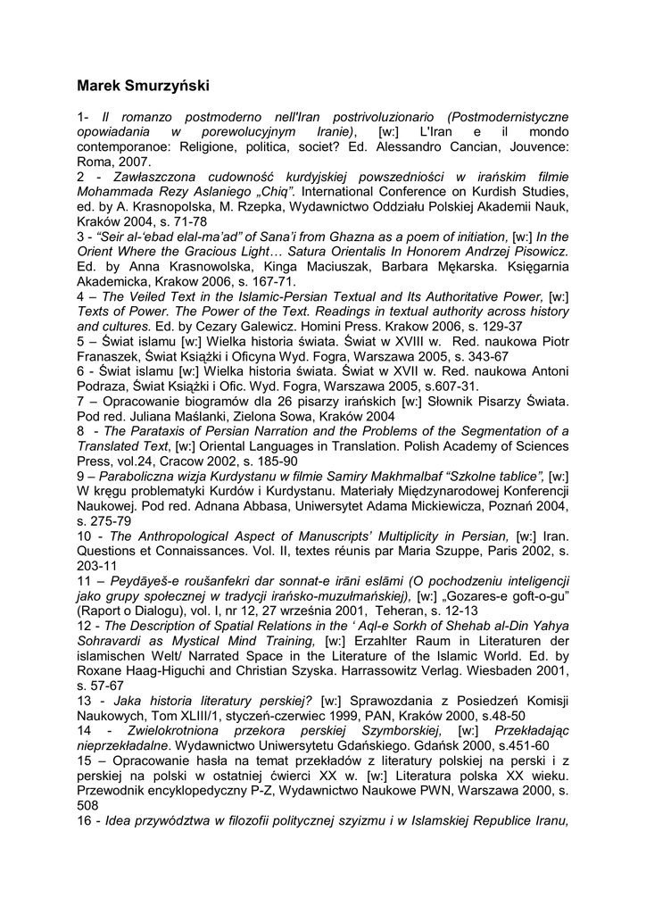 Marek Smurzyński 1- Il romanzo postmoderno nell'Iran postrivoluzionario (Postmodernistyczne opowiadania w porewolucyjnym Iranie), [w:] L'Iran e il mondo contemporanoe: Religione, politica, societ? Ed. Alessandro Cancian, Jouvence: Roma, 2007. 2 - Zawłaszczona cudowność kurdyjskiej powszedniości w irańskim filmie Mohammada Rezy Aslaniego „Chiq”. International Conference on Kurdish Studies, ed. by A. Krasnopolska, M. Rzepka, Wydawnictwo Oddziału Polskiej Akademii Nauk, Kraków 2004, s. 71-78 3 - “Seir al-‘ebad elal-ma’ad” of Sana’i from Ghazna as a poem of initiation, [w:] In the Orient Where the Gracious Light… Satura Orientalis In Honorem Andrzej Pisowicz. Ed. by Anna Krasnowolska, Kinga Maciuszak, Barbara Mękarska. Księgarnia Akademicka, Krakow 2006, s. 167-71. 4 – The Veiled Text in the Islamic-Persian Textual and Its Authoritative Power, [w:] Texts of Power. The Power of the Text. Readings in textual authority across history and cultures. Ed. by Cezary Galewicz. Homini Press. Krakow 2006, s. 129-37 5 – Świat islamu [w:] Wielka historia świata. Świat w XVIII w. Red. naukowa Piotr Franaszek, Świat Książki i Oficyna Wyd. Fogra, Warszawa 2005, s. 343-67 6 - Świat islamu [w:] Wielka historia świata. Świat w XVII w. Red. naukowa Antoni Podraza, Świat Książki i Ofic. Wyd. Fogra, Warszawa 2005, s.607-31. 7 – Opracowanie biogramów dla 26 pisarzy irańskich [w:] Słownik Pisarzy Świata. Pod red. Juliana Maślanki, Zielona Sowa, Kraków 2004 8 - The Parataxis of Persian Narration and the Problems of the Segmentation of a Translated Text, [w:] Oriental Languages in Translation. Polish Academy of Sciences Press, vol.24, Cracow 2002, s. 185-90 9 – Paraboliczna wizja Kurdystanu w filmie Samiry Makhmalbaf “Szkolne tablice”, [w:] W kręgu problematyki Kurdów i Kurdystanu. Materiały Międzynarodowej Konferencji Naukowej. Pod red. Adnana Abbasa, Uniwersytet Adama Mickiewicza, Poznań 2004, s. 275-79 10 - The Anthropological Aspect of Manuscripts’ Multiplicity in Persian, [w:] Iran. Questions et Connaissances. Vol. II, textes réunis par Maria Szuppe, Paris 2002, s. 203-11 11 – Peydāyeš-e roušanfekri dar sonnat-e irāni eslāmi (O pochodzeniu inteligencji jako grupy społecznej w tradycji irańsko-muzułmańskiej), [w:] „Gozares-e goft-o-gu” (Raport o Dialogu), vol. I, nr 12, 27 września 2001, Teheran, s. 12-13 12 - The Description of Spatial Relations in the ‘ Aql-e Sorkh of Shehab al-Din Yahya Sohravardi as Mystical Mind Training, [w:] Erzahlter Raum in Literaturen der islamischen Welt/ Narrated Space in the Literature of the Islamic World. Ed. by Roxane Haag-Higuchi and Christian Szyska. Harrassowitz Verlag. Wiesbaden 2001, s. 57-67 13 - Jaka historia literatury perskiej? [w:] Sprawozdania z Posiedzeń Komisji Naukowych, Tom XLIII/1, styczeń-czerwiec 1999, PAN, Kraków 2000, s.48-50 14 - Zwielokrotniona przekora perskiej Szymborskiej, [w:] Przekładając nieprzekładalne. Wydawnictwo Uniwersytetu Gdańskiego. Gdańsk 2000, s.451-60 15 – Opracowanie hasła na temat przekładów z literatury polskiej na perski i z perskiej na polski w ostatniej ćwierci XX w. [w:] Literatura polska XX wieku. Przewodnik encyklopedyczny P-Z, Wydawnictwo Naukowe PWN, Warszawa 2000, s. 508 16 - Idea przywództwa w filozofii politycznej szyizmu i w Islamskiej Republice Iranu, [w:] Civitas. Studia z filozofii polityki, nr 3, Warszawa 1999, s. 167-89 17 - Panowanie islamu czy islam panujących?, [w:] Uniwersalizm praw człowieka. Zakład Krajów Pozaeuropejskich PAN. Wydawnictwo naukowe ASKON, Warszawa 1998, s. 271-83 18 - " Ognista mądrość" Sohravardiego (wstęp do przekładu), [w:] Znak, 512, 1998, s.83-85 19 – Wstęp w języku perskim do własnego tłumaczenia na perski wyboru poezji W. Szymborskiej „Adam-ha ru-ye pol” (Ludzie na moście). Nashr-e Markaz, Teheran 1997, s.9-24 20 - Hezar nokte-ye bariktatr az mu (Subtelności cieńsze od włosa – o problemach przekładu poezji W. Szymborskiej na perski), [w:] Negah-e nou, nr 34, Teheran 1997,s. 177-83 (Pismo kulturalno-literackie wyd. w Iranie) 21 - Tasavvorat-e kham-e motarjem az matn (Tłumacz i jego wyobrażenie oryginału. O przekładzie na perski polskich opowiadań z języka niemieckiego), [w:] Takapu, nr 9, miesiąc ordibeheszt 1373/ maj 1994, s. 43-8 (Pismo krytycznoliterackie wyd. w Iranie) 22 - Paradigms of Movement in Ali Shariati, [w:] Hemispheres, Studies on Cultures and Societes, nr 6, Warszawa 1989, s. 33-59 23 - Elementy klasycznej liryki perskiej we współczesnej noweli perskiej, [w:] Poetyka orientalna i jej recepcja w Europie. Red. A. Czapkiewicz. Kraków 1989, s. 155-70 24 - Granice jawnego i utajonego w kulturze perskiej, [w:] Przegląd Orientalistyczny, 2 (146), 1988, s. 159-66 25 - A Sententious Character of the Ghazal as its Structural Feature, [w:] Zagadnienia Rodzajów Literackich XXX, z.2 (60), Łódź 1987, s.61-9 26 - Akszepa jako chwyt litotetyczny. Ironia, [w:] Sprawozdania z Czynności i Posiedzeń Naukowych LTN, Rocz. XXX, 9, 1976 27 - Wstęp do rozważań nad indianizmem w twórczości poetów Młodej Polski, [w:] Prace Sekcji Indianistycznej Studenckiego Koła Naukowego Polonistów. Wydawnictwo UŁ, Łódź 1976, s.3-10 . Przekłady z perskiego na polski: 1- Shahab al-din Yahya Sohravardi, ‘Aql-e Sorkh,[w:] Znak 1998, 512(1) 2- Szahram Szejdai, Dominik,[w:] Studium. Jesień 1997 3- Czuka Czekad, Skaza na charakterze, [w:] Studium, j.w. 4- Sohrab Sepehri, Głosy u brzegu wód. Stowarzyszenie Literackie im. K.K. Baczyńskiego, Łódź 1994 Przekłady z polskiego na perski: 1- Dwa poematy Zbigniewa Herberta [w:] Kar-name, nr 31, miesiąc aban 1381/2002 (Pismo krytycznoliterackie wyd. w Iranie) 2- Adam-ha ru-ye pol. Wybór poezji Wisławy Szymborskiej. Nashr-e Markaz, Tehran 1997 3- Cztery wiersze Jacka Kaczmarskiego [w:] Negah-e Nou, nr 35, zima 1376/1997 (Pismo kulturalno-literackie wyd. w Iranie) 4- Wiersz Tadeusza Różewicza: Zasłony (Parde-ha) [w:] Gardun