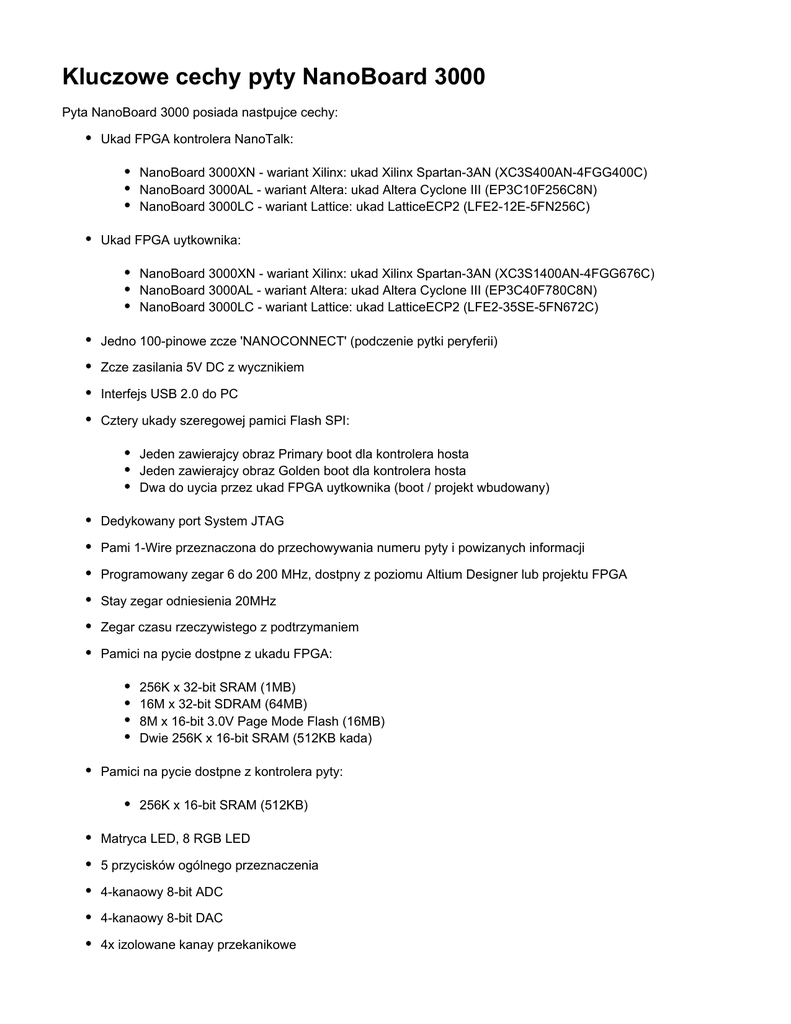 Kluczowe cechy pyty NanoBoard 3000 Pyta NanoBoard 3000 posiada nastpujce cechy: Ukad FPGA kontrolera NanoTalk: NanoBoard 3000XN - wariant Xilinx: ukad Xilinx Spartan-3AN (XC3S400AN-4FGG400C) NanoBoard 3000AL - wariant Altera: ukad Altera Cyclone III (EP3C10F256C8N) NanoBoard 3000LC - wariant Lattice: ukad LatticeECP2 (LFE2-12E-5FN256C) Ukad FPGA uytkownika: NanoBoard 3000XN - wariant Xilinx: ukad Xilinx Spartan-3AN (XC3S1400AN-4FGG676C) NanoBoard 3000AL - wariant Altera: ukad Altera Cyclone III (EP3C40F780C8N) NanoBoard 3000LC - wariant Lattice: ukad LatticeECP2 (LFE2-35SE-5FN672C) Jedno 100-pinowe zcze 'NANOCONNECT' (podczenie pytki peryferii) Zcze zasilania 5V DC z wycznikiem Interfejs USB 2.0 do PC Cztery ukady szeregowej pamici Flash SPI: Jeden zawierajcy obraz Primary boot dla kontrolera hosta Jeden zawierajcy obraz Golden boot dla kontrolera hosta Dwa do uycia przez ukad FPGA uytkownika (boot / projekt wbudowany) Dedykowany port System JTAG Pami 1-Wire przeznaczona do przechowywania numeru pyty i powizanych informacji Programowany zegar 6 do 200 MHz, dostpny z poziomu Altium Designer lub projektu FPGA Stay zegar odniesienia 20MHz Zegar czasu rzeczywistego z podtrzymaniem Pamici na pycie dostpne z ukadu FPGA: 256K x 32-bit SRAM (1MB) 16M x 32-bit SDRAM (64MB) 8M x 16-bit 3.0V Page Mode Flash (16MB) Dwie 256K x 16-bit SRAM (512KB kada) Pamici na pycie dostpne z kontrolera pyty: 256K x 16-bit SRAM (512KB) Matryca LED, 8 RGB LED 5 przycisków ogólnego przeznaczenia 4-kanaowy 8-bit ADC 4-kanaowy 8-bit DAC 4x izolowane kanay przekanikowe 4x sterownik mocy PWM Interfejs S/PDIF Czytniki kart SD (Secure Digital): Jeden, uywany przez kontroler pyty Jeden, uywany przez ukad FPGA uytkownika Dwa 18-kanaowe (20 pin) zcza wejcia / wyjcia z wyborem napicia zasilania Obszar prototypowy dla uytkownika Interfejs SVGA (24-bit, 80MHz) Interfejs 10/100 Fast Ethernet Interfejs USB 2.0 High-Speed RS-232 Serial Port - DB9M RS-485 Serial Port - 'RJ45' Port myszy PS/2 Mini-DIN Port klawiatury PS/2 Mini-DIN Kolorowy wywietlacz LCD 240x320 z ekranem dotykowym 8-segmentowy przecznik DIP-switch Hub USB: 3 zcza USB A kontroler ISP1760 Wzmacniacz audio stereo 2W z wejciem mini jack 3.5mm i regulacj gonoci 24-bit kodek audio stereo z interfejsem I2S Mikser audio Zcza audio stereo (mini jack 3.5mm): Line In / Line Out Suchawki Diody LED statusu kontrolera i ukadu FPGA