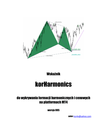 Wskaźnik korHarmonics do wykrywania formacji harmonicznych i cenowych na platformach MT4 wersja 005 autor: [email protected] Historia wersji Data Wersja 14/02/2009 001T Opis zmian Wstępnie o wskaźniku i jego funkcjonalności. 22/02/2009 002T Dodane kolejne formacje (3Drives, I+3Drives, I+SHS (idealny RGR), formacja 5-0), zmiana szaty graficznej, opis planów na kolejne wersje. Dużo zmian i usprawnień. Zmiana jakościowa i ilościowa. Optymalizacja defaultowych parametrów i template’ów. Prognozowanie punktu D, formacje wyłaniające się, definiowalny MinSwing, i wiele innych usprawnień. 01/05/2009 003T 16/05/2009 004T 05/08/2009 005T korHarmonics z www.TradingArsenal.com 2 / 33 Spis treści Historia wersji..................................................................................................................... 2 Spis treści ............................................................................................................................ 3 1. Wstęp......................................................................................................................... 4 2. Lista wykrywanych formacji w wersji Trial ............................................................. 5 3. Parametry wskaźnika................................................................................................. 8 4. Funkcjonalność wskaźnika...................................................................................... 13 ZIGZAG........................................................................................................................ 13 Ustawienia wskaźnika i informacje o znalezionych formacjach .................................. 15 Informacja o wersji i kontakt ........................................................................................ 16 Wyszukiwanie formacji w historii ................................................................................ 16 Wyszukiwanie w czasie rzeczywistym ......................................................................... 18 Support dla białego tła .................................................................................................. 20 Projekcja punktu D dla formacji ABCD i XABCD...................................................... 21 Wczesne wykrywanie formacji –formacje wyłaniające się .......................................... 22 Konfiguracja defaultowych wartości MinSwinga ........................................................ 23 5. Integracja ze wskaźnikiem korSigMonitor.............................................................. 24 6. Powiadomienia, alarmy i błędy ............................................................................... 25 7. Często zadawane pytania i odpowiedzi................................................................... 28 8. Informacje o wersjach korHarmonics ..................................................................... 29 9. Kandydaci na kolejne wersje wskaźnika................................................................. 31 10. Instalacja i konfiguracja .......................................................................................... 32 korHarmonics z www.TradingArsenal.com 3 / 33 1. Wstęp korHarmonics jest wskaźnikiem napisanym w mq4 dla platformy Metatrader4 (MT4). Służy do automatycznego wykrywania i prezentowania formacji harmonicznych na rynkach obsługiwanych przez platformę. Dla użytkownika/inwestora onacza to: - możliwość monitorowania wielu rynków, instrumentów, skal czasowych - możliwość zdefiniowania zbioru formacji do obserwcji - bezpieczeństwo, iż wystąpienie każdej formacji zostanie zauważone a inwestor odpowiednio powiadomiony - w końcu, spędzanie mniejszej ilości czasu przed komputerem, a mimo tego nie tracenie okazji. Rynek się ciągle i to ciągle powtarza. Na każdej skali czasowej. Nic nowego nie rysuje i nic nowego nie będzie rysował. Kwestia tylko zauważyć, zapamiętać i wyłapywać kolejne powtórzenia. Ten wskaźnik w tym pomaga. Żaden wskaźnik nie zastąpi doświadczenia gracza. Niektóre znalezione formacje są już na pierwszy rzut oka kompletnym 'NIE-GRAM-TEGO'. Niektóre wyglądają dobrze, ale nie sprawdzają się. Trzeba się nauczyć co grać a co jednak omijać. Na www.tradingarsenal.com znajduje się Forum, a jeden z wątków będzie poświęcony wskaźnikowi. Tutaj można zadawać pytania, szukać odpowiedzi, dzielić się opisami i zdjęciami ze swoich zagrań. Tutaj też będą trafiać informacje odnośnie nowych wersji i komentarze dotyczące Waszych pomysłów. Stworzyłem publiczny skype chat dotyczący harmoniczności i wskaźnika: http://www.skype.com/go/joinpublicchat?skypename=kor4x_skype&topic=Harmonic%2 0Trading%20and%20korHarmonics&blob=2bXI9o4oMkOFwnglppk1qIg_hKRauqUlKE PmajKeAsF8yQyB8JARytoCMOCFJ2WC_8cHkpaAEmcluKQ Wraz z każdą wersją rośnie funkcjonalność wskaźnika. Na chwilę obecną jest to: 1. Automatyczne wykrywanie i wyświetlanie formacji harmonicznych i cenowych w czasie rzeczywistym (lista poniżej). 2. Zliczanie i prezentowanie formacji historycznych. 3. Działanie na różnych instrumentach i rynkach (parach Forex, akcjach, indeksach) udostępnianych przez brokerów na platformach Metatrader. 4. Wczesna identyfikacja formacji wyłaniających się („Emerging patterns”). 5. Alerty i alarmy dźwiękowe. 6. Wybór wyszukiwania tylko ulubionych formacji. 7. ZIGZAG i zależności ceny i czasu pomiędzy wierzchołkami. 8. Template’y z ustawieniami parametrów. 9. Funkcjonalność defaultowego MinSwinga, stąd bardzo proste użycie wskaźnika. Możliwość definiowania w pliku konfiguracyjnym defaultowych MinSwingów dla dowolnych instrumentów. 10. Automatyczne zgrywanie znalezionych formacji do plików GIF. 11. Integracja ze wskaźnikiem korSigMonitor by umożliwić monitorowanie wystąpienia formacji na wielu parach i skalach czasowych (TF) jednocześnie. Automatyczne zgrywanie sygnałów o znalezionych formacja