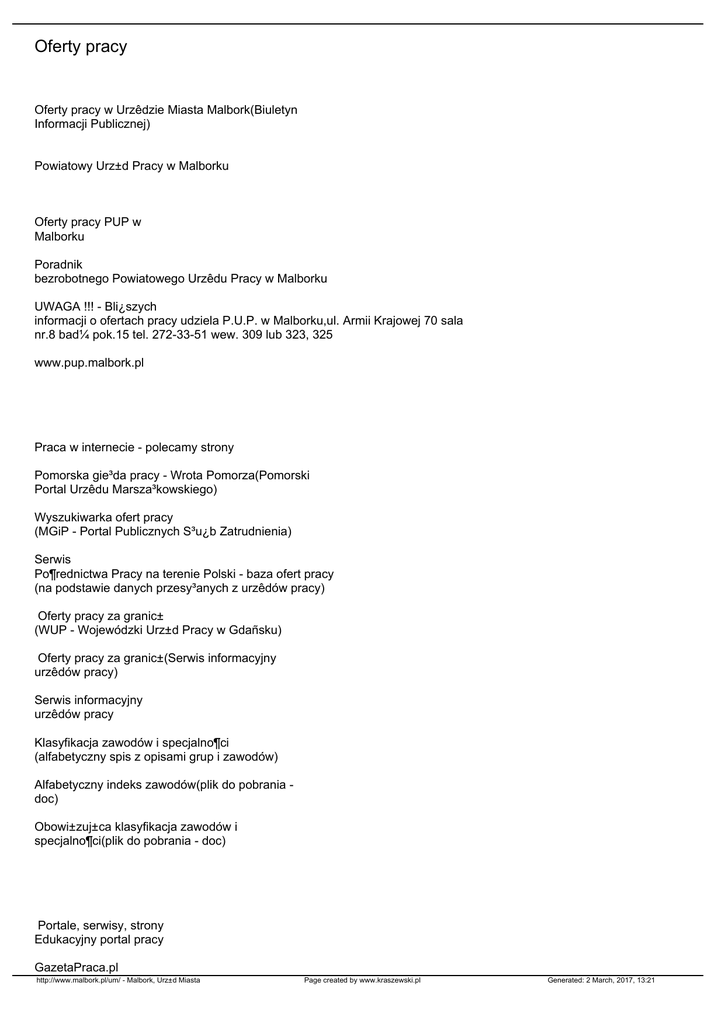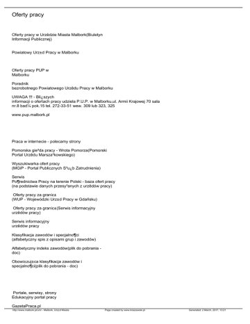 Oferty pracy Oferty pracy w Urzêdzie Miasta Malbork(Biuletyn Informacji Publicznej) Powiatowy Urz±d Pracy w Malborku Oferty pracy PUP w Malborku Poradnik bezrobotnego Powiatowego Urzêdu Pracy w Malborku UWAGA !!! - Bli¿szych informacji o ofertach pracy udziela P.U.P. w Malborku,ul. Armii Krajowej 70 sala nr.8 bad¼ pok.15 tel. 272-33-51 wew. 309 lub 323, 325 www.pup.malbork.pl Praca w internecie - polecamy strony Pomorska gie³da pracy - Wrota Pomorza(Pomorski Portal Urzêdu Marsza³kowskiego) Wyszukiwarka ofert pracy (MGiP - Portal Publicznych S³u¿b Zatrudnienia) Serwis Po¶rednictwa Pracy na terenie Polski - baza ofert pracy (na podstawie danych przesy³anych z urzêdów pracy) Oferty pracy za granic± (WUP - Wojewódzki Urz±d Pracy w Gdañsku) Oferty pracy za granic±(Serwis informacyjny urzêdów pracy) Serwis informacyjny urzêdów pracy Klasyfikacja zawodów i specjalno¶ci (alfabetyczny spis z opisami grup i zawodów) Alfabetyczny indeks zawodów(plik do pobrania doc) Obowi±zuj±ca klasyfikacja zawodów i specjalno¶ci(plik do pobrania - doc) Portale, serwisy, strony Edukacyjny portal pracy GazetaPraca.pl http://www.malbork.pl/um/ - Malbork, Urz±d Miasta Page created by www.kraszewski.pl Generated: 2 March, 2017, 13:21 Pracuj.pl JobSales.pl Portal Rynku Pracy Ludzie Pracy Jobland.pl Praca.info Portal pracy PracaPraca.pl http://www.malbork.pl/um/ - Malbork, Urz±d Miasta Page created by www.kraszewski.pl Generated: 2 March, 2017, 13:21