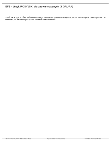 EFS - Jêzyk ROSYJSKI dla zaawansowanych (1 GRUPA) ZAJÊCIA ROZPOCZÊ£Y SIÊ DNIA 05 lutego 2007termin: poniedzia³ek i ¶roda, 17:15 18:45miejsce: Gimnazjum Nr 1 w Malborku, ul. ¯eromskiego 45, sala 104lektor: Mirella skwara http://www.malbork.pl/um/ - Malbork, Urz±d Miasta Page created by www.kraszewski.pl Generated: 2 March, 2017, 13:21