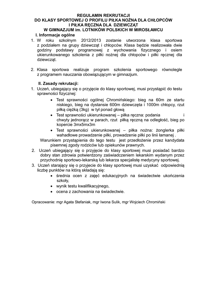 REGULAMIN REKRUTACJI DO KLASY SPORTOWEJ O PROFILU PIŁKA NOŻNA DLA CHŁOPCÓW I PIŁKA RĘCZNA DLA DZIEWCZĄT W GIMNAZJUM im. LOTNIKÓW POLSKICH W MIROSŁAWCU I. Informacje ogólne 1. W roku szkolnym 2012/2013 zostanie utworzona klasa sportowa z podziałem na grupy dziewcząt i chłopców. Klasa będzie realizowała dwie godziny podstawy programowej z wychowania fizycznego i osiem ukierunkowanego szkolenia z piłki nożnej dla chłopców i piłki ręcznej dla dziewcząt. 2. Klasa sportowa realizuje program szkolenia sportowego z programem nauczania obowiązującym w gimnazjum. równolegle II. Zasady rekrutacji: 1. Uczeń, ubiegający się o przyjęcie do klasy sportowej, musi przystąpić do testu sprawności fizycznej: Test sprawności ogólnej Chromińskiego: bieg na 60m ze startu niskiego, bieg na dystansie 600m dziewczęta i 1000m chłopcy, rzut piłką ciężką (3kg) w tył ponad głową Test sprawności ukierunkowanej – piłka ręczna: podania i chwyty jednorącz w parach, rzut piłką ręczną na odległość, bieg po kopercie 3mx5mx3m Test sprawności ukierunkowanej – piłka nożna: żonglerka piłki wahadłowe prowadzenie piłki, prowadzenie piłki po linii łamanej . Warunkiem przystąpienia do tego testu jest przedłożenie przez kandydata pisemnej zgody rodziców lub opiekunów prawnych. 2. Uczeń ubiegający się o przyjęcie do klasy sportowej musi posiadać bardzo dobry stan zdrowia potwierdzony zaświadczeniem lekarskim wydanym przez przychodnię sportowo-lekarską lub lekarza specjalistę medycyny sportowej. 3. Uczeń starający się o przyjecie do klasy sportowej musi uzyskać odpowiednią liczbę punktów na którą składają się: średnia ocen z zajęć edukacyjnych na świadectwie ukończenia szkoły, wynik testu kwalifikacyjnego, ocena z zachowania na świadectwie. Opracowanie: mgr Agata Stefaniak, mgr Iwona Sulik, mgr Wojciech Chromiński