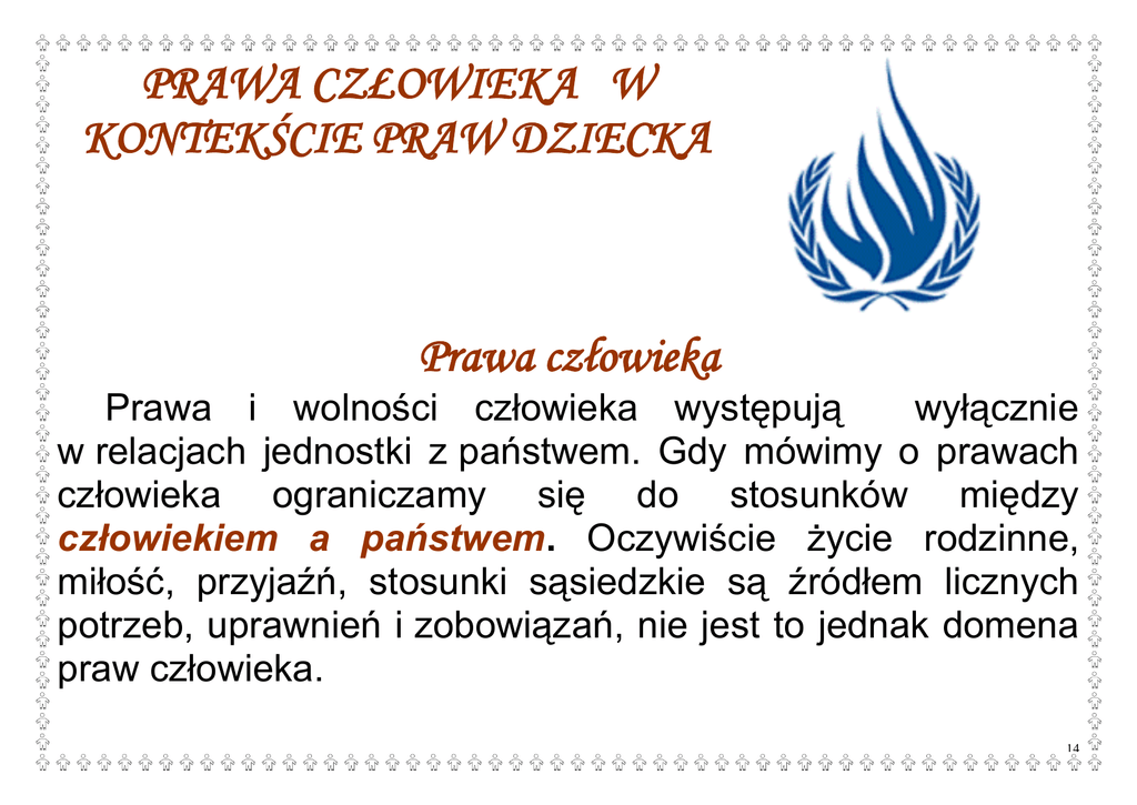 PRAWA CZŁOWIEKA W KONTEKŚCIE PRAW DZIECKA Prawa człowieka Prawa i wolności człowieka występują wyłącznie w relacjach jednostki z państwem. Gdy mówimy o prawach człowieka ograniczamy się do stosunków między człowiekiem a państwem. Oczywiście życie rodzinne, miłość, przyjaźń, stosunki sąsiedzkie są źródłem licznych potrzeb, uprawnień i zobowiązań, nie jest to jednak domena praw człowieka. 14 Prawa człowieka to prawa indywidualne nie zaś zbiorowe. Ich podmiotem jest pojedynczy człowiek. Praw człowieka dochodzi się od państwa. Są one tarczą, które daje jednostkom poczucie bezpieczeństwa w kontaktach z państwem Klasyfikacja praw człowieka Prawa dzielą się na materialne i proceduralne. Prawa materialne zaś na: Prawa - obowiązek rządzących zrobienia czegoś czynnie dla każdego z nas. Na przykład prawo do nauki nakłada na rządzących odpowiedzialność za spowodowanie istnienia sieci szkół, umożliwiających każdemu dziecku pobieranie nauki. 15 Wolności - nałożone na rządzących zakazy ingerowania w określone obszary naszego życia. Wolność słowa, wolność wyznania itp., to zakazy wtrącania się władz państwowych w te dziedziny ludzkiej aktywności. Podstawowym pojęciem w koncepcji praw człowieka jest niezbywalna, przyrodzona godność osobowa człowieka. Jest ona związana z istotą człowieczeństwa, wynika z faktu bycia człowiekiem, posiada ją i niemowlę, które jeszcze niczego w życiu nie dokonało, i największy zbrodniarz. Godność osobową należy odróżnić od godności osobistej, która jest pojęciem bliskim honorowi na tę godność trzeba zapracować, rośnie gdy postępujemy szlachetnie, można ją stracić, gdy postąpimy podle. 16 Prawa człowieka są niezbywalne. Żaden człowiek nie może być ich pozbawiony, ani też nie może sam ich się zrzec. Przysługują każdemu niezależnie od posiadanej pozycji społecznej, ani sposobu, w jaki ktoś żyje, a zatem są powszechne. A skoro każdemu się należą tylko z racji urodzenia się człowiekiem, mówimy o nich, iż są przyrodzone. Prawa człowieka przysługują w równym stopniu wszystkim ludziom, niezależnie od wszelkich różnic, jakie ich dzielą lub mogą dzielić; takich jak: kolor skóry, rasa, narodowość, przynależność państwowa, wyznawana religia, pozycja społeczna, płeć, wiek i inne. Prawa człowieka są niezmienne, czyli niezależne od warunków czasu i miejsca. Są również nadrzędne w stosunku do państwa, czy też w stosunku do każdej społeczności, w której człowiek się znajdzie. Z naruszeniami praw człowieka spotykamy się 17 tylko wtedy, kiedy mamy do czynienia z władzą, która je narusza. Istotne jest, aby wiedzieć, że prawa człowieka są prawami indywidualnymi – zajmują się jednostką, nie zaś całymi grupami, zbiorowościami, narodami. Prawa dziecka Prawa dziecka to obowiązki dorosłego wobec niego. Wolności dziecka stanowią dla dorosłego człowieka zakaz ingerowania w niektóre obszary życia dziecka. Prawa dziecka ograniczają prawa dorosłych, jednocześnie nakładając na nich obowiązki. Przyczyną konieczności wyodrębnienia praw dziecka według Konwencji Praw Dziecka tkwi w fizycznej i psychicznej niedojrzałości dziecka. Dziecko jest istotą ludzką i wymaga poszanowania 18 dla jego tożsamości, godności i prywatności. Rodzina, którą państwo ma wspierać, a nie wyręczać w jej funkcjach opiekuńczych, jest najlepszym miejscem wychowania dziecka. Prawa ucznia W polskim systemie prawa nie ma aktu normatywnego, który by zawierał kompletną listę praw ucznia. Oto próba ujęcia rozsianych po rozporządzeniach praw ucznia w jeden zbiór. Prawo do nauki Prawo to jest realizowane poprzez stworzenie jednolitego, bezpłatnego, publicznego i obowiązkowego systemu kształcenia w zakresie szkoły podstawowej i gimnazjum.. Prawo do wyrażania swojej opinii 19 Uczeń ma prawo do wygłaszania kontrowersyjnych, a nawet niezgodnych z powszechnie przyjętym kanonem nauczania poglądów. Oczywiście wolność ta nie zwalnia go ze znajomości oficjalnych interpretacji. Należy jednak pamiętać, że ograniczeniem tej wolności jest dobro osobiste innych osób (nikogo nie wolno obrażać). Poglądy i opinie uczniów nie mogą być przedmiotem oceny stawianej przez nauczyciela. Prawo do wypowiedzi i informacji Uczeń powinien mieć dostęp do wszystkich informacji, które mogą mieć wpływ na jego sytuację w szkole. Prawo to dotyczy również prawa dziecka do informacji o swoich prawach. Z racji swojej niedojrzałości dziecko może nie wiedzieć o przysługujących mu prawach, wobec czego szkoła ma obowiązek informowania go o nich. W życiu 20 dorosłym „nieznajomość prawa szkodzi”, w przypadku dziecka takie stwierdzenie jest nieuzasadnione. Zakaz naruszania godności Kary ustanowione przez statut szkoły nie mogą naruszać nietykalności i godności osobistej ucznia. Ucznia nie wolno obrażać i ośmieszać. Prawo do jawnej i umotywowanej oceny postępów w nauce i zachowaniu Kwestie ocen są szczegółowo określone w rozporządzeniu Ministra Edukacji w sprawie warunków i sposobów oceniania, klasyfikowania i promowania uczniów. Każdy uczeń powinien mieć możliwość zapoznania się z wewnątrzszkolnym systemem oceniania. Każda ocena, jaką stawia nauczyciel powinna być jawna i uzasadniona uczeń musi wiedzieć jaką ocenę dostał i dlaczego. 21 Prawo do życzliwego, podmiotowego traktowania w procesie dydaktyczno-wychowawczym Nauczyciele powinni traktować uczniów sprawiedliwie i równo, tzn. nie kierować się swoimi sympatiami i antypatiami wobec uczniów ani też nie demonstrować ich. Prawo do wpływania na życie szkoły poprzez działalność samorządową Każdy uczeń jest członkiem samorządu uczniowskiego i przysługuje mu czynne i bierne prawo wyborcze do organów samorządu. Sam też decyduje, jak i na ile chce się zaangażować w życie uczniowskie. Prawo do uznan
