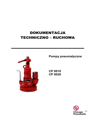 DOKUMENTACJA TECHNICZNO – RUCHOWA Pompy pneumatyczne CP 0010 CP 0020 TM DOKUMENTACJA TECHNICZNO – RUCHOWA POMPY PNEUMATYCZNE Typ................................................................................... Numer seryjny ............................................................... Data sprzedaży ............................................................... Numer karty gwarancyjnej .......................................... TM Dokumentacja Techniczno - Ruchowa PRZEPISY BEZPIECZEŃSTWA Niniejsza instrukcja zawiera informacje związane z bezpieczeństwem pracy. Zwróć szczególną uwagę na tekst umieszczony w ramkach, poprzedzony znakiem ostrzeżenia (trójkąt) i wyróżniony hasłem OSTRZEŻENIE lub UWAGA. ! ! OSTRZEŻENIE Ostrzega przed niebezpieczeństwem, brakiem stosownego zabezpieczenia oraz sygnalizuje niebezpieczne czynności. Nieprzestrzeganie danego zalecenia może doprowadzić do poważnych obrażeń ciała lub śmierci. UWAGA Ostrzega przed niebezpieczeństwem, brakiem stosownego zabezpieczenia oraz sygnalizuje niebezpieczne czynności. Nieprzestrzeganie danego zalecenia może doprowadzić do obrażenia ciała lub uszkodzenia maszyny. Ogólne zasady bezpieczeństwa: Przed uruchomieniem pompy dokładnie zapoznaj się z niniejszą instrukcją. Ze względów bezpieczeństwa nie wolno wprowadzać żadnych zmian konstrukcyjnych pompy. ! UWAGA Zawsze używaj wyposażenia ochronnego. Używaj wyłącznie oryginalnych części CHICAGO PNEUMATIC. Zniszczone oznaczenia i naklejki należy niezwłocznie wymienić. osobistego POMPA PNEUMATYCZNA CP0010/CP0020 nie może być używana do pompowania substancji łatwopalnych. Dokumentacja Techniczno - Ruchowa Budowa Gwint lewoskrętny Dokumentacja Techniczno - Ruchowa Charakterystyka i zastosowanie Pneumatyczna pompa CP0010, CP0020 przeznaczona jest do pracy na budowach, kamieniołomach, kopalniach itp. Może być używana do wypompowania brudnej wody, zanieczyszczeń stałych i substancji chemicznych. Przy zastosowaniu pompy do cieczy chemicznych, o właściwościach korozyjnych, lub o wysokiej temperaturze, konieczne jest zwiększenie okresu pomiędzy przeglądami. Skontaktuj się z dealerem CHICAGO PNEUMATIC. Pompy pneumatyczne CHICAGO PNEUMATIC nie mogą być używane do przepompowywania substancji łatwopalnych. CP0010, CP0020 jest pompą wirnikową samo odpowietrzającą. Szczegółowe dane techniczne podane są w rozdziale „Dane techniczne” Przygotowanie do pracy ! UWAGA Przed rozpoczęciem pracy ustaw dźwignie zaworu odcinającego w położeniu „stop”. Przed rozpoczęciem pracy Usuń plastikowe osłony zabezpieczenia otworów doprowadzenia powietrza. Zachowaj osłony plastikowe by po skończonej pracy użyć je ponownie. Podłącz wąż tłoczący. Węże powietrzne ! UWAGA Przed rozpoczęciem pracy dokładnie oczyść końcówki węża. Sprawdź stan zacisków, złączy i węża. Do zasilania pompy zaleca się stosowanie węży MANTEX o średnicy wewnętrznej 1” (25 mm). Przed podłączeniem do maszyny przedmuchaj wąż sprężonym powietrzem celem usunięcia zanieczyszczeń. Przy uruchamianiu fabrycznie nowej pompy wlej ok. 10 ml oleju AIR OIL do złącza doprowadzenia powietrza a następnie podłącz wąż. Smarowanie Dbaj o właściwe smarowanie maszyny. Pompy CP wyposażone są w wbudowane smarownice o regulowanej dawce. Dawka ta ustalana jest fabrycznie. Smarownica pompy jest przystosowane do pracy z olejem mineralnym i syntetycznym. Zalecany jest olej AIR OIL lub olej mineralny. Przeprowadź regularną kontrolę działania smarownicy poprzez ocenę stanu naolejenia zespołów roboczych pompy. Kontrolę przeprowadza się w czasie przeglądu maszyny, przystawiając rękę do otworu wylotowego powietrza. Po pewnym czasie na dłoni powinny być widoczne kropelki oleju. Dokumentacja Techniczno - Ruchowa Zalecany olej Zakres pracy °C Klasa lepkości Syntetyczny -30 do + 50 ISO VG 46-100 AIR-OIL Mineralny -20 do +15 ISO VG 32-46 +15 do +35 ISO VG 46-100 Nie stosuj oleju o innej gęstości niż zalecana! NIE MIESZAJ OLEJI ! UWAGA Przed odkręceniem korka wlewu oleju zamknij zawór zasilający oraz odłącz wąż doprowadzający powietrze od pompy. Nie odkręcaj korka, gdy układ znajduje się pod ciśnieniem. Kontroluj poziom oleju w smarownicy minimum, co 8 godziny ciągłej pracy. Co tydzień wykręć korek (49) i nasmaruj elementy pompy smarem (o typ smaru pytaj Dealera CP – zależy on od warunków w jakich pracuje pompa). Napełnianie smarownicy Odłącz zasilanie powietrza. Odkręć korek (4) i wlej olej do dolnej części gwintu korka wewnątrz korpusu pompy. Uruchamianie 1. Napełnij smarownicę olejem. 2. Podłącz wąż doprowadzający powietrze (średnica min. 1”) 3. Podłącz wąż tłoczący i odprowadzający powietrze. 4. Wąż odprowadzający powietrze zamocuj w taki sposób by cały czas znajdował się nad powierzchnią cieczy. 5. Sprawdź szczelność połączeń węży. 6. Ustaw pompę w takim miejscu aby zapewnić jej pełną stabilność oraz by węże nie były skręcone lub przygniecione. Sprawdź czy pompa nie będzie zasysała szlamu itp. Jeżeli tak umieść ją na podwyższeniu. 7. Sprawdź stan węży i połączeń. 8. Uruchom sprężarkę. 9. Skontroluj ciśnienie na sprężarce – powinno wynosić max 6,2 bar. 10. Uruchom pompę. 11. Pompa będzie pracowała samoczynnie i po uruchomieniu i skontrolowaniu poprawności jej działania, nie wymaga stałego nadzoru. Zatrzymywanie Celem zatrzymania pompy wyłącz dopływ powietrza. Konserwacja Obsługa codzienna Przed rozpoczęciem pracy skontroluj stan ogólny maszyny, zwróć uwagę czy połączenia spawane nie są popękane, sprawdź stan dokręcenia śrub i nakrętek. Sprawdź szczelność połączeń oraz poziom oleju w smarownicy. Zauważone usterki usuwaj na bieżąco. Dokumentacja Techniczno - Ruchowa Zapobieganie zamarzaniu Co 3 miesiące (lub co 300 godzin pracy) W czasie pracy w temperaturze otoczenia poniżej +4°C maszyn