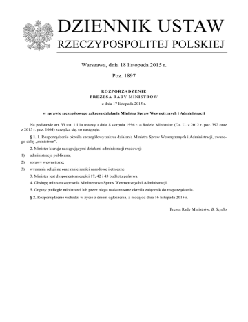 DZIENNIK USTAW RZECZYPOSPOLITEJ POLSKIEJ Warszawa, dnia 18 listopada 2015 r. Poz. 1897 RO ZPO R ZĄ D ZE N I E PR E ZE S A R AD Y M IN I S TRÓ W z dnia 17 listopada 2015 r. w sprawie szczegółowego zakresu działania Ministra Spraw Wewnętrznych i Administracji Na podstawie art. 33 ust. 1 i 1a ustawy z dnia 8 sierpnia 1996 r. o Radzie Ministrów (Dz. U. z 2012 r. poz. 392 oraz z 2015 r. poz. 1064) zarządza się, co następuje: § 1. 1. Rozporządzenie określa szczegółowy zakres działania Ministra Spraw Wewnętrznych i Administracji, zwanego dalej „ministrem”. 2. Minister kieruje następującymi działami administracji rządowej: 1) administracja publiczna; 2) sprawy wewnętrzne; 3) wyznania religijne oraz mniejszości narodowe i etniczne. 3. Minister jest dysponentem części 17, 42 i 43 budżetu państwa. 4. Obsługę ministra zapewnia Ministerstwo Spraw Wewnętrznych i Administracji. 5. Organy podległe ministrowi lub przez niego nadzorowane określa załącznik do rozporządzenia. § 2. Rozporządzenie wchodzi w życie z dniem ogłoszenia, z mocą od dnia 16 listopada 2015 r. Prezes Rady Ministrów: B. Szydło Dziennik Ustaw –2– Poz. 1897 Załącznik do rozporządzenia Prezesa Rady Ministrów z dnia 17 listopada 2015 r. (poz. 1897) WYKAZ ORGANÓW PODLEGŁYCH MINISTROWI SPRAW WEWNĘTRZNYCH I ADMINISTRACJI LUB PRZEZ NIEGO NADZOROWANYCH 1) Dyrektor Zakładu Emerytalno-Rentowego Ministerstwa Spraw Wewnętrznych; 2) Główny Geodeta Kraju; 3) Komendant Główny Policji; 4) Komendant Główny Straży Granicznej; 5) Komendant Główny Państwowej Straży Pożarnej; 6) Szef Obrony Cywilnej Kraju; 7) Szef Urzędu do Spraw Cudzoziemców.
