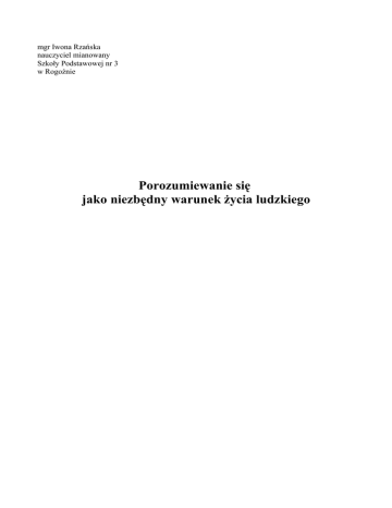 mgr Iwona Rzańska nauczyciel mianowany Szkoły Podstawowej nr 3 w Rogoźnie Porozumiewanie się jako niezbędny warunek życia ludzkiego Na temat porozumiewania pisze się ostatnio bardzo wiele. Różne pedagogiki stawiają sobie za cel odnalezienie właściwej drogi interpretowania celów kształcenia i wychowania. Edukacja ulega wielu przeobrażeniom. Jedną z pedagogik, która ukazuje nauczyciela w innym świetle niż dotychczas, jest pedagogika humanistyczna. Poszukuje ona źródeł koncepcji celów w psychologicznym ujęciu. Z kolei w pedagogice egzystencjalnej zasadniczym kryterium jest dialog i przeżycie. To właśnie on tworzy podstawę poszukiwań nowych rozwiązań. Może on być realizowany przez dwie lub więcej osób. W środowisku szkolnym są nimi: nauczyciel, uczeń i jego rodzice lub prawni opiekunowie. Między nimi dochodzi do najczęstszych kontaktów. To nauczyciel wprowadza dziecko w świat nauki szkolnej. Pomaga mu w jego rozwoju. Uczy go spostrzegać i rozumieć ludzi, a także dążyć do samorealizacji, samourzeczywistnienia. Wpaja mu określone dla danego społeczeństwa wartości i normy moralne. Warunkiem sukcesu dziecka jest współpraca nauczyciela z jego rodzicami. Wszechstronny rozwój ucznia przebiega właściwie, gdy relacje pomiędzy nauczycielem a rodzicami są wspomagane wzajemnym zaufaniem, zgodnością celów i jednolitymi zasadami postępowania w stosunku do dziecka. Tylko razem można stworzyć właściwy klimat wychowawczy. „ Rodzice mają prawo do wychowania dzieci zgodnie z własnymi przekonaniami. Wychowanie to powinno uwzględniać stopień dojrzałości dziecka, a także wolność jego sumienia i wyznania oraz jego przekonania ” ( Konstytucja Rzeczpospolitej Polskiej, 1997, art.48, ust.1) Podstawowe funkcje wychowawcze spełniają rodzice, nauczyciel powinien ich wspomagać i ewentualnie uzupełniać. Zadaniem rodziców powinno być włączanie się w system wychowawczy szkoły. Dziecko wkraczając w mury szkolne czuje się bezradne i zagubione. Potrzebuje opieki i zrozumienia. Wszystkie te czynności odbywają się za pomocą mowy werbalnej i niewerbalnej. Dlatego bardzo ważny jest pierwszy kontakt nauczyciela z uczniami i jego rodzicami. Bez nawiązania go wzajemne współdziałanie nie jest możliwe. Rozmowa jest bardzo często pierwszym osobistym kontaktem między nimi. Jest ona słownym porozumiewaniem się dwojga ludzi i polega na wymianie myśli i uczuć. Podczas niej partnerzy mają możliwość nie tylko dzielenia się posiadaną wiedzą, własnymi spostrzeżeniami, odczuciami, lecz również mogą wpływać na zmianę opinii i ocen. Poprawnie przeprowadzona pomaga we wzajemnym poznaniu nauczyciela, uczniów i rodziców, może pogłębić wzajemne zaufanie. Rozmowa wymaga przestrzegania wielu warunków, jak chociażby uważne i cierpliwe słuchanie, kontakt wzrokowy, empatia. Powinny je przestrzegać obie osoby prowadzące dialog. Porozumiewanie się jest niezbędnym warunkiem ludzkiego życia. Umiejętność porozumiewania się jest gwarantem dobrej współpracy nauczyciela, uczniów i ich rodziców. Definiowaniem pojęcia porozumiewania się zajmowało się wielu pedagogów i psychologów. Każdy starał się wyjaśnić, co to jest porozumiewanie, jak ono przebiega, jakie ma formy. Każda z definicji nosi inny tytuł np. interakcja, komunikacja, porozumiewanie się bez słów. Dzieje się tak, ponieważ różni autorzy opisują definicje pod innym względem. W. Pomykało pisze : „ komunikacja interpersonalna jest to proces wymiany wiadomości między dwiema osobami. Jest to jedna z form porozumiewania się ludzi ( ...). W toku komunikacji interpersonalnej wiadomości przekazywane są przy pomocy sygnałów. Sygnałem jest każde zachowanie, które zostało spostrzeżone przez drugą osobę. Rozróżnione są dwie zasadnicze kategorie sygnałów: werbalna ( tj. słowa) oraz niewerbalna ( tj. ton i natężenie głosu, gesty). W trakcie komunikacji interpersonalnej każda z dwóch uczestniczących w niej osób wykonuje dwa rodzaje czynności; nadaje komunikaty ( tj. emituje sygnały) oraz odbiera komunikaty ( tj. spostrzega sygnały i odtwarza zawartą w nich wiadomość)”1. Norbert Sillamy ujmuje definicję komunikacji ( porozumiewania się) jako relację między jednostkami. „ Komunikacja to w pierwszym rzędzie – percepcja. Implikuje ona świadome lub nieświadome przekazywanie wiadomości przeznaczonych do poinformowania jednostki albo grupy odbiorców, jednak nie sprowadza się wyłącznie do tego. W tym samym czasie, gdy przekazywana W. Pomykało: Komunikacja interpersonalna, w: Encyklopedia pedagogiczna pod red. W. Pomykało, Funkcja Innowacyjna Warszawa 1993, s. 279-282 1 2 jest informacja, odbywa się oddziaływanie wzajemne nadawcy i odbiorcy komunikatu oraz wytwarza się efekt zwrotny ( sprzężenie zwrotne). Mowa nie jest jedyną formą komunikacji, są nimi także mimika i gest. Porozumiewanie nie ogranicza się do racjonalnych form wyrazu. Postrzega się więcej niż to, co jest otwarcie komunikowane”2. Zupełnie inaczej przedstawia to W. Okoń, który mówi, że „ ... interakcja to wzajemne oddziaływanie na siebie dwu lub więcej osób, z których każda ma świadomość podmiotowości innych osób i podmiotowości własnej. Interakcja dokonuje się nie tylko pod względem własnych celów i potrzeb działającego, lecz także tych wymagań, jakie inni partnerzy sobie wobec własnego działania stawiają”3. Zupełnie inaczej pisze A. Dąbrówka i E. Geller: „ ... porozumiewać się bez słów to komunikować się z trudem, migać, gestykulować, mówić na migi, stukać się w czoło, robić minę, mrugać, rozmawiać oczami, spojrzeć po sobie, puścić oko, sztyletować wzrokiem”4. Bardzo mocno jest tu zaznaczony całkiem odmienny punkt patrzenia na porozumiewanie, gdzie „ ... ludzie bardziej ufają twarzy, a najmniej słowom”5. Lech Tkaczyk tak pisze: „ ... przez » kanał werbalny «