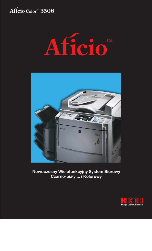 Nowoczesny Wielofunkcyjny System Biurowy Czarno-biały ... i Kolorowy Wszechstronność we Współczesnym Biurze Pracując z Aficio Color™ 3506 masz w zasięgu ręki cały zakres cyfrowych urządzeń biurowych, kompletne cyfrowe rozwiązanie. To nowoczesne urządzenie zapewnia użytkownikowi wysoką wydajność i produktywność przy kopiowaniu czarno-białym. Dodatkowo, umożliwia tworzenie dokumentów kolorowych po przystępnej cenie. Poprzez dołączenie do tego czarno-białego systemu możliwości pracy w pełnym kolorze, Ricoh dostarcza dzięki temu użytkownikowi doskonałe, wielofunkcyjne urządzenie biurowe. Aficio Color™ 3506 może zostać skonfigurowane pod indywidualne potrzeby biura i zaopatrzone dodatkowo w rozmaite opcje podnoszące wydajność pracy. Urządzenie umożliwia tworzenie profesjonalnych dokumentów w sposób prostszy, lecz bardziej wyrafinowany. Poprzez dołączenie kontrolera kolorowej drukarki, ta cyfrowa kopiarka może zostać rozszerzona o funkcje nowoczesnej drukarki i skanera. W rezultacie otrzymujemy wielofunkcyjne urządzenie o kompaktowej budowie, zapewniające doskonałe wyniki pracy oraz znaną solidność gwarantowaną przez firmę Ricoh. Aficio Color™ 3506 tworzy nowy standard pracy we współczesnym biurze! Doskonałe Wielofunkcyjne Urządzenie Biurowe Aficio Color™ 3506 jest w stanie spełnić zróżnicowane wymagania współczesnego biura. Niezwykle łatwe w użyciu i nowoczesne - ta kopiarko/drukarka zapewnia doskonałe możliwości kolorystyczne, obsługuje różne rodzaje rodzajów papieru i oferuje wyjątkowo szeroką gamę opcji, dopasowujących możliwości urządzenia do oczekiwań użytkownika. Zwielokrotnienie Przekazu Dokumentu Poprzez Użycie Koloru Nowoczesna i Wydajna Rozbudowa o Moduł Drukarki Kopiarka Aficio Color™ 3506 oferuje możliwości pracy w pełnym kolorze. Tworząc kolorowe oferty handlowe, raporty, prezentacje itp., stają się one bardziej czytelne, łatwiejsze w odbiorze i stanowią profesjonalną wizytówkę firmy. Kiedy urządzenie zostaje wyposażone we wbudowany kontroler kolorowej drukarki, Aficio Color™ 3506 rozszerza swoje funkcje o drukarkę i skaner, dając dostęp do urządzenia prosto z komputera osobistego użytkownika w biurze. Obsługa Papieru Budowa Modułowa Dzięki technologii Systemu Pasa Transferowego firmy Ricoh, Aficio Color™ 3506 może obsługiwać szeroką gamę papieru różnego formatu, rodzaju i gramatury do 160g/m2. Daje to użytkownikowi dodatkową możliwość kreatywnego tworzenia profesjonalnych dokumentów! Wszechstronne funkcje i opcje pracy umożliwiają przekształcenie tej cyfrowej kopiarki firmy Ricoh w urządzenie dopasowane do indywidualnych potrzeb użytkownika biurowego. Prosta Obsługa Wykorzystując wyjątkowe cechy Aficio Color™ 3506, tworzenie i kopiowanie dokumentów biurowych jest łatwe i niedrogie. Nie ma potrzeby zakupu dodatkowych urządzeń, tym samym oszczędzając czas, pieniądze, powierzchnię oraz zwiększając swobodę pracy w biurze. Aficio Color™ 3506 to urządzenie niezwykle proste w obsłudze. Informacje na panelu łatwo prowadzą operatora poprzez menu dostępnych funkcji, tak, że nawet najbardziej skomplikowana praca staje się bardzo prosta do uzyskania. Eliminuje to potrzebę długich szkoleń pracowników i redukuje liczbę błędnie wykonywanych wydruków. Drukując w kolorze możesz tworzyć bardziej efektowne dokumenty biurowe. Nawet najbardziej złożone zadanie jest łatwe do wykonania dzięki prostemu panelowi operacyjnemu na Aficio Color™ 3506. Wielofunkcyjność za Przystępną Cenę W Czarno-białej Kopiarce Zainstalowaliśmy coś Jeszcze... Kolor! A4 A4 A3 A4 Aficio Color™ 3506 jest doskonałym, wielofunkcyjnym urządzeniem biurowym. Precyzyjna technologia cyfrowa zapewnia wysoką wydajność i najwyższą jakość czarnobiałego kopiowania. Dzięki wbudowanej kolorowej drukarce użytkownik jest w stanie tworzyć złożone, profesjonalne dokumenty. Kolorowe materiały drukowane na miejscu w biurze po bardzo przystępnej cenie! Dzięki Automatycznemu Obrotowi Obrazu, odwzorowywany obraz zawsze trafi na wybrany format papieru, eliminując powstawanie zbędnych, błędnych kopii. Wyjątkowa Wydajność Kopiowania Czarno-białego Spośród wielu cyfrowych funkcji Aficio Color™ 3506 warta omówienia jest funkcja Skanuj Raz Drukuj Wiele Razy przy powielaniu czarno-białym. Oryginał zostaje zeskanowany tylko jeden raz i od razu zachowany w pamięci do kopiowania. Efektem takiego rozwiązania jest czyste i dokładne kopiowanie czarno-białe z szybkością 25 stron na minutę. Większość kopiowanych prac w biurze to najczęściej dokumenty tylko 1-o stronicowe, wiec czas uzyskania pierwszej kopii - 8 sekund jest ogromną oszczędnością czasu! Funkcja obrotu obrazu, wyjątkowa dla urządzenia tej klasy, zapewnia, że obraz zawsze zostanie dopasowany do wybranego formatu papieru, niezależnie od kierunku ułożenia papieru w kasecie. ... i Pełno-kolorowego! Aficio Color™ 3506 gwarantuje dodatkowo wspaniałe możliwości kolorystyczne. Dokumenty drukowane w kolorze wyglądać będą bardziej profesjonalnie, atrakcyjnie i będą bardziej przejrzyste, co w sumie wzmocni ich przekaz. Dodatkowo Aficio Color™ 3506 nie każe użytkownikowi długo czekać na efekty swojej pracy, ponieważ drukuje pierwszą pełnokolorową stronę w 22,4 sekundy w tempie 6 stron na minutę. System “automatycznego rozpoznawania kolorów” zastosowany przez firmę Ricoh, polega na tym, że czarno-białe dokumenty powielane są przy użyciu wyłącznie toneru czarnego, kolorowe zaś na kolorowo. Zapewnia to wzrost wydajności pracy urządzenia, a także umożliwia kontrolę kosztów jego pracy, zwłaszcza przy powielaniu materiałów składających się zarówno z czarno-białych jak i kolorowych dokumentów. Doskonała Jakość Obrazu Aficio Color™ 3506 zapewnia doskonałą jakość obrazu. Wyrafinowana technologia przetwarzania obrazu firmy
