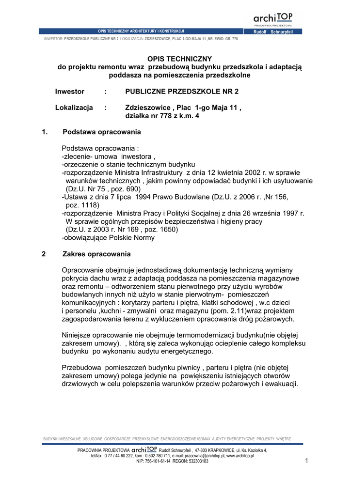 OPIS TECHNICZNY ARCHITEKTURY I KONSTRUKCJI INWESTOR: PRZEDSZKOLE PUBLICZNE NR 2 LOKALIZACJA: ZDZIESZOWICE, PLAC 1-GO MAJA 11 ,NR. EWID. GR. 778 OPIS TECHNICZNY do projektu remontu wraz przebudową budynku przedszkola i adaptacją poddasza na pomieszczenia przedszkolne 1. Inwestor : PUBLICZNE PRZEDSZKOLE NR 2 Lokalizacja : Zdzieszowice , Plac 1-go Maja 11 , działka nr 778 z k.m. 4 Podstawa opracowania Podstawa opracowania : -zlecenie- umowa inwestora , -orzeczenie o stanie technicznym budynku -rozporządzenie Ministra Infrastruktury z dnia 12 kwietnia 2002 r. w sprawie warunków technicznych , jakim powinny odpowiadać budynki i ich usytuowanie (Dz.U. Nr 75 , poz. 690) -Ustawa z dnia 7 lipca 1994 Prawo Budowlane (Dz.U. z 2006 r. ,Nr 156, poz. 1118) -rozporządzenie Ministra Pracy i Polityki Socjalnej z dnia 26 września 1997 r. W sprawie ogólnych przepisów bezpieczeństwa i higieny pracy (Dz.U. z 2003 r. Nr 169 , poz. 1650) -obowiązujące Polskie Normy 2 Zakres opracowania Opracowanie obejmuje jednostadiową dokumentację techniczną wymiany pokrycia dachu wraz z adaptacją poddasza na pomieszczenia magazynowe oraz remontu – odtworzeniem stanu pierwotnego przy uŜyciu wyrobów budowlanych innych niŜ uŜyto w stanie pierwotnym- pomieszczeń komunikacyjnych : korytarzy parteru i piętra, klatki schodowej , w.c dzieci i personelu ,kuchni - zmywalni oraz magazynu (pom. 2.11)wraz projektem zagospodarowania terenu z wykluczeniem opracowania dróg poŜarowych. Niniejsze opracowanie nie obejmuje termomodernizacji budynku(nie objętej zakresem umowy). , którą się zaleca wykonując ocieplenie całego kompleksu budynku po wykonaniu audytu energetycznego. Przebudowa pomieszczeń budynku piwnicy , parteru i piętra (nie objętej zakresem umowy) polega jedynie na powiększeniu istniejących otworów drzwiowych w celu polepszenia warunków przeciw poŜarowych i ewakuacji. BUDYNKI MIESZKALNE USŁUGOWE GOSPODARCZE PRZEMYSŁOWE ENERGOOSZCZĘDNE ISOMAX AUDYTY ENERGETYCZNE PROJEKTY WNĘTRZ PRACOWNIA PROJEKTOWA Rudolf Schnurpfeil , 47-303 KRAPKOWICE, ul. Ks. Koziołka 4, tel/fax : 0 77 / 44 60 222, kom.: 0 502 780 711, e-mail: [email protected], www.architop.pl NIP: 756-101-61-14 REGON: 532303183 1 OPIS TECHNICZNY ARCHITEKTURY I KONSTRUKCJI INWESTOR: PRZEDSZKOLE PUBLICZNE NR 2 LOKALIZACJA: ZDZIESZOWICE, PLAC 1-GO MAJA 11 ,NR. EWID. GR. 778 3. Projekt zagospodarowania terenu 3.1.Przedmiot inwestycji , charakterystyka ekologiczna Przedmiotem inwestycji jest podpiwniczony , trzykondygnacyjny budynek Publicznego Przedszkola Nr 2 w Zdzieszowicach . Dach istniejącego budynku dwuspadowy kryty dachówką ceramiczną karpiówką w kolorze ceglastym ułoŜonej w koronkę. Przedmiotem inwestycji jest remont łazienek - w.c. dzieci i personelu , magazynu przylegającego do istniejącej kuchni ( zmiana technologii kuchni nie jest niniejszym opracowaniem) , która równieŜ objęta jest remontem w ograniczonym zakresie z wymianą wyposaŜenia stałego . W wyniku niewielkiej przebudowy polegającej na poprawieniu ewakuacji powiększono istniejące otwory drzwiowe (zgodnie z oprac. rzutami poszczególnych kondygnacji) z wymianą stolarki drzwiowej . Ponadto przedmiotem opracowania jest modernizacja dachu polegająca na wzmocnieniu konstrukcji dachu w powiązaniu ze wzmocnieniem konstrukcji stropu drewnianego piętra . Wymianie uszkodzonych elementów drewnianych więźby dachowej , wymianą łacenia i pokrycia dachu oraz modernizacji wyposaŜenia dachu (instalacja odgromowa , ławki kominiarskie, okna dachowe, klapa oddymiająca , itd.). Po dokonaniu remontu i modernizacji przewiduje się adaptacje istn. poddasza poprzez wydzielenie pomieszczeń (zgodnie z dokumentacją) na cele przedszkole. Uzyskanie pomieszczenia szatni dla personelu przedszkolnego i obsługi kuchni (odpowiednio max 6 +3 osoby ) z węzłem , sanitarno – higienicznym ;brakującego w budynku aneksu porządkowo-gospodarczego , dodatkowego biura oraz magazynów , m.in. magazynu na zasoby kuchenne i gastronomiczne. W celu poprawy dostępu do obiektu dla osób niepełnosprawnych planuje się zastosować urządzenie przenośne –transporter z napędem elektrycznym , np. typu Jolly słuŜący do pokonywania barier architektonicznych. Ogrzewanie budynku z własnej istniejącej kotłowni gazowej. Przyłącze wodociągowe istniejące z sieci miejskiej. Odprowadzenie ścieków istniejące z kanalizacji miejskiej. Przyłącze elektryczne istniejące z sieci Zakładu Energetycznego . Wywóz nieczystości stałych magazynowanych w szczelnych kontenerach śmietnikowych na kółkach -zakład oczyszczania miasta. 3.2. Stan istniejący. Teren będący przedmiotem inwestycji stanowi działka o numerze 778 z k.m. 4 której właścicielem jest inwestor Gmina Zdzieszowice Działki inwestora znajduje się na terenie oznaczonym wg miejscowego planu zagospodarowania przestrzennego przeznaczonymi pod zabudowę wielorodzinną z dopuszczeniem usług BUDYNKI MIESZKALNE USŁUGOWE GOSPODARCZE PRZEMYSŁOWE ENERGOOSZCZĘDNE ISOMAX AUDYTY ENERGETYCZNE PROJEKTY WNĘTRZ PRACOWNIA PROJEKTOWA Rudolf Schnurpfeil , 47-303 KRAPKOWICE, ul. Ks. Koziołka 4, tel/fax : 0 77 / 44 60 222, kom.: 0 502 780 711, e-mail: [email protected], www.architop.pl NIP: 756-101-61-14 REGON: 532303183 2 OPIS TECHNICZNY ARCHITEKTURY I KONSTRUKCJI INWESTOR: PRZEDSZKOLE PUBLICZNE NR 2 LOKALIZACJA: ZDZIESZOWICE, PLAC 1-GO MAJA 11 ,NR. EWID. GR. 778 Budynek przedszkola jest budynkiem ; podpiwniczonym , trzykondygnacyjnym z poddaszem gospodarczym , które w wyniku adaptacji będzie przeznaczone na pomieszczenia przedszkolne . Budynek posiada klatę schodową z drewnianymi biegami schodów za wyjątkiem schodów wyrównawczych parteru i piwnicy. Dach budynku –dwuspadowy kryty dachówką ceramiczną karpiówką ułoŜoną w koronkę . Przeznaczony w niniejszym opracowaniu do remontu z naprawą zmurszałych elementów drewnianych i wymiany pokrycia oraz modernizacji wyposaŜenia dachu. 3.3. Projektowane zagospo