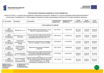 Końcowa lista rankingowa projektów po ocenie strategicznej