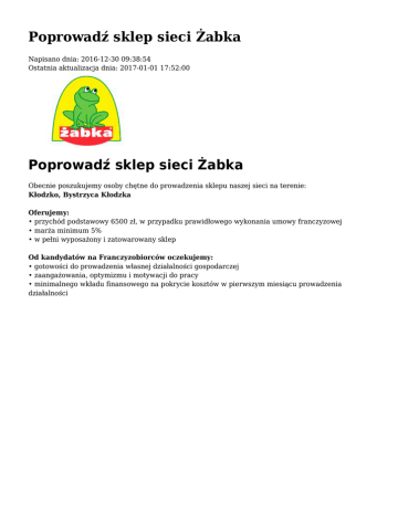 Poprowadź sklep sieci Żabka Napisano dnia: 2016-12-30 09:38:54 Ostatnia aktualizacja dnia: 2017-01-01 17:52:00 Poprowadź sklep sieci Żabka Obecnie poszukujemy osoby chętne do prowadzenia sklepu naszej sieci na terenie: Kłodzko, Bystrzyca Kłodzka Oferujemy: • przychód podstawowy 6500 zł, w przypadku prawidłowego wykonania umowy franczyzowej • marża minimum 5% • w pełni wyposażony i zatowarowany sklep Od kandydatów na Franczyzobiorców oczekujemy: • gotowości do prowadzenia własnej działalności gospodarczej • zaangażowania, optymizmu i motywacji do pracy • minimalnego wkładu finansowego na pokrycie kosztów w pierwszym miesiącu prowadzenia działalności