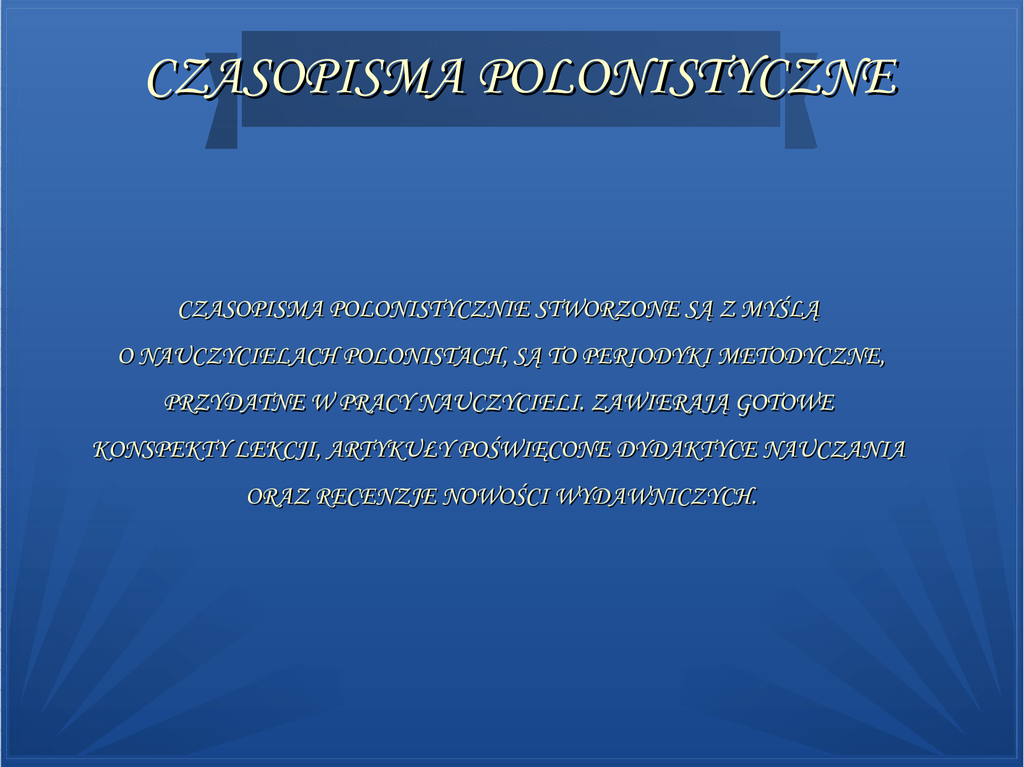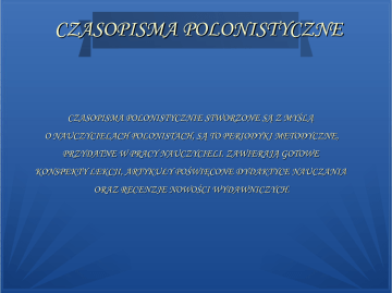 CZASOPISMA POLONISTYCZNE CZASOPISMA POLONISTYCZNIE STWORZONE SĄ Z MYŚLĄ O NAUCZYCIELACH POLONISTACH, SĄ TO PERIODYKI METODYCZNE, PRZYDATNE W PRACY NAUCZYCIELI. ZAWIERAJĄ GOTOWE KONSPEKTY LEKCJI, ARTYKUŁY POŚWIĘCONE DYDAKTYCE NAUCZANIA ORAZ RECENZJE NOWOŚCI WYDAWNICZYCH. CZASOPISMA POLONISTYCZNE Polonistyka : czasopismo dla nauczycieli / red. nacz. Jan Zygmunt Jakubowski. – Warszawa : Państwowe Zakłady Wydawnictw Szkolnych, 1948-Dwumiesięcznik. Od 1983 r. miesięcznik. Od roku 2009 ukazuje się 11 numerów w roku. Sygnatura: C-16 Pismo metodyczne przeznaczone dla nauczycieli języka polskiego głównie szkół średnich, zawiera artykuły treści merytorycznej, przykładowe rozkłady materiału, omówienia literatury, recenzje. recenzje CZASOPISMA POLONISTYCZNE Nauczanie Początkowe : materiały metodyczne dla nauczycieli / Związek Nauczycielstwa Polskiego ; red. nacz. Irena Chróściel. – Kielce : Wydawnictwo Pedagogiczne ZNP, 1976/77-Dwumiesięcznik. Sygnatura: C-369 e Czasopismo metodyczne dla nauczycieli klas początkowych szkoły podstawowej, zawiera konspekty lekcji, rozkłady materiału oraz inne artykuły. CZASOPISMA POLONISTYCZNE Język Polski w Szkole : materiały metodyczne dla nauczycieli / Związek Nauczycielstwa Polskiego ; red. nacz. Janina Skupin. – Kielce : Wydawnictwo Pedagogiczne ZNP, 1972/73-Obecnie kwartalnik. Sygnatura: C-369 c Czasopismo metodyczne przeznaczone dla nauczycieli języka polskiego w szkołach podstawowych, zawiera konspekty lekcji, rozkłady materiałów oraz inne artykuły związane z nauczaniem tego przedmiotu w ramach obowiązujących programów szkolnych. CZASOPISMA POLONISTYCZNE Język Polski w Gimnazjum : materiały metodyczne dla nauczycieli / Związek Nauczycielstwa Polskiego ; red. nacz. Barbara Myrdzik. – Kielce : Wydawnictwo Pedagogiczne ZNP, 1999/2000-Kwartalnik. Sygnatura: C-369 a Czasopismo metodyczne dla nauczycieli języka polskiego w gimnazjum, zawiera konspekty lekcji, rozkłady materiału oraz inne artykuły dotyczące nauczania tego przedmiotu na poziomie gimnazjalnym. CZASOPISMA POLONISTYCZNE Język Polski w Liceum : materiały metodyczne dla nauczycieli / Związek Nauczycielstwa Polskiego ; red. nacz. Józef Rurawski. – Kielce : Wydawnictwo Pedagogiczne ZNP, 2001/2002-Kwartalnik. Sygnatura: C-369 b Czasopismo metodyczne dla nauczycieli języka polskiego w liceum ogólnokształcącym, zawiera konspekty lekcji, rozkłady materiału oraz inne artykuły dotyczące nauczania tego przedmiotu. CZASOPISMA POLONISTYCZNE Guliwer : czasopismo o książce dla dziecka / red. nacz. Joanna Papuzińska. – Wrocław : Zakład Narodowy im. Ossolińskich, 1991-Dwumiesięcznik. Od roku 2000 kwartalnik. Sygnatura: C-509 Czasopismo poświęcone literaturze dziecięcej, omawia nowości wydawnicze oraz klasykę dziecięcą, porusza problemy percepcji tego typu literatury, zawiera opisy spotkań z autorami oraz rozważania teoretyczne z zakresu literatury dziecięcej.