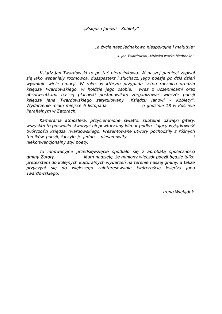 „Księdzu Janowi – Kobiety” „a życie nasz jednakowo niespokojne i malutkie” x. Jan Twardowski „Mrówko ważko biedronko” Ksiądz Jan Twardowski to postać nietuzinkowa. W naszej pamięci zapisał się jako wspaniały rozmówca, duszpasterz i słuchacz. Jego poezja po dziś dzień wywołuje wiele emocji. W roku, w którym przypada setna rocznica urodzin księdza Twardowskiego, w hołdzie jego osobie, wraz z uczennicami oraz absolwentkami naszej placówki postanowiłam zorganizować wieczór poezji księdza Jana Twardowskiego zatytułowany „Księdzu Janowi – Kobiety”. Wydarzenie miało miejsce 6 listopada o godzinie 18 w Kościele Parafialnym w Zatorach. Kameralna atmosfera, przyciemnione światło, subtelne dźwięki gitary, wszystko to pozwoliło stworzyć niepowtarzalny klimat podkreślający wyjątkowość twórczości księdza Twardowskiego. Prezentowane utwory pochodziły z różnych tomików poezji, łączyło je jedno – niesamowity i niekonwencjonalny styl poety. To innowacyjne przedsięwzięcie spotkało się z aprobatą społeczności gminy Zatory. Mam nadzieję, że miniony wieczór poezji będzie tylko pretekstem do kolejnych kulturalnych wydarzeń na terenie naszej gminy, a także przyczyni się do większego zainteresowania twórczością księdza Jana Twardowskiego. Irena Wielądek