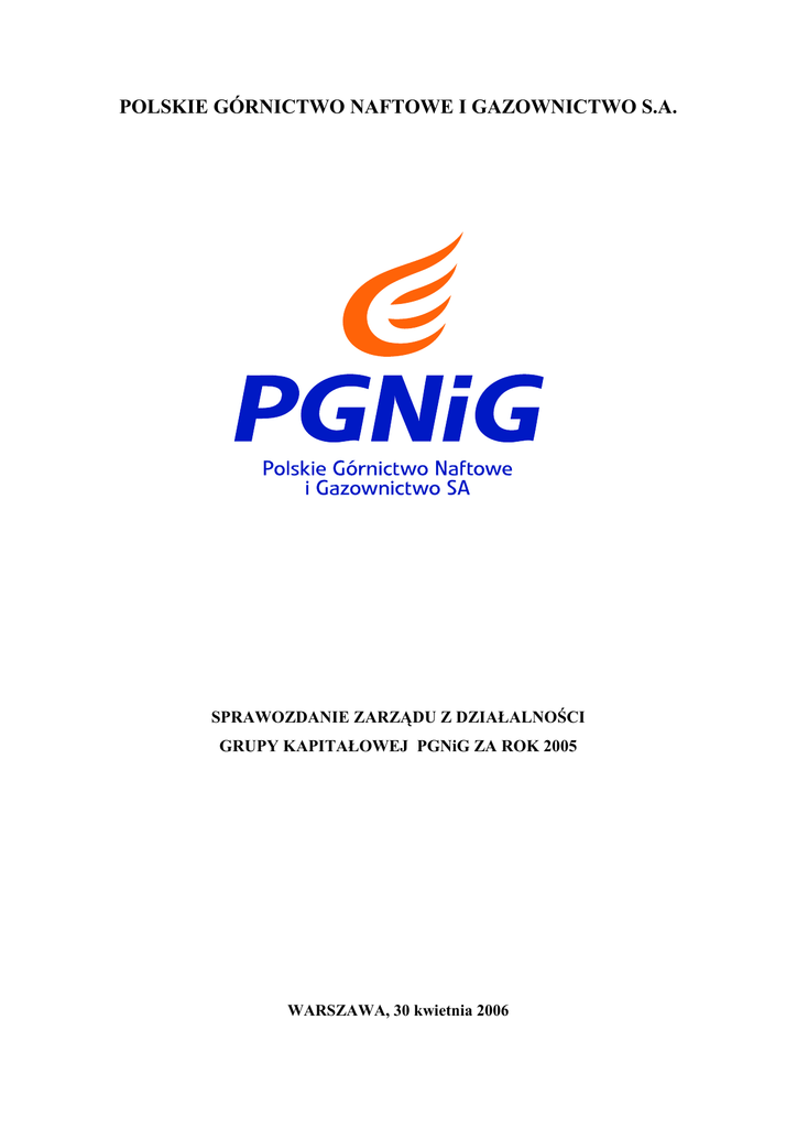 POLSKIE GÓRNICTWO NAFTOWE I GAZOWNICTWO S.A. SPRAWOZDANIE ZARZĄDU Z DZIAŁALNOŚCI GRUPY KAPITAŁOWEJ PGNiG ZA ROK 2005 WARSZAWA, 30 kwietnia 2006 Spis rozdziałów Spis rozdziałów ..................................................................................................... 1 Rozdział I: Podstawowe dane o Grupie Kapitałowej PGNiG.............................. 4 1. Powstanie PGNiG S.A. ..................................................................................................... 4 2. Struktura organizacyjna Grupy Kapitałowej PGNiG........................................................ 5 3. Zmiany struktury GK PGNiG w 2005 roku ...................................................................... 9 4. Zatrudnienie ...................................................................................................................... 9 Rozdział II: Organy Spółki PGNiG S.A. ............................................................. 9 1. Zarząd................................................................................................................................ 9 1.1. Zmiany w Zarządzie................................................................................................... 9 1.2. Podział kompetencji członków Zarządu .................................................................... 9 1.3. Umowy z członkami Zarządu .................................................................................... 9 1.4. Prokurenci .................................................................................................................. 9 2. Rada nadzorcza ................................................................................................................. 9 Rozdział III: Zmiany w zasadach zarządzania..................................................... 9 Rozdział IV: Otoczenie regulacyjne .................................................................... 9 1. Prawo Energetyczne .......................................................................................................... 9 1.1. Koncesje ..................................................................................................................... 9 1.2. Polityka taryfowa ....................................................................................................... 9 1.3. Zmiany w taryfach PGNiG S.A. ................................................................................ 9 1.4. Zmiany w taryfach Spółek Gazownictwa .................................................................. 9 1.5. Ryzyka taryfowe ........................................................................................................ 9 2. Prawo geologiczne i górnicze............................................................................................ 9 Rozdział V: Publiczna emisja akcji...................................................................... 9 Rozdział VI: Struktura akcjonariatu..................................................................... 9 Rozdział VII: Obrót.............................................................................................. 9 1. Struktura sprzedaży i zakupów.......................................................................................... 9 2. Podstawowe umowy handlowe ......................................................................................... 9 3. Planowane działania w obszarze obrotu............................................................................ 9 4. Ryzyka w obszarze obrotu ................................................................................................ 9 Strona 2 z 102 Rozdział VIII: Dystrybucja ................................................................................... 9 1. Działalność Spółek Gazownictwa w 2005 roku................................................................. 9 2. Planowane kierunki rozwoju Spółek Gazownictwa........................................................... 9 3. Ryzyka w obszarze dystrybucji......................................................................................... 9 Rozdział IX: Poszukiwania złóż .......................................................................... 9 1. Prace poszukiwawcze w 2005 roku................................................................................... 9 2. Działalność Spółek sektora poszukiwań ........................................................................... 9 3. Wspólne przedsięwzięcia .................................................................................................. 9 4. Planowane kierunki prac poszukiwawczych..................................................................... 9 5. Ryzyka działalności poszukiwawczej ............................................................................... 9 Rozdział X: Eksploatacja złóż.............................................................................. 9 1. Prace w obszarze eksploatacji złóż w 2005 roku .............................................................. 9 2. Inwestycje w obszarze górnictwa naftowego.................................................................... 9 3. Perspektywy rozwoju działalności PGNiG S.A. ............................................................... 9 4. Ryzyka i zagrożenia .......................................................................................................... 9 5. Ochrona środowiska naturalnego ...................................................................................... 9 Rozdział XI: Przesył............................................................................................. 9 Rozdział XII: Pozostałe wydarzenia .................................................................... 9 1. Wyniki finansowe w 2005 roku ........................................................................................ 9 1.1. Podstawowe wielkości ekonomiczno-finansowe ................