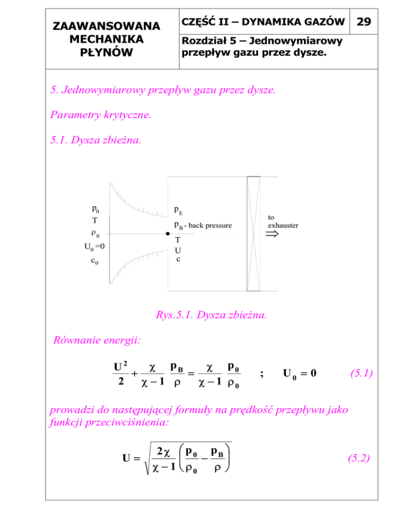 29 CZĘŚĆ II – DYNAMIKA GAZÓW ZAAWANSOWANA MECHANIKA PŁYNÓW Rozdział 5 – Jednowymiarowy przepływ gazu przez dysze. 5. Jednowymiarowy przepływ gazu przez dysze. Parametry krytyczne. 5.1. Dysza zbieżna. p0 pE T ρ to exhauster p B - back pressure 0 ⇒ T U c U0 =0 c0 Rys.5.1. Dysza zbieżna. Równanie energii: χ pB χ p0 U2 + = 2 χ−1 ρ χ − 1 ρ0 ; U0 = 0 (5.1) prowadzi do następującej formuły na prędkość przepływu jako funkcji przeciwciśnienia: U= 2 χ p0 pB − χ − 1 ρ0 ρ (5.2) 30 CZĘŚĆ II – DYNAMIKA GAZÓW ZAAWANSOWANA MECHANIKA PŁYNÓW Rozdział 5 – Jednowymiarowy przepływ gazu przez dysze. lub jako funkcji stosunku ciśnień: U= χ −1 χ p p 2χ 0 B 1 − χ − 1 ρ 0 p0 (5.3) Prędkość dźwięku na wylocie z dyszy: c2 = χ p ρ c 20 U2 c2 + = 2 χ−1 χ−1 (5.4) stąd prędkość dźwięku wynosi c 2 = c 02 − χ −1 2 U 2 (5.5) 5.2. Klasyfikacja przepływów ściśliwych. Elipsa adiabatycznego przepływu ustalonego. Subsonic C0 C M=1 Incompressible U<c Supersonic Transonic U=c c U> Hypersonic V V max Rys.5.2. Elipsa adiabatycznego przepływu ustalonego dla przepływu ścisliwego. ZAAWANSOWANA MECHANIKA PŁYNÓW CZĘŚĆ II – DYNAMIKA GAZÓW 31 Rozdział 5 – Jednowymiarowy przepływ gazu przez dysze. Przepływ nieściśliwy. Prędkość jest mała w porównaniu z prędkością dźwięku. Zmiany w c są bardzo małe w porównaniu ze zmianami U. Poddźwiękowy przepływ ściśliwy. Prędkości przepływu i dźwięku mają porównywalne wartości, ale pierwsza z nich jest mniejsza niż druga. Zmiany liczby Macha następują głównie dzięki zmianom U, i tylko wtórnie poprzez zmiany w c. Przepływ okołodźwiękowy. Różnica pomiędzy U i c jest nieporównywalna z wartościami obu prędkości U i c. Zmiany w U i c mają porównywalną wartość. Przepływ naddźwiękowy. Prędkości przepływu i dźwięku mają porównywalne wartości, ale pierwsza z nich jest większa niż druga. Zmiany liczby Macha mają miejsce poprzez znaczne zmiany w obu prędkościach U i c. Przepływ hipersoniczny. Prędkość przepływu jest dużo większa od prędkości dźwięku. Zmiany prędkości są bardzo małe, tak więc zmiany liczby Macha są prawie wyłącznie wynikiem zmian w c. CZĘŚĆ II – DYNAMIKA GAZÓW ZAAWANSOWANA MECHANIKA PŁYNÓW 32 Rozdział 5 – Jednowymiarowy przepływ gazu przez dysze. 5.3. Parametry krytyczne przepływu: są to parametry płynu kiedy prędkość przepływu równa jest lokalnej prędkości dźwięku: U ∗2 = c 20 − χ−1 2 U∗ χ (5.6) stąd prędkość krytyczna jest: U ∗2 = 2c 20 χ+1 = 2χRT0 χ+1 (5.7) Związki pomiędzy parametrami krytycznymi i parametrami stagnacji: U∗ c0 T∗ T0 = = 2 χ+1 2 χ+1 2 = p 0 χ + 1 p∗ ρ∗ (5.8) (5.9) χ χ −1 2 = ρ 0 χ + 1 1 χ−1 (5.10) (5.11) ZAAWANSOWANA MECHANIKA PŁYNÓW CZĘŚĆ II – DYNAMIKA GAZÓW 33 Rozdział 5 – Jednowymiarowy przepływ gazu przez dysze. Prędkość krytyczna może być użyta jako prędkość odniesienia w definicji prędkości bezwymiarowej: M∗ = U U∗ (5.12) 5.4. Wydatek masowy przepływu przez dyszę: • m = ρUA (5.13) Wstawiając równanie (5.3) i związek p ρ = ρ0 p0 1 χ równanie (5.13) przyjmuje postać: χ +1 2 • χ χ p p 2χ m= A p 0ρ 0 B − B χ−1 p0 p0 (5.14) maksymalny wydatek masowy przepływu: 2 mm = A χ + 1 • χ +1 2 ( χ − 1) χ p 0ρ 0 (5.15) CZĘŚĆ II – DYNAMIKA GAZÓW ZAAWANSOWANA MECHANIKA PŁYNÓW U[m/s] 34 Rozdział 5 – Jednowymiarowy przepływ gazu przez dysze. Supersonic Subsonic 5 p =10 Pa a) 0 C* T0 =293 k ρ =1,2 kg/m3 0 m/A b) Ma c) Ma * Rys.5.3. Typowe zmiany parametrów w przepływie izentropowym. ZAAWANSOWANA MECHANIKA PŁYNÓW CZĘŚĆ II – DYNAMIKA GAZÓW Rozdział 5 – Jednowymiarowy przepływ gazu przez dysze. Praca dyszy rozbieżnej przy zmianie przciwciśnienia: Regime II Regime I m/A p /p 0 B Rys.5.4. Zmiana wydatku masowego w dyszy zbieżnej. Warunki pracy I Warunki pracy II p p∗ p p p p E ≅ B p p 0 0 p p Ma < 1 Ma = 1 B > p p 0 0 • pB m - zależne od p0 A B < ∗ p p 0 0 E = ∗ p p 0 0 • pB m - niezależne od p0 A 35 ZAAWANSOWANA MECHANIKA PŁYNÓW CZĘŚĆ II – DYNAMIKA GAZÓW 36 Rozdział 5 – Jednowymiarowy przepływ gazu przez dysze. 5.5. Różnica pomiędzy poddźwiękowym i naddźwiękowym przepływem w kanale o zmiennym przekroju. Równanie ciągłości w logarytmicznej różniczkowej postaci d [ln (ρAU ) ] = 0 (5.16) lub d ( ln ρ ) + d ( ln A ) + d ln U = 0 (5.17) lub dρ dA dU + + =0 ρ A U (5.18) dzieląc ostatnie równanie przez dx otrzymujemy: 1 dρ 1 dA 1 dU + + =0 ρ dx A dx U dx (5.19) CZĘŚĆ II – DYNAMIKA GAZÓW ZAAWANSOWANA MECHANIKA PŁYNÓW 37 Rozdział 5 – Jednowymiarowy przepływ gazu przez dysze. Licząc pochodną jak dla funkcji złożonej i wykorzystując wzór na prędkość dźwięku: dρ dρ dp 1 dp = = dx dp dx c 2 dx (5.20) Z równania zachowania pędu: dp dU = −ρU dx dx (5.21) stąd gradient gęstości przyjmuje formę: dρ ρU dU =− 2 dx c dx (5.22) Wstawienie równania (5.22) do (5.19) prowadzi do następującego związku: − U dU 1 dU 1 dA + = − A dx c 2 dx U dx (5.23) lub ( Ma 2 U = ) dU dx A −1 dA dx (5.24) ZAAWANSOWANA MECHANIKA PŁYNÓW Warunki pracy I CZĘŚĆ II – DYNAMIKA GAZÓW Rozdział 5 – Jednowymiarowy przepływ gazu przez dysze. Ma < 1 - przepływ podźwiękowy przypadek 1: dA > 0 - dysza rozbieżna dx ⇓ dU < 0 - przepływ opóźniający dx przypadek 2: dA < 0 - dysza zbieżna dx ⇓ dU > 0 - przepływ przyspieszający dx 38 ZAAWANSOWANA MECHANIKA PŁYNÓW Warunki pracy II CZĘŚĆ II – DYNAMIKA GAZÓW Rozdział 5 – Jednowymiarowy przepływ gazu przez dysze. Ma > 1 - przepływ naddźwiękowy przypadek 1: dA > 0 - dysza rozbieżna dx ⇓ dU > 0 - przepływ przyspieszający dx przypadek 2: dA < 0 - dysza zbieżna dx ⇓ dU < 0 - przepływ opóźniający dx 39 CZĘŚĆ II – DYNAMIKA GAZÓW ZAAWANSOWANA MECHANIKA PŁYNÓW Rozdział 5 – Jednowymiarowy przepływ gazu przez dy