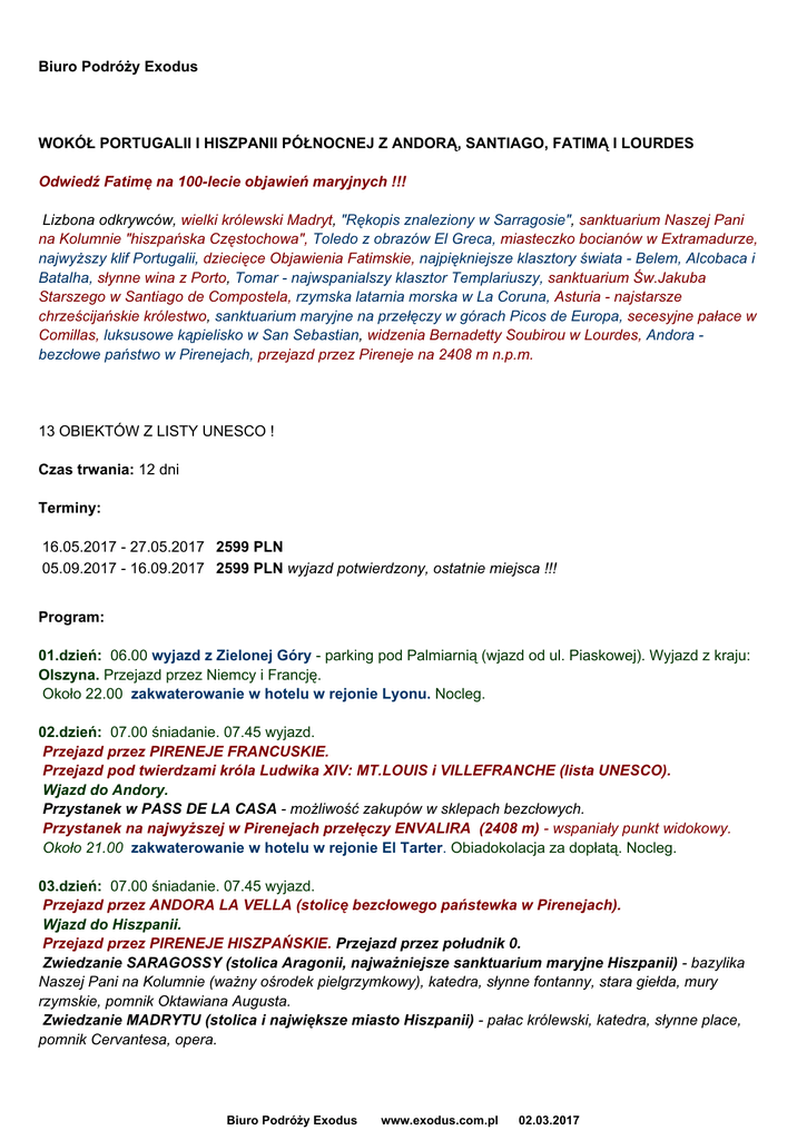 Biuro Podróży Exodus WOKÓŁ PORTUGALII I HISZPANII PÓŁNOCNEJ Z ANDORĄ, SANTIAGO, FATIMĄ I LOURDES Odwiedź Fatimę na 100-lecie objawień maryjnych !!! Lizbona odkrywców, wielki królewski Madryt, "Rękopis znaleziony w Sarragosie", sanktuarium Naszej Pani na Kolumnie "hiszpańska Częstochowa", Toledo z obrazów El Greca, miasteczko bocianów w Extramadurze, najwyższy klif Portugalii, dziecięce Objawienia Fatimskie, najpiękniejsze klasztory świata - Belem, Alcobaca i Batalha, słynne wina z Porto, Tomar - najwspanialszy klasztor Templariuszy, sanktuarium Św.Jakuba Starszego w Santiago de Compostela, rzymska latarnia morska w La Coruna, Asturia - najstarsze chrześcijańskie królestwo, sanktuarium maryjne na przełęczy w górach Picos de Europa, secesyjne pałace w Comillas, luksusowe kąpielisko w San Sebastian, widzenia Bernadetty Soubirou w Lourdes, Andora bezcłowe państwo w Pirenejach, przejazd przez Pireneje na 2408 m n.p.m. BEZ PRZEJAZDÓW NOCNYCH ! 13 OBIEKTÓW Z LISTY UNESCO ! Czas trwania: 12 dni Terminy: 16.05.2017 - 27.05.2017 2599 PLN 05.09.2017 - 16.09.2017 2599 PLN wyjazd potwierdzony, ostatnie miejsca !!! Program: 01.dzień: 06.00 wyjazd z Zielonej Góry - parking pod Palmiarnią (wjazd od ul. Piaskowej). Wyjazd z kraju: Olszyna. Przejazd przez Niemcy i Francję. Około 22.00 zakwaterowanie w hotelu w rejonie Lyonu. Nocleg. 02.dzień: 07.00 śniadanie. 07.45 wyjazd. Przejazd przez PIRENEJE FRANCUSKIE. Przejazd pod twierdzami króla Ludwika XIV: MT.LOUIS i VILLEFRANCHE (lista UNESCO). Wjazd do Andory. Przystanek w PASS DE LA CASA - możliwość zakupów w sklepach bezcłowych. Przystanek na najwyższej w Pirenejach przełęczy ENVALIRA (2408 m) - wspaniały punkt widokowy. Około 21.00 zakwaterowanie w hotelu w rejonie El Tarter. Obiadokolacja za dopłatą. Nocleg. 03.dzień: 07.00 śniadanie. 07.45 wyjazd. Przejazd przez ANDORA LA VELLA (stolicę bezcłowego państewka w Pirenejach). Wjazd do Hiszpanii. Przejazd przez PIRENEJE HISZPAŃSKIE. Przejazd przez południk 0. Zwiedzanie SARAGOSSY (stolica Aragonii, najważniejsze sanktuarium maryjne Hiszpanii) - bazylika Naszej Pani na Kolumnie (ważny ośrodek pielgrzymkowy), katedra, słynne fontanny, stara giełda, mury rzymskie, pomnik Oktawiana Augusta. Zwiedzanie MADRYTU (stolica i największe miasto Hiszpanii) - pałac królewski, katedra, słynne place, pomnik Cervantesa, opera. Biuro Podróży Exodus www.exodus.com.pl 02.03.2017 Około 21.00 zakwaterowanie w hotelu w rejonie Madrytu. Obiadokolacja za dopłatą. Nocleg. 04.dzień: 07.00 śniadanie. 07.45 - wyjazd. Zwiedzanie TOLEDO (dawna stolicy Hiszpanii, siedziba głowy kościoła, lista UNESCO) katedra prymasowska, ratusz, zamek, stare miasto, synagoga, mosty na Tagu (z przewodnikiem lokalnym). Wjazd do Portugalii. Spacer po FATIMIE (sanktuarium maryjne i słynne miejsce pielgrzymkowe, "portugalska Częstochowa") - bazylika, plac pielgrzymi, kaplica objawień, kościół św. Trójcy. Około 20.00 zakwaterowanie w hotelu w Fatimie. Obiadokolacja za dopłatą. Możliwość udziału w nocnej procesji świec. Nocleg. 05.dzień: 07.00 śniadanie. 07.45 - wyjazd. Zwiedzanie LIZBONY (stolica i największe miasto Portugalii, lista UNESCO) - most 25 Kwietnia (kopia mostu Golden Gate w San Francisco) nad ujściem Tagu, sanktuarium Chrystusa Króla (wybitny punkt widokowy), stara dzielnica Alfama z katedrą i kościołem św. Antoniego, dzielnica handlowa Baixa z Placem Handlowym, reprezentacyjnym deptakiem Rua Augusta i windą św. Justyny, dzielnica portowa Belem z najpiękniejszym na świecie kalsztorem hieronimitów (miejsce pochówku Vasco da Gamy), wieżą Belem oraz Pomnikiem Pdkrywców. Czas wolny. Zwiedzanie PAŁACU QUELUZ (barokowa letnia rezydencja królów Portugalii). Około 20.00 powrót do hotelu w Fatimie. Obiadokolacja za dopłatą. Możliwość udziału w nocnej procesji świec. Nocleg. 06.dzień: 07.00 śniadanie. 07.45 - wyjazd. Zwiedzanie TOMAR (lista UNESCO) - największy na świecie romański klasztor-zamek templariuszy z "najpiękniejszym oknem świata". Zwiedzanie BATALHA (lista UNESCO) - klasztor wotywny Matki Boskiej Zwycięskiej z grobowcami królów Portugalii oraz Henryka Żeglarza i słynnymi gotyckimi "niedokończonymi kaplicami". Zwiedzanie ALCOBACA (lista UNESCO) - największy w Portugalii klasztor cystersów z grobowcami najbardziej romantycznej pary średniowiecznej Portugalii: króla Pedro I oraz Ines de Castro Przystanek w SITIO - urokliwe sanktuarium maryjne na najwyższym klifie Portugalii. Przystanek w NAZARE (znane kąpielisko nad Atlantykiem) - możliwość kąpieli w oceanie. Około 20.00 powrót do hotelu w Fatimie. Obiadokolacja za dopłatą. Możliwość udziału w nocnej procesji świec. Nocleg. 07.dzień: 07.00 śniadanie. 07.45 wyjazd. Przystanek w VILLA NOVA DE GAIA zwiedzanie jednej z wytwórni słynnych win Porto, z degustacją i możliwością zakupów. Zwiedzanie PORTO (2. największe miasto Portugalii, lista UNESCO) romańska katedra, stare miasto, dworzec Sao Bento, most Ludwika II na rzece Douro, giełda, pomnik i dom rodzinny Henryka Żeglarza, kolorowa rybacka dzielnica Ribeira. Czas wolny. Przystanek w BOM JESUS DA MONTE malownicze sanktuarium na wzgórzu ze słynnymi barokowymi schodami. Wjazd do Hiszpanii. Około 20.00 zakwaterowanie w hotelu w Santiago de Compostella. Obiadokolacja za dopłatą. Nocleg. 08.dzień: 07.00 śniadanie. 07.45 wyjazd. Zwiedzanie SANTIAGO DE COMPOSTELA (stolica Galicji, sanktuarium św. Jakuba Apostoła Starszego, lista UNESCO) - katedra z grobem św. Jakuba, renesansowe stare miasto.Możliwość udziału w uroczystej pielgrzymiej mszy świętej. Przystanek w La CORUA (lista UNESCO) - starorzymska Wieża Herkulesa (najstarsza czynna latarnia Biuro Podróży Exodus www.exodus.com.pl 02.03.2017 morska na świecie). Około 20.00 zakwaterowanie w hotelu w rejonie Oviedo. Obiadokolacja za dopłatą. Nocleg. 09.dzień: 07.00 śniadanie. 07.45 wyjazd. Zwiedanie OVIEDO (stolica As