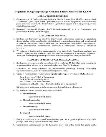 Regulamin IX Ogólnopolskiego Konkursu Filmów Amatorskich KLAPS I. ORGANIZATOR KONKURSU 1. Organizatorem IX Ogólnopolskiego Konkursu Filmów Amatorskich KLAPS, zwanego dalej „Konkursem”, jest Zespół Szkół Ogólnokształcących nr 6 w Bydgoszczy, reprezentowany przez Samorząd Uczniowski Zespołu Szkół Ogólnokształcących nr 6 w Bydgoszczy, zwany dalej „Organizatorem”. 2. Samorząd Uczniowski Zespołu Szkół Ogólnokształcących nr 6 w Bydgoszczy jest jednocześnie Komisją Kwalifikacyjną. II. ZAŁOŻENIA KONKURSU 1. Konkurs jest skierowany do młodych, kreatywnych ludzi, którzy interesują się produkcja filmową i chcą podjąć rywalizację z rówieśnikami, celem doskonalenia swoich umiejętności w zakresie filmowania. Celem Konkursu jest promowanie amatorskiej kinematografii, rozwój zainteresowań środowiskiem filmowym i odnalezienie młodych, ambitnych twórców. 2. W związku z koniecznością przestrzegania praw autorskich, Organizator zachęca, aby teledyski zgłaszane do Konkursu były tworzone we współpracy z lokalnymi zespołami. Autor jest zobowiązany posiadać pozwolenie na wykorzystywanie cudzych materiałów. III. ZASADY UCZESTNICTWA I ZGŁASZANIA PRAC 1. Konkurs jest przeznaczony dla wszystkich osób w wieku od 15 do 24 lat, które znajdują się w tym przedziale wiekowym w momencie zgłaszania filmu do Konkursu. 2. Uczestnicy nie mogą zajmować się profesjonalnie produkcją filmową, telewizyjną czy scenariuszową. Autor nie może czerpać zysków z filmu. 3. Udział w Konkursie jest równoważny z wpłatą wpisowego w wysokości 20 zł na konto: Rada Szkoły przy VI LO w Bydgoszczy Bank Spółdzielczy w Bydgoszczy 75 8142 0007 0000 8413 2000 0001 z dopiskiem „KLAPS – Imię i Nazwisko (takie jak w zgłoszeniu)”. Nie uiszczenie wpisowego jest równoznaczne z dyskwalifikacją z Konkursu. 4. Do Konkursu można zgłaszać następujące produkcje: a) film fabularny · czas trwania do 15 minut b) film dokumentalny · czas trwania do 10 minut c) film animowany · czas trwania do 5 minut d) teledysk · czas trwania do 5 minut 5. Każdy uczestnik ma prawo zgłosić dowolną ilość prac. W przypadku zgłoszenia więcej niż jednego filmu należy wpłacić wpisowe tylko raz. 6. Uczestnikiem zgłaszającym się do Konkursu może być jedna osoba lub grupa osób. W przypadku zgłoszenia produkcji wykonywanej przez grupę osób zobowiązani są oni do wybrania przedstawiciela, który wypełni zgłoszenie podając swoje dane. Przedstawiciel jest jedynym oficjalnym uczestnikiem Konkursu. 7. Do udziału w Konkursie nie będą dopuszczone prace: a) wykonane na odpłatne zlecenie b) realizowane przy udziale członków Komisji Kwalifikacyjnej, Jury lub Organizatora c) do których prawa autorskie zostały przekazane osobom trzecim. d) zawierające treści wulgarne lub obraźliwe dla jakiejkolwiek z grup etnicznych lub społecznych e) nakłaniające do spożywania alkoholu i zażywania narkotyków f) propagujące agresję oraz teorie, których rozpowszechnianie jest prawnie zabronione. 8. Film należy umieścić w Internecie w serwisie YouTube, a następnie na dysku internetowym (preferowany Dysk Google) w formacie .mp4, a przy rejestracji podać link do pracy, który będzie aktywny przez cały czas trwania konkursu. W nazwie pliku należy podać tytuł pracy, imię i nazwisko autora. 9. Zgłoszenie należy wypełnić na stronie internetowej w nieprzekraczalnym terminie do 05.05.2017 r. 10. W przypadku otrzymania niewystarczającej liczby zgłoszeń Organizator zastrzega możliwość wydłużenia terminu zgłaszania prac i przeniesienia finału Konkursu na późniejszy termin. 11. Uczestnik Konkursu zobowiązuje się do przestrzegania niniejszego Regulaminu i harmonogramu porządkowo-organizacyjnego. 12. Organizator ma prawo usunąć pracę Uczestnika z Konkursu z powodu nieprzestrzegania zasad Regulaminu. 13. Uczestnik Konkursu wyraża zgodę na przetwarzanie i prezentację danych osobowych na stronie internetowej Konkursu i w mediach, zgodnie z ustawą z dnia 29.08.1997 r. o Ochronie Danych Osobowych (Dz. U. z 2015r. poz. 2135 z późn. zm.). 14. Organizator i administrator strony internetowej Konkursu nie biorą odpowiedzialności za wszelkie szkody spowodowane użytkowaniem witryny. 15. Autor zgłaszający film automatycznie wyraża zgodę na wykonywanie kopii filmu, emitowanie swojego dzieła podczas pokazów filmowych w trakcie trwania Konkursu oraz po jego zakończeniu według uznania Organizatora. 16. Autor wyraża zgodę na wykorzystanie zdjęć i fragmentów filmów w materiałach reklamowych oraz prezentacjach medialnych (prasa, radio, telewizja, Internet, publiczne pokazy specjalne) promujących Konkurs, filmy konkursowe i twórców biorących udział w Konkursie. IV. OCENA PRAC KONKURSOWYCH 1. Szczegółowe kryteria oceny: a. Podstawowym kryterium oceny będzie pomysłowość, kreatywność, estetyka wykonania oraz jakość nadesłanych prac. b. Komisja Kwalifikacyjna oceniać będzie zgodność prac z regulaminem, każdy projekt będzie rozpatrywany indywidualnie. c. Komisja Kwalifikacyjna porównywać będzie również jakość i oryginalność każdego nadesłanego filmu. Na podstawie tych porównań zostaną wybrani finaliści konkursu. 2. Informacje na temat wyników prac Komisji Kwalifikacyjnej najpóźniej 18.05.2017 r. na stronie internetowej www.kfaklaps.pl. dostępne będą 3. Produkcje zakwalifikowane przez Komisję Kwalifikacyjną do udziału w Konkursie oceni specjalnie do tego celu powołane Jury, które wyłoni zwycięzcę w każdej z czterech kategorii wymienionych w pkt. III niniejszego Regulaminu. 4. Skład Jury ustala Organizator, który powoła do składu przynajmniej jedną osobę posiadającą wiedzę i doświadczenie w zakresie produkcji filmowej. 5. Decyzje Jury są ostateczne, niepodważalne i podejmowane większością głosów. 6. Zwycięzcy Konkursu zostaną wyłonieni podczas Gali Finałowej. V. NAGRODY 1. Osoby,