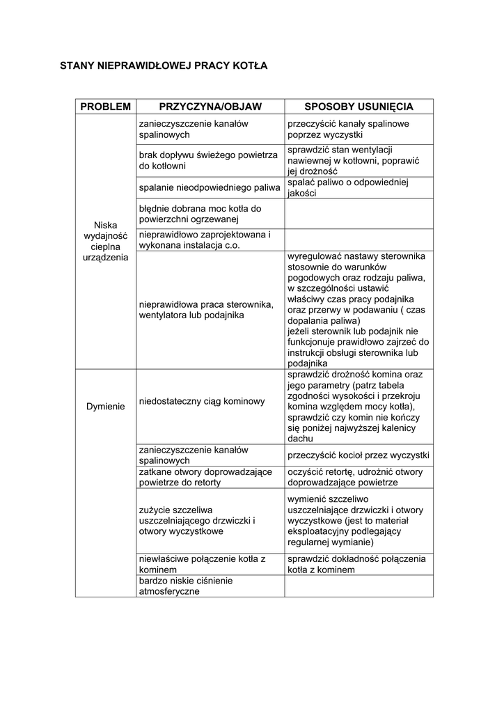 stany nieprawidłowej pracy kotła problem przyczyna/objaw