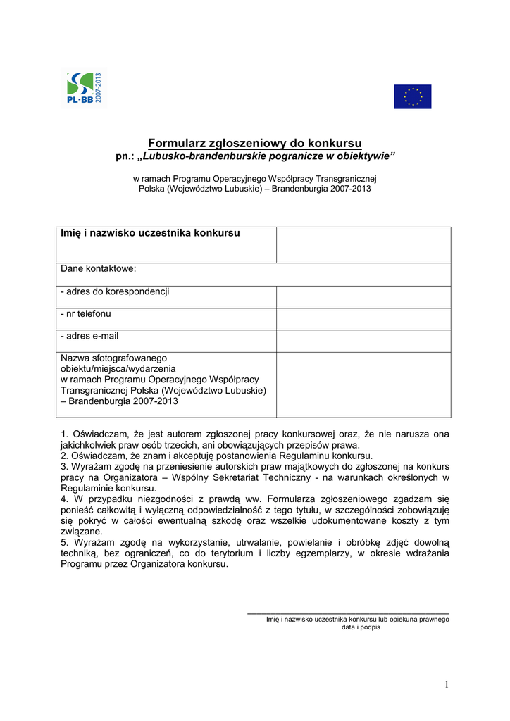 Formularz zgłoszeniowy do konkursu pn.: „Lubusko-brandenburskie pogranicze w obiektywie” w ramach Programu Operacyjnego Współpracy Transgranicznej Polska (Województwo Lubuskie) – Brandenburgia 2007-2013 Imię i nazwisko uczestnika konkursu Dane kontaktowe: - adres do korespondencji - nr telefonu - adres e-mail Nazwa sfotografowanego obiektu/miejsca/wydarzenia w ramach Programu Operacyjnego Współpracy Transgranicznej Polska (Województwo Lubuskie) – Brandenburgia 2007-2013 1. Oświadczam, że jest autorem zgłoszonej pracy konkursowej oraz, że nie narusza ona jakichkolwiek praw osób trzecich, ani obowiązujących przepisów prawa. 2. Oświadczam, że znam i akceptuję postanowienia Regulaminu konkursu. 3. Wyrażam zgodę na przeniesienie autorskich praw majątkowych do zgłoszonej na konkurs pracy na Organizatora – Wspólny Sekretariat Techniczny - na warunkach określonych w Regulaminie konkursu. 4. W przypadku niezgodności z prawdą ww. Formularza zgłoszeniowego zgadzam się ponieść całkowitą i wyłączną odpowiedzialność z tego tytułu, w szczególności zobowiązuję się pokryć w całości ewentualną szkodę oraz wszelkie udokumentowane koszty z tym związane. 5. Wyrażam zgodę na wykorzystanie, utrwalanie, powielanie i obróbkę zdjęć dowolną techniką, bez ograniczeń, co do terytorium i liczby egzemplarzy, w okresie wdrażania Programu przez Organizatora konkursu. ___________________________________________ Imię i nazwisko uczestnika konkursu lub opiekuna prawnego data i podpis 1 * Dane opiekuna prawnego małoletniego uczestnika konkursu : 1. Imię i nazwisko: ……………………………………………………..…………………………………………………….. 2. Adres zamieszkania: …………………………………………………………………………………………………………… .................................................................................................................................................... 3. Adres korespondencyjny: …………………………………………………………………………………………………………… .................................................................................................................................................... 4. Nr telefonu, adres E-mail: …………………………………………………………………………………………………………… .................................................................................................................................................... ____________________________________ Imię i nazwisko opiekuna prawnego data i podpis Wyrażam zgodę na przetwarzanie danych osobowych zawartych w niniejszym formularzu zgłoszeniowym na potrzeby przeprowadzenia konkursu zgodnie z ustawą z dnia 29.08.1997 r. o ochronie danych osobowych (Dz.U. z 2002r., Nr 101 poz.926 z późn. zm.) w zakresie koniecznym do prawidłowego przeprowadzenia konkursu, wyłonienia zwycięzcy i przyznania nagrody przez Organizatora – WST oraz w celach promocji konkursu. ______________________________ Imię i nazwisko uczestnika konkursu data i podpis * Dane wypełnia opiekun prawny małoletniego uczestnika konkursu 2