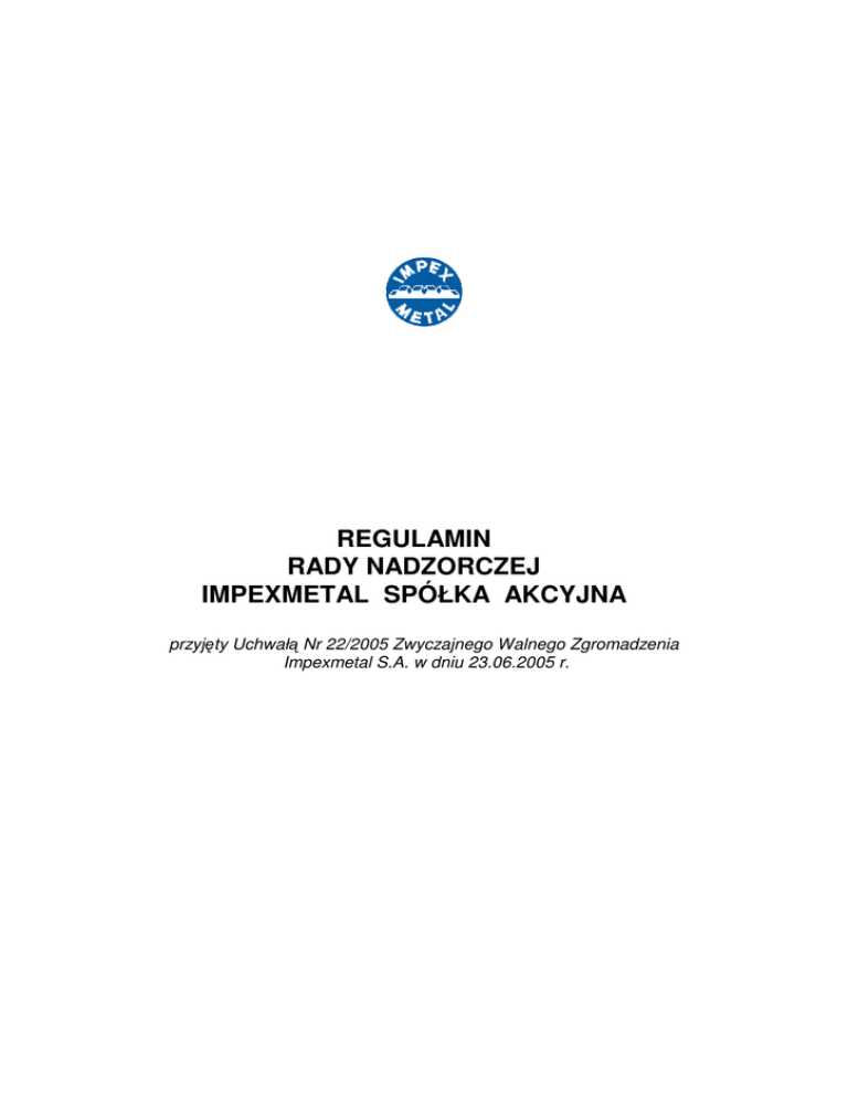 REGULAMIN RADY NADZORCZEJ IMPEXMETAL SPÓŁKA AKCYJNA przyj ty Uchwał Nr 22/2005 Zwyczajnego Walnego Zgromadzenia Impexmetal S.A. w dniu 23.06.2005 r. Regulamin Rady Nadzorczej Impexmetal S.A. I. POSTANOWIENIA OGÓLNE §1 Rada Nadzorcza Impexmetal S.A. działa na podstawie postanowie Statutu Spółki, uchwał Walnego Zgromadzenia, niniejszego Regulaminu oraz Kodeksu spółek handlowych i innych obowi zuj cych przepisów prawa. §2 Rada Nadzorcza sprawuje stały nadzór nad działalno ci Spółki we wszystkich dziedzinach jej działalno ci. Do szczególnych kompetencji Rady Nadzorczej nale y: 1. ocena sprawozdania Zarz du z działalno ci Spółki oraz sprawozdania finansowego Spółki i skonsolidowanego sprawozdania Grupy Kapitałowej za ubiegły rok obrotowy w zakresie ich zgodno ci z ksi gami i dokumentami, jak i ze stanem faktycznym oraz wniosków Zarz du dotycz cych podziału zysku albo pokrycia straty, a tak e składanie Walnemu Zgromadzeniu corocznego pisemnego sprawozdania z wyników tej oceny, 2. opiniowanie projektów Zgromadzeniu, uchwał przedkładanych przez Zarz d Walnemu 3. powoływanie i odwoływanie Prezesa Zarz du oraz pozostałych Członków Zarz du na wniosek Prezesa b d z własnej inicjatywy, 4. ustalanie zasad wynagradzania dla członków Zarz du, 5. zawieszanie w czynno ciach, z wa nych powodów, członka Zarz du lub całego Zarz du, 6. delegowanie członków Rady Nadzorczej na okres nie dłu szy ni trzy miesi ce do czasowego wykonywania czynno ci członków Zarz du Spółki, którzy zostali odwołani, zło yli rezygnacj albo z innych przyczyn nie mog sprawowa swoich czynno ci 7. na wniosek Zarz du udzielanie zezwolenia na tworzenie oddziałów za granic , 8. na wniosek Zarz du udzielanie zezwolenia na zbywanie aktywów trwałych o warto ci przekraczaj cej 1/20 cz kapitału zakładowego, 9. wyra anie zgody na nabywanie i zbywanie nieruchomo ci, u ytkowania wieczystego lub udziału w nieruchomo ci 10. dokonywanie wyboru biegłego sprawozdania finansowego, rewidenta przeprowadzaj cego badanie 11. przyjmowanie dla wewn trznych celów Spółki w formie uchwały jednolitego tekstu Statutu Spółki, 12. wyra anie zgody na tworzenie i przyst powanie do spółek prawa handlowego, z wyj tkiem sytuacji, gdy obejmowanie lub nabywanie akcji albo udziałów nast puje w wyniku realizacji przepisów ustawy z dnia 3 lutego 1993 r. o restrukturyzacji finansowej przedsi biorstw i banków oraz o zmianie niektórych Regulamin Rady Nadzorczej Impexmetal S.A. ustaw (Dz. U. Nr 18, poz. 82) oraz przepisów art. 21-30 ustawy z 30 sierpnia 1996 r. o komercjalizacji i prywatyzacji przedsi biorstw pa stwowych (Dz. U. Nr 118 poz. 561 z pó n. zm.). Ponadto Rada Nadzorcza przedstawia Walnemu Zgromadzeniu ocen sytuacji Spółki. §3 1. Członkowie Rady Nadzorczej powinni zachowa w tajemnicy wszelkie informacje, powzi te w zwi zku z wykonywaniem praw i obowi zków w Radzie i nie udost pnia ich innym osobom, je eli nie b dzie to niezb dne do prawidłowego pełnienia funkcji członka Rady Nadzorczej. 2. Członkowie Rady Nadzorczej uczestnicz w Walnych Zgromadzeniach Spółki, a w przypadku niemo no ci przybycia na nie, przedstawiaj Walnemu Zgromadzeniu pisemne wyja nienie. II. ORGANIZACJA PRACY RADY I WYKONYWANIE ZADA §4 Na pierwszym posiedzeniu w nowej kadencji Rada Nadzorcza wybiera ze swego grona Przewodnicz cego, Wiceprzewodnicz cego oraz Sekretarza. Posiedzenie to powinno si odby w ci gu trzydziestu dni po powołaniu przez Walne Zgromadzenie Rady Nadzorczej nowej kadencji. §5 1. Przewodnicz cy administruje i kieruje pracami Rady oraz reprezentuje j wobec pozostałych organów Spółki i innych osób. Do obowi zków Przewodnicz cego nale y w szczególno ci zwoływanie posiedze i przewodniczenie obradom. W przypadku nieobecno ci lub wynikaj cej z innych przyczyn niemo no ci pełnienia przez Przewodnicz cego jego funkcji, sprawuje j Wiceprzewodnicz cy Rady b d osoba wskazana przez Przewodnicz cego. 2. Przewodnicz cy ma prawo upowa ni Wiceprzewodnicz cego do wykonywania wszelkich jego uprawnie , wynikaj cych z niniejszego Regulaminu i Statutu Spółki. 3. Korzystaj c ze swych uprawnie , Przewodnicz cy Rady powinien stosowa si do uchwał i opinii Rady, a tak e – w miar potrzeby – uzgadnia swe decyzje z Wiceprzewodnicz cym Rady. §6 Sekretarz Rady organizuje prac Rady, czuwa nad jej obsług organizacyjnotechniczn i odpowiada za dokumentacj prac Rady. W zakresie tych funkcji Sekretarz podlega Przewodnicz cemu Rady. §7 Regulamin Rady Nadzorczej Impexmetal S.A. Obsług administracyjno-techniczn Rady zapewnia Zarz d. Zarz d wska e z grona pracowników Spółki osoby bezpo rednio odpowiedzialne za obsług organizacyjnotechniczn i dokumentacj prac Rady. Kontakt z Zarz dem Spółki w tym zakresie utrzymuje Sekretarz Rady. §8 Rada Nadzorcza mo e powoływa spo ród członków Rady zespoły robocze do zbadania poszczególnych zagadnie . Rada Nadzorcza ma prawo dania opracowania, dla jej potrzeb, na koszt Spółki, ekspertyz i opinii w zakresie nale cym do jej kompetencji; umowy z wykonawcami takich prac zawiera na wniosek Przewodnicz cego Rady Prezes Zarz du Spółki. §9 1. Rada Nadzorcza wykonuje swe czynno ci kolegialnie, mo e jednak oddelegowa swoich członków do samodzielnego pełnienia okre lonych czynno ci nadzorczych. 2. Zasady wykonywania nadzoru o którym mowa w ust.1. okre la Rada po zasi gni ciu opinii Zarz du. § 10 1. Przewodnicz cy uprawniony jest – w imieniu i na podstawie uchwały Rady Nadzorczej – za da zwołania posiedzenia Zarz du Spółki i umieszczenia okre lonych spraw w porz dku jego obrad. W posiedzeniu zwołanym z inicjatywy Rady bierze udział – bez prawa głosu – Przewodnicz cy lub inny, upowa niony przeze , członek Rady. Przewodnicz cy lub z jego upowa nienia inny członek Rady ma prawo, bez specjalnego zaproszenia, uczestniczy w ka dym posiedzeniu Zarz du, pod warunkiem uprzedniego powiadomienia Prezesa Zarz du. 2. Je eli Rada Nadzorcza została wybrana w drodze 