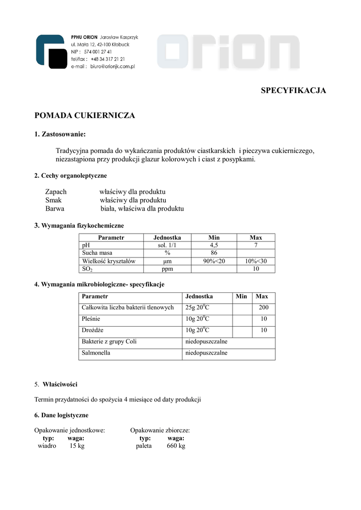 SPECYFIKACJA POMADA CUKIERNICZA 1. Zastosowanie: Tradycyjna pomada do wykańczania produktów ciastkarskich i pieczywa cukierniczego, niezastąpiona przy produkcji glazur kolorowych i ciast z posypkami. 2. Cechy organoleptyczne Zapach Smak Barwa właściwy dla produktu właściwy dla produktu biała, właściwa dla produktu 3. Wymagania fizykochemiczne Parametr pH Sucha masa Wielkość kryształów SO2 Jednostka sol. 1/1 % μm ppm Min 4,5 86 90%<20 Max 7 10%<30 10 4. Wymagania mikrobiologiczne- specyfikacje Parametr Jednostka 0 Min Max Całkowita liczba bakterii tlenowych 25g 20 C 200 Pleśnie 10g 200C 10 0 Drożdże 10g 20 C Bakterie z grupy Coli niedopuszczalne Salmonella niedopuszczalne 5. Właściwości Termin przydatności do spożycia 4 miesiące od daty produkcji 6. Dane logistyczne Opakowanie jednostkowe: typ: waga: wiadro 15 kg Opakowanie zbiorcze: typ: waga: paleta 660 kg 10