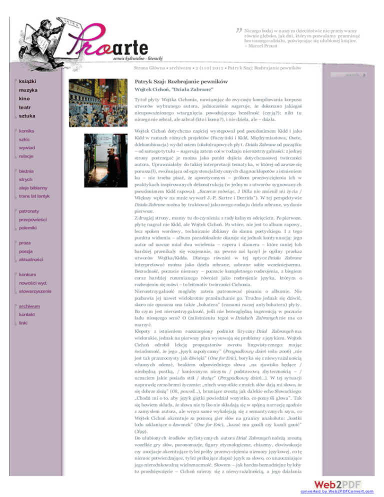 Niczego bodaj w naszy m dzieciństwie nie przeży wamy równie głęboko, jak dni, który m pozwalamy przeminąć bez naszego udziału, poświęcając się ulubionej książce. ~ Marcel Proust Strona Główna • archiwum • 2 (110) 2012 • Patry k Szaj: Rozbrajanie pewników search książki Patryk Szaj: Rozbrajanie pewników muzyka Wojtek Cichoń, "Działa Zabrane" kino Ty tuł pły ty Wojtka Cichonia, nawiązując do zwy czaju kompilowania korpusu utworów wy branego autora, jednocześnie sugeruje, że dokonano jakiegoś nieupoważnionego wtargnięcia powodującego bezsilność (czy ją?): nikt tu niczego nie zebrał, ale zabrał (kto i komu?), i nie dzieła, ale – działa. teatr sztuka komiks szkic wywiad relacje bieżnia strych aleje bibianny trans lat lantyk patronaty przepowieści polemiki proza poezja aktualności konkurs nowości wyd. stowarzyszenie archiwum kontakt linki Wojtek Cichoń doty chczas częściej wy stępował pod pseudonimem Kidd i jako Kidd w ramach różny ch projektów (Faczy ński i Kidd, Między miastowa, Osete, ddekombinacja) wy dał osiem (około)rapowy ch pły t. Działa Zabrane od początku – od samego ty tułu – sugerują zatem coś w rodzaju nierozstrzy galności: z jednej strony postrzegać je można jako punkt dojścia doty chczasowej twórczości autora. Uprawniałaby do takiej interpretacji tematy ka, w której od zawsze się porusza(ł), ewoluująca od egzy stencjalisty czny ch diagnoz kłopotów z istnieniem ku – nie trzeba pisać, że aporety czny m – próbom przezwy ciężenia ich w prakty kach inspirowany ch dekonstrukcją (w jedny m z utworów sy gnowany ch pseudonimem Kidd rapował: „Szczerze mówiąc, J Dilla nie zmienił mi ży cia / Większy wpły w na mnie wy warł J.-P. Sartre i Derrida”). W tej perspekty wie Działa Zabrane można by traktować jako swego rodzaju dzieła zebrane, wy danie pierwsze. Z drugiej strony , mamy tu do czy nienia z rady kalny m odcięciem. Po pierwsze, pły tę nagrał nie Kidd, ale Wojtek Cichoń. Po wtóre, nie jest to album rapowy , lecz spoken wordowy , technicznie zbliżony do slamu poety ckiego. I z tego punktu widzenia – album paradoksalnie okazuje się jednak konty nuacją: jego autor od zawsze miał dwa wcielenia – rapera i slamera – które mniej lub bardziej przenikały się wzajemnie, na pewno zaś łączy ł je ogólny przekaz utworów Wojtka/Kidda. Dlatego również w tej opty ce Działa Zabrane interpretować można jako dzieła zebrane, zabrane sobie wcześniejszemu. Bezradność, poczucie niemocy – poczucie kompletnego rozbrojenia, z biegiem coraz bardziej rozumianego również jako rozbrojenie języ ka, który m o rozbrojeniu się mówi – to leitmotiv twórczości Cichonia. Nierozstrzy galność mogłaby zatem patronować pisaniu o albumie. Nie pozbawia jej nawet wielokrotne przesłuchanie go. Trudno jednak się dziwić, skoro nie opuszcza ona także „bohatera” (czasami raczej anty bohatera) pły ty . Bo czy m jest nierozstrzy galność, jeśli nie bezwzględną ingerencją w poczucie ładu niosącego sens? O (za)istnieniu tegoż w Działach Zabranych nie ma co marzy ć. Kłopoty z istnieniem rozszczepiony podmiot liry czny Dział Zabranych ma wielorakie, jednak na pierwszy plan wy suwają się problemy z języ kiem. Wojtek Cichoń odrobił lekcję propagatorów zwrotu lingwisty cznego: mając świadomość, że jego „języ k zapoży czony ” (Przypadkowy dzień roku 2006) „nie jest tak przezroczy sty jak dźwięki” (One for Eric), bory ka się z niewy rażalnością własny ch odczuć, brakiem odpowiedniego słowa „na zjawisko będące / niezbędną pustką, / konieczny m niczy m / podstawową zby tecznością – / uczuciem jakie posiada stół / służąc” (Przypadkowy dzień…). W tej sy tuacji naprawdę czczo brzmi ży czenie: „niech wszy stkie z moich słów dają mi słowo, że się dobrze złożą” (Ok, powoli…), brzmiące zresztą jak dalekie echo Słowackiego: „Chodzi mi o to, aby języ k giętki powiedział wszy stko, co pomy śli głowa”. Tak się bowiem składa, że słowa nie ty lko nie składają się w spójną narrację zgodnie z zamy słem autora, ale wręcz same wy kolejają się z semanty czny ch szy n, co Wojtek Cichoń akcentuje za pomocą gier słów na granicy anakolutu: „kostki lodu szklaniące o dzwonek” (One for Eric), „kazać mu gonili czy kazali gonić” (X99). Do ulubiony ch środków sty listy czny ch autora Dział Zabranych należą zresztą wszelkie gry słów, paronomazje, figury ety mologiczne, chiazmy , ekwiwokacje czy asocjacje akcentujące ty leż próby przezwy ciężenia niemocy języ kowej, co tę niemoc potwierdzające, ty leż próbujące złapać języ k za słowo, co unaoczniające jego nieredukowalną wieloznaczność. Słowem – jak bardzo beznadziejne by łoby to przedsięwzięcie – Cichoń mierzy się z niewy rażalnością, a jego działania converted by Web2PDFConvert.com pozostają świadectwem wielkiej świadomości języ kowej, stanowiącej w moim przekonaniu główny atut sty listy czny Dział Zabranych. Na potwierdzenie wy starczy przy toczy ć złożenie z utworu A życie toczy się dalej: „proza ży cia – 100 pro za ży cia a ile pro po śmierci?/ apropos śmierci […]”. Na refleksji nad języ kiem nadbudowują się w Działach Zabranych kłopoty z tożsamością. „Problemem” Wojtka Cichonia jest nadmiar świadomości. Problem to zresztą – notabene – całkowicie uświadomiony : już w 2004 roku, jako Kidd, rapował: „mamy ciężej, bo widzimy więcej”. I jeśli wówczas, na pły cie Pesymisja, określał każdego człowieka jako „wielką wy graną molekularnej loterii”, to teraz szuka porozumienia z ty mi, którzy mają świadomość, że „są tak jak ja ty lko dziećmi galakty cznego wy bry ku” (Czuję się dziwnie). „Własna złożoność”, jakiej nakazuje nam dotknąć języ kiem, jest jednak źródłem bezradności, poczucia niedostosowania a