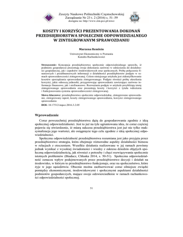 Zeszyty Naukowe Politechniki Częstochowskiej Zarządzanie Nr 23 t. 2 (2016) s. 51–59 Koszty i korzyści prezentowania dokonań przedsiębiorstwa społecznie … dostępne na: http://www.zim.pcz.pl/znwz KOSZTY I KORZYŚCI PREZENTOWANIA DOKONAŃ PRZEDSIĘBIORSTWA SPOŁECZNIE ODPOWIEDZIALNEGO W ZINTEGROWANYM SPRAWOZDANIU Marzena Remlein Uniwersytet Ekonomiczny w Poznaniu Katedra Rachunkowości Streszczenie: Koncepcja przedsiębiorstwa społecznie odpowiedzialnego sprawiła, iż podmioty gospodarcze prezentują swoje dokonania zarówno w odniesieniu do działalności gospodarczej, jak i aspektów środowiskowych oraz społecznych. Próbę połączenia finansowych i pozafinansowych informacji o działalności przedsiębiorstw podjęto w ramach sprawozdawczości zintegrowanej. Celem niniejszego artykułu jest zidentyfikowanie kosztów sporządzania sprawozdania zintegrowanego. Podjęto również próbę określenia korzyści, jakie odnoszą jednostki, przygotowując sprawozdanie zawierające zarówno informacje finansowe, jak i niefinansowe. Rozważania podjęte w artykule przybliżają istotę zintegrowanego sprawozdania oraz prezentują koszty i korzyści z tytułu wdrożenia i funkcjonowania systemu sprawozdawczości zintegrowanej. Słowa kluczowe: przedsiębiorstwo społecznie odpowiedzialne, zintegrowane sprawozdanie, zintegrowany raport, koszty zintegrowanego sprawozdania, korzyści zintegrowanego sprawozdania DOI: 10.17512/znpcz.2016.3.2.05 Wprowadzenie Coraz powszechniej przedsiębiorstwa dążą do gospodarowania zgodnie z ideą społecznej odpowiedzialności. Jest to już na tyle ugruntowana idea, że coraz częściej pojawia się stwierdzenie, iż miarą sukcesu przedsiębiorstwa jest już nie tylko maksymalizacja jego wartości, ale osiągnięcie tego celu zgodnie z ideą społecznej odpowiedzialności. Społeczna odpowiedzialność przedsiębiorstwa rozumiana jest jako przyjęta przez przedsiębiorstwo strategia, która obejmuje różnorodne aspekty działalności biznesu w relacjach z otoczeniem. Wszelkie działania realizowane w jej ramach powinny jednak wynikać z wysokiej świadomości i wiedzy z zakresu dziedzin objętych społeczną odpowiedzialnością, jak również z potrzeby i chęci rozwiązywania społecznie istotnych problemów (Biadacz, Chluska 2014, s. 50-51). Społeczna odpowiedzialność oznacza wpływ podejmowanych przez przedsiębiorstwo decyzji i działań na środowisko, w którym to przedsiębiorstwo funkcjonuje, oraz na społeczeństwo, które żyje w jego sąsiedztwie. Obecnie można zaobserwować coraz silniejsze związki pomiędzy ekonomicznymi, środowiskowymi i społecznymi aspektami działalności podmiotów gospodarczych, mające swoje odzwierciedlenie w ramach rachunkowości odpowiedzialności społecznej. 51 Marzena Remlein Produktem finalnym rachunkowości jest sprawozdanie finansowe, które stanowi istotne źródło informacji finansowych niezbędnych do oceny działalności podmiotu gospodarczego oraz determinujących decyzje użytkowników tychże sprawozdań. Sposób, w jaki prezentowane są informacje sprawozdawcze, powinien w głównej mierze uwzględniać potrzeby ich odbiorców (Kuzior i in. 2014, s. 13-16). W sprawozdaniu finansowym prezentowane są informacje finansowe o dokonaniach przedsiębiorstwa, natomiast wszelkie pozafinansowe informacje odnoszące się do działalności gospodarczej podmiotu przedstawiane są w odrębnych raportach. Oznacza to prezentację wycinkowego obrazu poszczególnych aspektów działalności. Próbę połączenia finansowych i pozafinansowych informacji o działalności podmiotu podjęto w ramach nowej koncepcji sprawozdawczości, określanej mianem sprawozdawczości zintegrowanej. Przedmiotem rozważań niniejszego artykułu jest zintegrowane sprawozdanie, które w sposób holistyczny prezentuje efekty prowadzonej działalności, zarówno w obszarze ekonomicznym, środowiskowym, jak i społecznym. Problem badawczy sprowadza się do próby odpowiedzi na pytanie: jakie są koszty przygotowania sprawozdania zintegrowanego oraz jakie korzyści osiąga przedsiębiorstwo społecznie odpowiedzialne, które prezentuje swoje dokonania w postaci sprawozdania zintegrowanego? Celem artykułu jest zidentyfikowanie kosztów sporządzania sprawozdania zintegrowanego. Podjęto również próbę określenia korzyści, jakie odnoszą jednostki, przygotowując sprawozdanie zawierające zarówno informacje finansowe, jak i niefinansowe. Osiągnięcie tak sformułowanego celu determinuje przyjęcie następującej struktury rozważań: zdefiniowanie pojęcia „zintegrowane sprawozdanie”, określenie kosztów, barier oraz problemów w procesie przygotowywania sprawozdania zintegrowanego, zidentyfikowanie korzyści sprawozdawczości zintegrowanej. Do osiągnięcia celu niniejszego artykułu niezbędne było zastosowanie adekwatnych metod badawczych. Posłużono się metodą analizy literatury, metodą porównań i analogii. Istota sprawozdania zintegrowanego Globalizacja gospodarki, rosnąca konkurencja na rynkach światowych oraz rosnące oczekiwania szeroko rozumianego społeczeństwa wobec przedsiębiorstw powoduje coraz donioślejsze znaczenie koncepcji społecznej odpowiedzialności. To z kolei pociąga za sobą konieczność przygotowywania przez przedsiębiorstwa sprawozdania, które prezentowałoby zarówno informacje o charakterze finansowym, dotyczące efektów prowadzonej działalności, jak i informacji o charakterze niefinansowym odnoszące się do zagadnień środowiska naturalnego (E-Environment), społecznych (S-Social) i ładu korporacyjnego (G-Governance). Scalenie sprawozdania finansowego z raportem ESG daje w efekcie produkt w postaci zintegrowanego sprawozdania (Remlein 2015, s. 151). 52 Koszty i korzyści prezentowania dokonań przedsiębiorstwa społecznie … Trwająca od co najmniej kilkunastu lat ożywiona dyskusja na temat społecznej odpowiedzialności biznesu oraz raportowania zintegrowanego zao