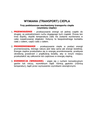 WYMIANA (TRANSPORT) CIEPŁA Trzy podstawowe mechanizmy transportu ciepła (wymiany ciepła): 1. P PR RZZEEW WO OD DZZEEN NIIEE - przekazywanie energii od jednej cząstki do drugiej, za pośrednictwem ruchu drgającego tych cząstek. Proces ten trwa dopóty, dopóki temperatura ciała nie zostanie wyrównana w całej rozpatrywanej objętości. Dotyczy to bezpośredniego kontaktu ciała z ciałem, części ciała z ciałem. WA AN NIIEE - przekazywanie ciepła w postaci energii 2. P PR RO OM MIIEEN NIIO OW promieniowania, którego natura jest taka sama jak energii świetlnej. Energia cieplna przekształca się w energię promieniowania, przebywa określoną przestrzeń z prędkością światła, aby w innym miejscu przekształcić się całkowicie lub częściowo w energię cieplną. NIIK KA AN NIIEE)) - wiąże się z ruchem konwekcyjnym 3. K KO ON NW WEEK KC CJJA A ((W WN gazów lub cieczy, wywołanym bądź różnicą gęstości (różnicą temperatur), bądź przez wymuszenie czynnikami zewnętrznymi. PRZEWODZENIE Stan cieplny ciała określa temperatura. Miejsca geometryczne o jednakowej temperaturze tworzą powierzchnie izotermiczne, linie o jednakowej temperaturze tworzą izotermy. Temperatura ciała zmienia się najszybciej w kierunku prostopadłym do izoterm. Przewodzenie dotyczy głównie ciał stałych, gdyż to ciała stałe najlepiej przewodzą ciepło. PODSTAWOWE DEFINICJE NATĘŻENIE PRZEPŁYWU CIEPŁA (STRUMIEŃ CIEPLNY) Q* ilość ciepła jaka przepływa przez dane ciało w jednostce czasu Q* = dQ ⎡ J ⎤ = [W] dt ⎢⎣ s ⎥⎦ gdzie: Q-ciepło, t-czas, GĘSTOŚĆ STRUMIENIA CIEPLNEGO q (OBCIĄŻENIE CIEPLNE) natężenie przepływu ciepła odniesione do jednostki powierzchni (straty ciepła przypadające na jednostkę powierzchni) q= Q∗ ⎡ W ⎤ A ⎢⎣ m 2 ⎥⎦ gdzie: A-powierzchnia, Natężenie przepływu ciepła Q* = q ⋅ A [W] Przewodzenie ciepła jest USTALONE gdy dQ/dt=const lub Q*1= Q*2= Q*3 Przewodzenie ciepła jest NIEUSTALONE gdy dQ/dt≠const lub Q*1≠ Q*2≠ Q*3 T1 T5 Q* ŚCIANKA PŁASKA T1 T Q* T2 Q* T3 T4 σ σ1 σ2 σ3 σ4 T5 x Ścianka płaska jednowarstwowa: gęstość strumienia cieplnego q = λ ⋅ (T1 − T2 ) [ W m 2 ] σ temperatura T1>temperatury T2 gdzie: σ-grubość warstwy (ścianki), natężenie przepływu ciepła Q* = λ⋅A ⋅ (T1 − T2 ) [W] σ Całkowita ilość przewodzonego ciepła przez ciało: Q = q ⋅ A ⋅ t [J] Ścianka płaska wielowarstwowa: natężenie przepływu ciepła Q* = gęstość strumienia cieplnego q= A ⋅ (T1 − T2 ) σi ∑ i =1 λi i=n (T1 − T2 ) i=n σi i =1 i ∑λ [W] ⎡W⎤ ⎢⎣ m 2 ⎥⎦ PRZEWODZENIE CIEPŁA – ŚCIANKA PŁASKA Opór termiczny Opór termiczny definiujemy jako stosunek różnicy temperatur (na powierzchni ograniczających warstwę materiału, warstwę powietrza lub przegrodę) do gęstości strumienia cieplnego q. Wielkość ta określa „ o p ó r” przemieszczającemu się ciepłu. jaki stawia dany materiał Ścianka jednowarstwowa σ ΔT ⎡ m 2 ⋅ deg ⎤ R= = λ q ⎢⎣ W ⎥⎦ W przypadku ścianek jednowarstwowych (jednofazowych) wartość oporu termicznego jest tym większa im ścianka jest grubsza i im gorzej przewodzi ciepło. Ścianka wielowarstwowa σ i ΔT ⎡ m 2 ⋅ deg ⎤ R=∑ = ⎢ W ⎥ λ q i =1 ⎣ ⎦ i i =n W przypadku ścianek wielowarstwowych na opór termiczny składają się grubości i przewodnictwa cieplne poszczególnych warstw w ściance. ŚCIANKA CYLINDRYCZNA T3 Q* T1 r 2 r1 r3 T1 Q* L T2 r3 r2 r1 T3 Przewodzenie ciepła przez ściankę cylindryczną: natężenie wymiany ciepła (strumień cieplny) Q* = π ⋅ L ⋅ (T1 − T2 ) i =n ri +1 1 ⋅ ln ∑ ri i =1 2λi [W] gęstość strumienia cieplnego q= Q∗ ⎡ W ⎤ A ⎢⎣ m 2 ⎥⎦ PRZEWODZENIE opiera się na prawie FOURIERA mówiącym o ilości ciepła przewodzonego przez powierzchnię A prostopadłą do kierunku ruchu ciepła: T2 T1 dQ = −λ ⋅ A ⋅ gradT ⋅ (dτ ) gdzie: T-temperatura, λ-współczynnik przewodzenia ciepła, τ-czas, Q podstawiając za: gradT = dT dx otrzymujemy: x(σ) dQ = −λ ⋅ A ⋅ ( dT dx ) ⋅ (dτ ) gdzie: x (σ)-grubość warstwy, dalej: dQ dτ = Q* zakładamy dQ dτ = const – ustalone przewodzenie ciepła otrzymujemy: Q* = −λ ⋅ A ⋅ ( dT dx ) [W] rozważając dalej: Q* = q ⋅ A stąd: q = −λ ⋅ (dT dx ) [ W m 2 ] Z powyższych równań wynika, że: λ=− dQ dτ A ⋅ ( dT dx ) ⎡ W W ⎤ = ⎢ 2 ⎥ ⎣ (m ⋅ deg m) m ⋅ deg ⎦ zatem współczynnik przewodzenia ciepła (λ) jest to ilość ciepła przewodzona przez ciało o powierzchni 1m2, grubości ścianki 1m, gdy różnica temperatur pomiędzy przeciwległymi ściankami wynosi 1deg, w ciągu 1s. WSPÓŁCZYNNIK PRZEWODZENIA CIEPŁA MATERIAŁÓW WIELOFAZOWYCH (KOMPOZYTÓW) Przewodzenie w kierunku prostopadłym do warstw (model szeregowy): λ= λ1 ⋅ λ 2 λ1 ⋅ V 2 + λ 2 ⋅ V 1 Przewodzenie w kierunku równoległym do warstw (model równoległy): λ = λ1 ⋅ V1 + λ 2 ⋅ V 2 gdzie: V1, V2 – udziały objętościowe składników kompozytu, ZADANIA ZADANIE 1 Dane: σ=0,2 m T1=300°C λ=0,252 [W/m·deg] T2=275°C 2 A=3,5 m Obliczyć natężenie przepływu ciepła, gęstość strumienia cieplnego, opór termiczny oraz wyznaczyć izotermę, dla której temperatura ścianki będzie równa 280°C. Ponadto: 1) tak dobrać współczynnik przewodzenia ciepła żeby ΔT=45°C; 2) obliczyć całkowite ciepło przewodzone przez tą ściankę w ciągu 1s ? ZADANIE 2 Dane: σ1=0,5 m σ2=0,2 m λ1= 2 [W/m·deg] λ2= 0,07 [W/m·deg] T2= 200°C T1= 2500°C Obliczyć natężenie przepływu ciepła wiedząc, że A=2m2. Obliczyć gęstość strumienia cieplnego dla tej ścianki, opór termiczny oraz wyznaczyć temperaturę Tx. Następnie dobrać grubość warstwy drugiej tak, żeby T2 wynosiła 80°C oraz wyznaczyć izotermę gdzie temperatura ścianki wynosi 2000°C? ZADANIE 3 Określić minimalną grubość ściany paleniska, jeśli wiadomo, że ściana składa się z dwóch warstw: wewnę