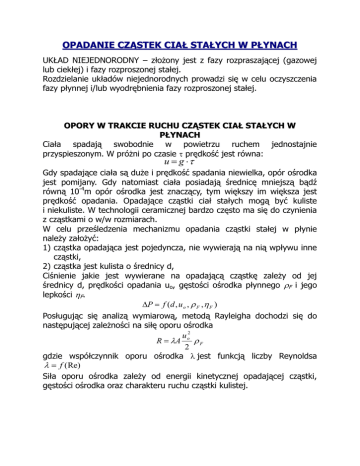 OPADANIE CZĄSTEK CIAŁ STAŁYCH W PŁYNACH UKŁAD NIEJEDNORODNY – złożony jest z fazy rozpraszającej (gazowej lub ciekłej) i fazy rozproszonej stałej. Rozdzielanie układów niejednorodnych prowadzi się w celu oczyszczenia fazy płynnej i/lub wyodrębnienia fazy rozproszonej stałej. OPORY W TRAKCIE RUCHU CZĄSTEK CIAŁ STAŁYCH W PŁYNACH Ciała spadają swobodnie w powietrzu ruchem jednostajnie przyspieszonym. W próżni po czasie prędkość jest równa: u g Gdy spadające ciała są duże i prędkość spadania niewielka, opór ośrodka jest pomijany. Gdy natomiast ciała posiadają średnicę mniejszą bądź równą 10-4m opór ośrodka jest znaczący, tym większy im większa jest prędkość opadania. Opadające cząstki ciał stałych mogą być kuliste i niekuliste. W technologii ceramicznej bardzo często ma się do czynienia z cząstkami o w/w rozmiarach. W celu prześledzenia mechanizmu opadania cząstki stałej w płynie należy założyć: 1) cząstka opadająca jest pojedyncza, nie wywierają na nią wpływu inne cząstki, 2) cząstka jest kulista o średnicy d, Ciśnienie jakie jest wywierane na opadającą cząstkę zależy od jej średnicy d, prędkości opadania uo, gęstości ośrodka płynnego F i jego lepkości F. P f (d , u o , F , F ) Posługując się analizą wymiarową, metodą Rayleigha dochodzi się do następującej zależności na siłę oporu ośrodka u o2 R A F 2 gdzie współczynnik oporu ośrodka jest funkcją liczby Reynoldsa f (Re) Siła oporu ośrodka zależy od energii kinetycznej opadającej cząstki, gęstości ośrodka oraz charakteru ruchu cząstki kulistej. Zależność współczynnika oporu ośrodka od liczby Reynoldsa wyznaczono doświadczalnie, gdy: 1. Liczba Reynoldsa zawiera się w granicach od 10-4 do 0,4 (2), jest to ruch uwarstwiony cząstki w płynie współczynnik oporu można przedstawić w postaci zależności 24 Re zatem siła oporu ośrodka wynosi R 3d F u o równanie Stokesa Z równania tego wynika, że siła oporu ośrodka jest wprost proporcjonalna do lepkości ośrodka, średnicy cząstki i prędkości opadania. 2. W zakresie liczby Reynoldsa od 0,4 do 103 współczynnik określony jest funkcją 18 ,5 Re 0, 6 natomiast siła oporu ośrodka R 2,3d 1, 4 F0, 6 u o F0, 4 równanie Allena 1,4 0,6 1,4 0,4 ( R 7, 26d F uo F ) Siła oporu ośrodka zależy od gęstości i lepkości płynu. 3. Dla ruchu burzliwego gdy 103<Re<2∙105 współczynnik oporu ośrodka jest wielkością stałą i wynosi 0,44. Zatem siła oporu ośrodka jest równa u o2 R 0,44 A F równanie Newtona 2 Siła oporu ośrodka zależy od kwadratu średnicy cząstki opadającej, od jej energii kinetycznej i od gęstości ośrodka płynnego. Dla cząstek niekulistych zamiast średnicy wprowadza się pojęcie średnicy zastępczej de. CZĄSTKI IZOMETRYCZNE (NIEKULISTE) f (Re, ) gdzie: współczynnik kształtu, sferyczność cząstki równa jest stosunkowi powierzchni kuli o tej samej objętości co ziarno do powierzchni ziarna, 1. Gdy Re<0,05 wówczas cząstki izometryczne opadają w płynie ruchem laminarnym wtedy Re podczas gdy 24 0,843 lg 0,065 2. Gdy 0,05<Re<2∙103 wówczas cząstki opadają w płynie ruchem przejściowym współczynnik oporu odczytuje się z tablic lub wykresów dla odpowiedniej liczby Reynoldsa i sferyczności cząstek niekulistych 3. Gdy Re zawiera się w granicach od 2∙103 do 2∙105 wówczas cząstki opadają w płynie ruchem burzliwym wtedy 5,31 4,87 OPADANIE GRAWITACYJNE NIEAKŁÓCONE Cząstka opada gdy prędkość opadania jest stała i wynosi uo. Ciężar cząstki F o średnicy d i gęstości S w ośrodku o gęstości F przy uwzględnieniu zasady Archimedesa wynosi: d3 F ( S F ) g 6 Stałość prędkości opadania zachodzi w przypadku równości sił ciężkości i oporu ośrodka. Po porównaniu odpowiednich równań prędkość opadania jest równa: 4dg ( S F ) uo 3 F Aby wyznaczyć prędkość opadania należy znać wartość współczynnika oporu ośrodka który jak wiadomo jest funkcją liczby Reynoldsa czyli zależy od rodzaju ruchu z jakim porusza się opadająca cząstka. Z kolei wartość liczby Reynoldsa jest zależna od prędkości opadania uo. Zatem bezpośrednie wykorzystanie powyższego równania jest niemożliwe. Aby wyznaczyć prędkość opadania uo z ogólnego równania na prędkość opadania wyznacza się współczynnik , który jest równy: 4dg S F 3uo2 F Mnożąc obie strony równania przez Re2 można wyeliminować nieznaną prędkość uo. Wszystkie wielkości po prawej stronie równania są znane zatem można wyznaczyć uo. W tym celu oblicza się Re2 a następnie korzysta z wykresu zależności Re2=f(Re) i odczytuje wartość Re1 dzięki której można wyznaczyć wartość uo. Podobnie można wyznaczyć średnicę cząstek d opadających w ośrodku o znanej gęstości i lepkości dynamicznej z prędkością opadania uo. W tym celu w równaniu na współczynnik , obie strony dzieli się przez Re. Na podstawie danych wyjściowych wyznacza się wartość prawej strony równania. Następnie posługując się wykresem =f(Re) sporządza się wykres pochodny /Re=f(Re). Następnie na osi rzędnych odkłada się wyznaczoną wartość 1/Re1 i odczytuje szukaną wartość liczby Reynoldsa Re1, która jest charakterystyczna dla znanej prędkości uo. Dzięki znajomości obu wartości można wyznaczyć szukaną wartość średnicy d. CZĄSTKI KULISTE 1. OPADANIE CZĄSTKI RUCHEM UWARSTWIONYM d 2 (S F ) g uo 18 F F2 d 1,93 3 założenia: Re=0,4 i =24/Re ( S F ) F g 2. OPADANIE CZĄSTKI RUCHEM PRZEJŚCIOWYM 0,153 d 1,14 g 0,71 ( S F )0,71 uo F0, 28 F0, 43 F2 F2 1,93 3 d 69 3 ( S F ) F g ( S F ) F g założenia: 0,4<Re<1000 i =18,5/Re0,6 3. OPADANIE CZĄSTEK RUCHEM BURZLIWYM dg ( S F ) uo 1, 74 F F2 d 69 założenia: Re=1000 i =0,44 g ( S F ) F 3 CZĄSTKI NIEKULISTE – IZOMETRYCZNE 1. OPADANIE CZĄSTKI RUCHEM UWARSTWIONYM K S de2 ( S F ) g uo 18F gdzie: K S 0,843 lg 0,065 sferyczność cząstek, równa stosunkowi powier