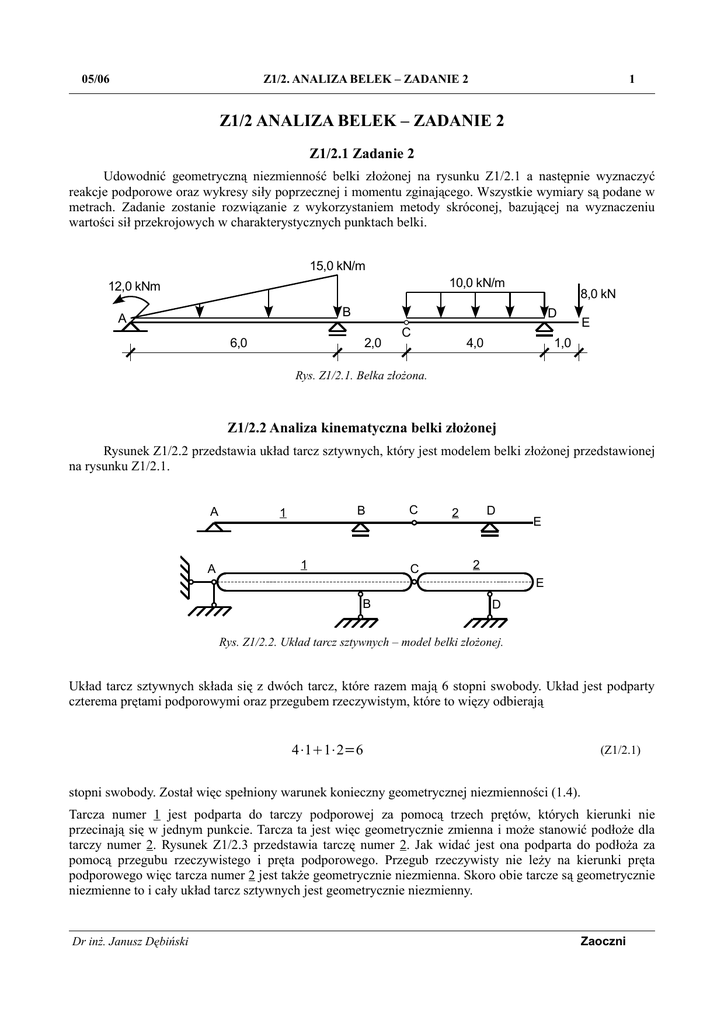05/06 Z1/2. ANALIZA BELEK – ZADANIE 2 1 Z1/2 ANALIZA BELEK – ZADANIE 2 Z1/2.1 Zadanie 2 Udowodnić geometryczną niezmienność belki złożonej na rysunku Z1/2.1 a następnie wyznaczyć reakcje podporowe oraz wykresy siły poprzecznej i momentu zginającego. Wszystkie wymiary są podane w metrach. Zadanie zostanie rozwiązanie z wykorzystaniem metody skróconej, bazującej na wyznaczeniu wartości sił przekrojowych w charakterystycznych punktach belki. 15,0 kN/m 10,0 kN/m 12,0 kNm 8,0 kN B A D 6,0 2,0 C 4,0 E 1,0 Rys. Z1/2.1. Belka złożona. Z1/2.2 Analiza kinematyczna belki złożonej Rysunek Z1/2.2 przedstawia układ tarcz sztywnych, który jest modelem belki złożonej przedstawionej na rysunku Z1/2.1. A A B 1 1 C C B D 2 E 2 E D Rys. Z1/2.2. Układ tarcz sztywnych – model belki złożonej. Układ tarcz sztywnych składa się z dwóch tarcz, które razem mają 6 stopni swobody. Układ jest podparty czterema prętami podporowymi oraz przegubem rzeczywistym, które to więzy odbierają 4⋅11⋅2=6 (Z1/2.1) stopni swobody. Został więc spełniony warunek konieczny geometrycznej niezmienności (1.4). Tarcza numer 1 jest podparta do tarczy podporowej za pomocą trzech prętów, których kierunki nie przecinają się w jednym punkcie. Tarcza ta jest więc geometrycznie zmienna i może stanowić podłoże dla tarczy numer 2. Rysunek Z1/2.3 przedstawia tarczę numer 2. Jak widać jest ona podparta do podłoża za pomocą przegubu rzeczywistego i pręta podporowego. Przegub rzeczywisty nie leży na kierunki pręta podporowego więc tarcza numer 2 jest także geometrycznie niezmienna. Skoro obie tarcze są geometrycznie niezmienne to i cały układ tarcz sztywnych jest geometrycznie niezmienny. Dr inż. Janusz Dębiński Zaoczni 05/06 Z1/2. ANALIZA BELEK – ZADANIE 2 C 2 2 E D Rys. Z1/2.3. Tarcza numer 2. Z1/2.3 Wyznaczenie reakcji podporowych Rysunek Z1/2.4 przedstawia podział belki złożonej na belki proste wraz z założonymi zwrotami reakcji podporowych. 10,0 kN/m 15,0 kN/m HC HA 6,0 VD HC 1 VA E 2 C B A D C VC 12,0 kNm 8,0 kN VB 2,0 VC 4,0 1,0 Rys. Z1/2.4. Założone zwroty reakcji podporowych. Całe obciążenie czynne jest prostopadłe do osi belki więc poziome reakcje H C oraz HA są równe zero. Reakcję VD możemy wyznaczyć z warunku M C2 =0 1 −V D⋅4,08,0⋅5,010,0⋅4,0⋅ ⋅4,0=0 2 V D=30,0kN . (Z1/2.2) Reakcja ma więc zwrot zgodny z założonym. Reakcję VC możemy wyznaczyć z warunku M 2D =0 1 V C⋅4,08,0⋅1,0−10,0⋅4,0⋅ ⋅4,0=0 2 V C =18,0kN . (Z1/2.3) Reakcja ma więc zwrot zgodny z założonym. Dr inż. Janusz Dębiński Zaoczni 05/06 Z1/2. ANALIZA BELEK – ZADANIE 2 3 W celu sprawdzenia obliczeń zastosujemy warunek równowagi 2 Y =0 . V C V D−8,0−10,0⋅4,0=30,018,0−10⋅4,0−8,0=0 (Z1/2.4) Reakcje działające na belkę numer 2 znajdują się więc w równowadze. Rysunek Z1/2.5 przedstawia belkę numer 2 w równowadze. 10,0 kN/m 8,0 kN D C 2 18,0 kN E 30,0 kN 4,0 1,0 Rys. Z1/2.5. Belka numer 2 w równowadze. Reakcję VB możemy wyznaczyć z warunku M A1=0 1 2 −V B⋅6,0V C⋅8,0−12,0 ⋅15,0⋅6,0⋅ ⋅6,0=0 2 3 V B=52,0kN . (Z1/2.5) Reakcja ma więc zwrot zgodny z założonym. Reakcję VA możemy wyznaczyć z warunku M 1 B =0 1 1 V A⋅6,0V C⋅2,0−12,0− ⋅15,0⋅6,0⋅ ⋅6,0=0 2 3 V B=11,0kN . (Z1/2.6) Reakcja ma więc zwrot zgodny z założonym. W celu sprawdzenia obliczeń zastosujemy warunek równowagi Y 1=0 1 1 V AV B−V C − ⋅15,0⋅6,0=11,052,0−18,0− ⋅15,0⋅6,0=0 2 2 Dr inż. Janusz Dębiński . (Z1/2.7) Zaoczni 05/06 Z1/2. ANALIZA BELEK – ZADANIE 2 4 Reakcje działające na belkę numer 1 znajdują się więc w równowadze. Rysunek Z1/2.6 przedstawia belkę numer 1 w równowadze. 15,0 kN/m 12,0 kNm C B A 1 11,0 kN 52,0 kN 6,0 2,0 Rys. Z1/2.6. Belka numer 1 w równowadze. Rysunek Z1/2.7 przedstawia całą belkę złożoną w równowadze. 15,0 kN/m 12,0 kNm 10,0 kN/m B A 8,0 kN D C 11,0 kN 6,0 52,0 kN E 30,0 kN 2,0 4,0 1,0 Rys. Z1/2.7. Cała belka złożona w równowadze. Z1/2.4 Wykres siły poprzecznej w belce Wykres siły poprzecznej zaczynamy rysować od lewego końca belki. Indeks górny L oznacza siłę poprzeczną z lewej strony natomiast indeks górny P oznacza siłę poprzeczną z prawej strony. W punkcie A działa siła skupiona o wartości 11,0 kN w górę czyli wartość siły poprzecznej wynosi T PA =11,0 kN . (Z1/2.8) W przedziale AB działa obciążenie trójkątne czyli wykres siły poprzecznej jest parabolą. Wartość siły poprzecznej z lewej strony podpory B wynosi 1 T LB=11,0− ⋅15,0⋅6,0=−34,0 kN . 2 (Z1/2.9) Zgodnie z (1.65) miejsce zerowe wykresu siły poprzecznej znajduje się od punktu A w odległości Dr inż. Janusz Dębiński Zaoczni 05/06 Z1/2. ANALIZA BELEK – ZADANIE 2 x 0= 5 2⋅11,0⋅6,0 =2,966 m . 15,0 (Z1/2.10) Ponieważ obciążenie trójkątne ma wartość zero w punkcie A to wykres siły poprzecznej będzie miał ekstremum w tym punkcie. Rysunek Z1/2.8 przedstawia wykres siły poprzecznej w przedziale AB. 15,0 kN/m 10,0 kN/m 12,0 kNm B A 8,0 kN D C 11,0 kN 6,0 E 30,0 kN 52,0 kN 2,0 4,0 1,0 +11,0 -34,0 T(x) [kN] 2,966 3,034 Rys. Z1/2.8. Wykres siły poprzecznej w przedziale AB. W punkcie B działa siła skupiona o wartości 52,0 kN w górę więc siłą poprzeczna z prawej strony podpory B wynosi T PB =−34,052,0=18,0 kN . (Z1/2.11) W przedziale BC nie działa obciążenie ciągłe więc siła poprzeczna ma wartość stałą czyli T CL =T BP=18,0 kN . (Z1/2.12) Rysunek Z1/2.9 przedstawia wykres siły poprzecznej w przedziale BC. W przegubie C siła poprzeczna jak wiadomo nie zmienia swojej wartości czyli T CL =T CP=18,0 kN . Dr inż. Janusz Dębiński (Z1/2.13) Zaoczni 05/06 Z1/2. ANALIZA BELEK – ZADANIE 2 6 15,0 kN/m 10,0 kN/m 12,0 kNm B A 8,0 kN D C 11,0 kN 6,0 E 30,0 kN 52,0 kN 2,0 4,0 1,0 +18,0 +11,0 -34,0 T(x) [kN] 2,966 3,034 Rys. Z1/2.9. Wykres siły poprzecznej w przedziale BC. W przedziale BC działa obciążenie ciągłe równomiernie rozłożone w